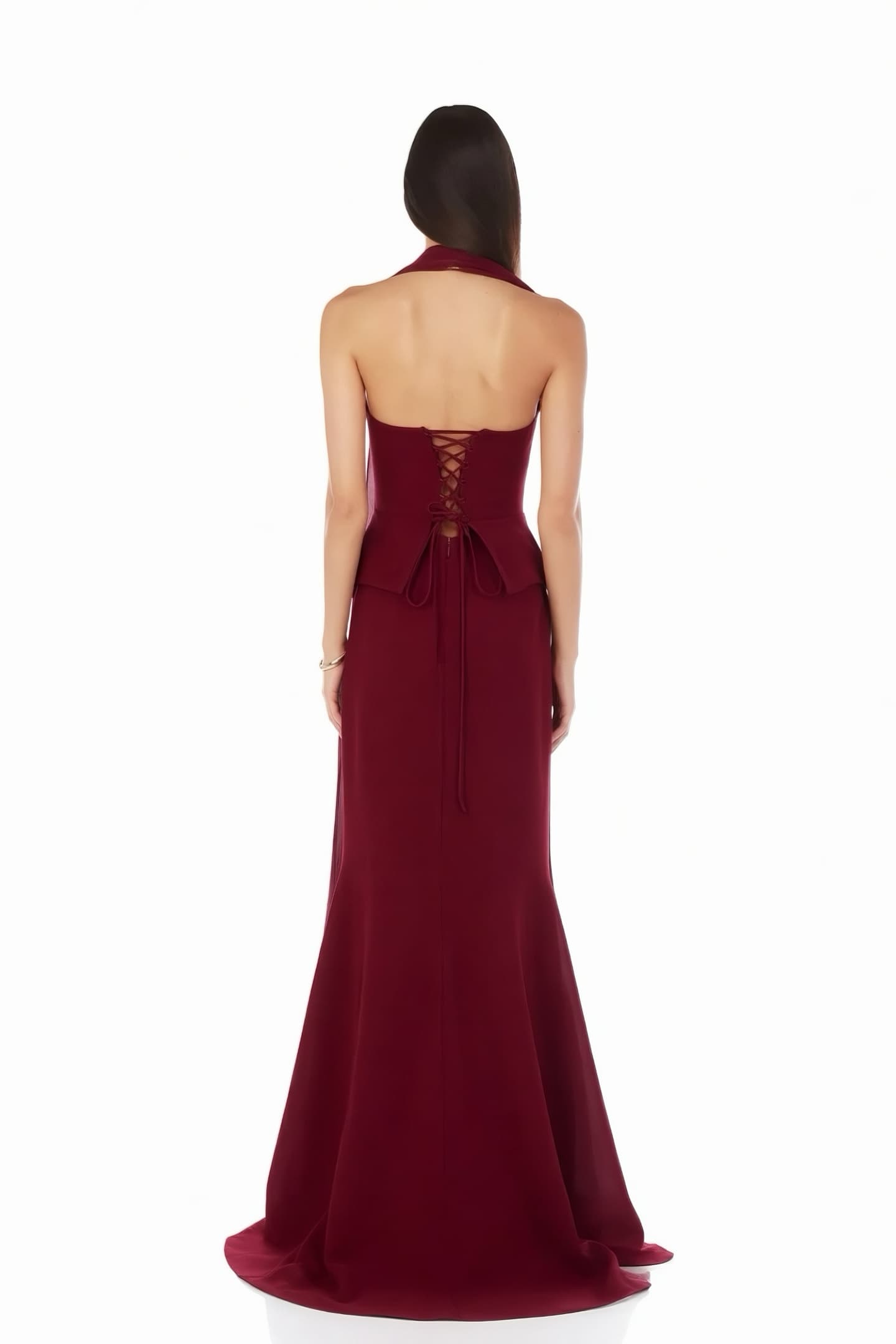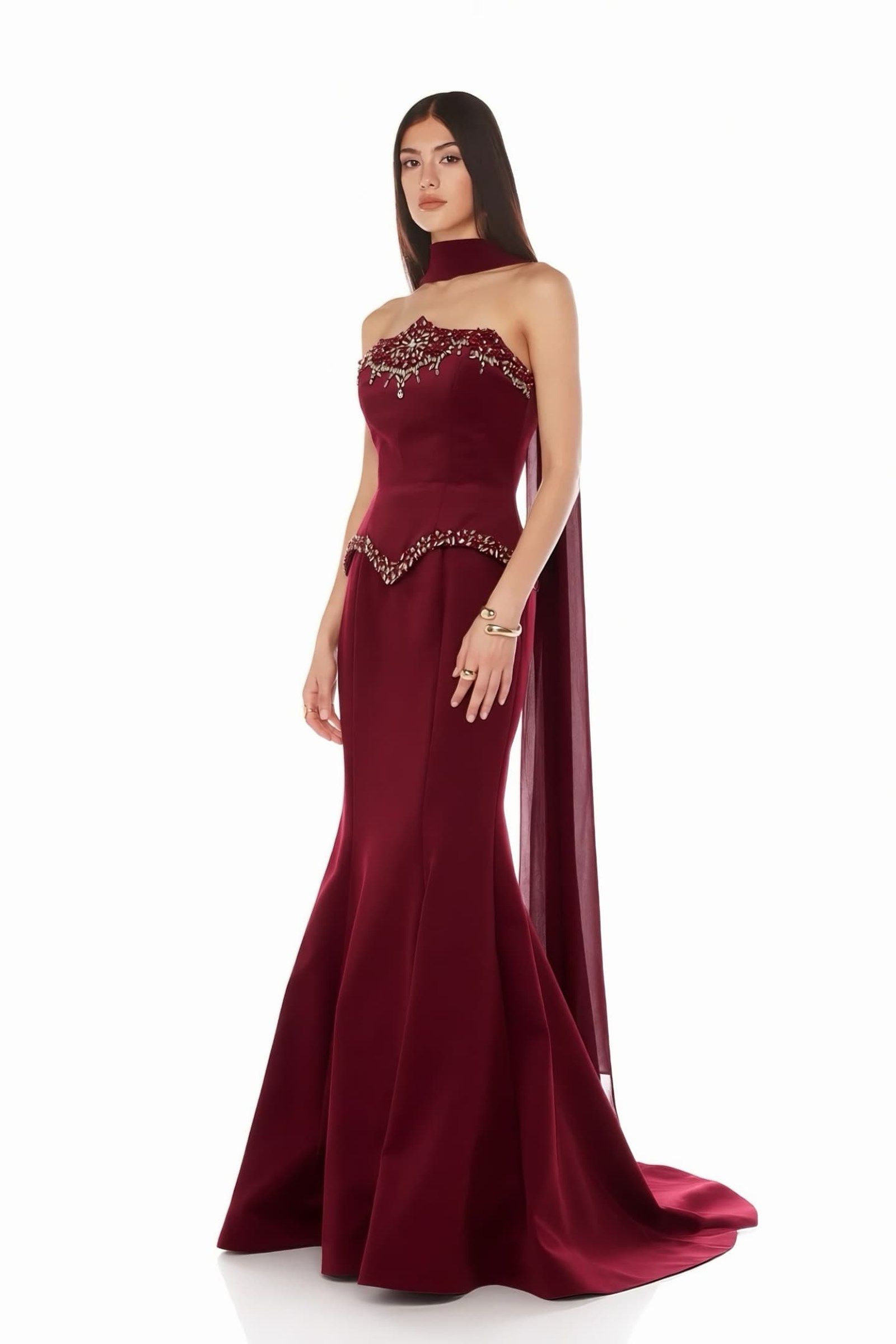 • Bordo Balık Kesim Taş İşlemeli Abiye Elbise
