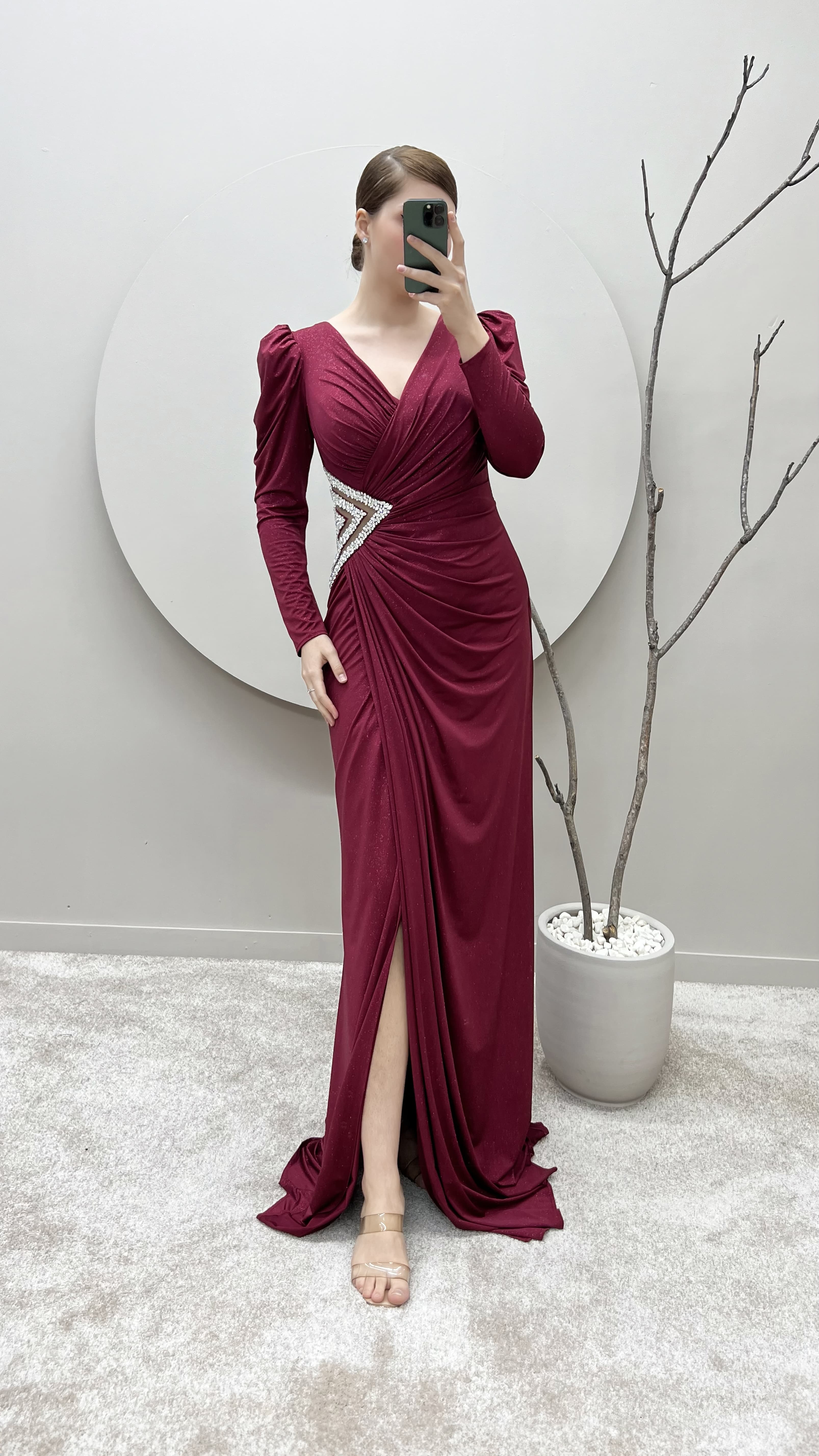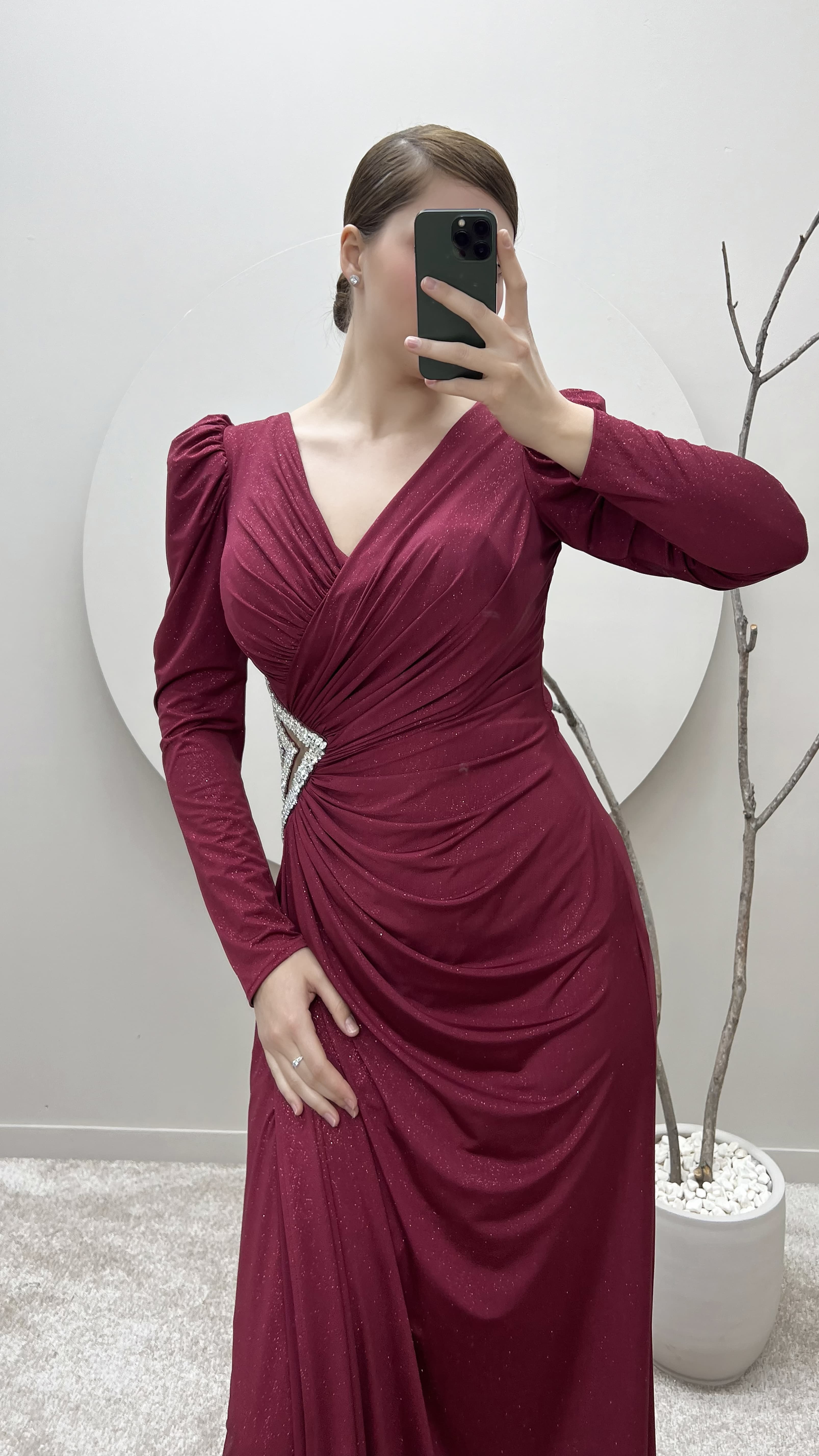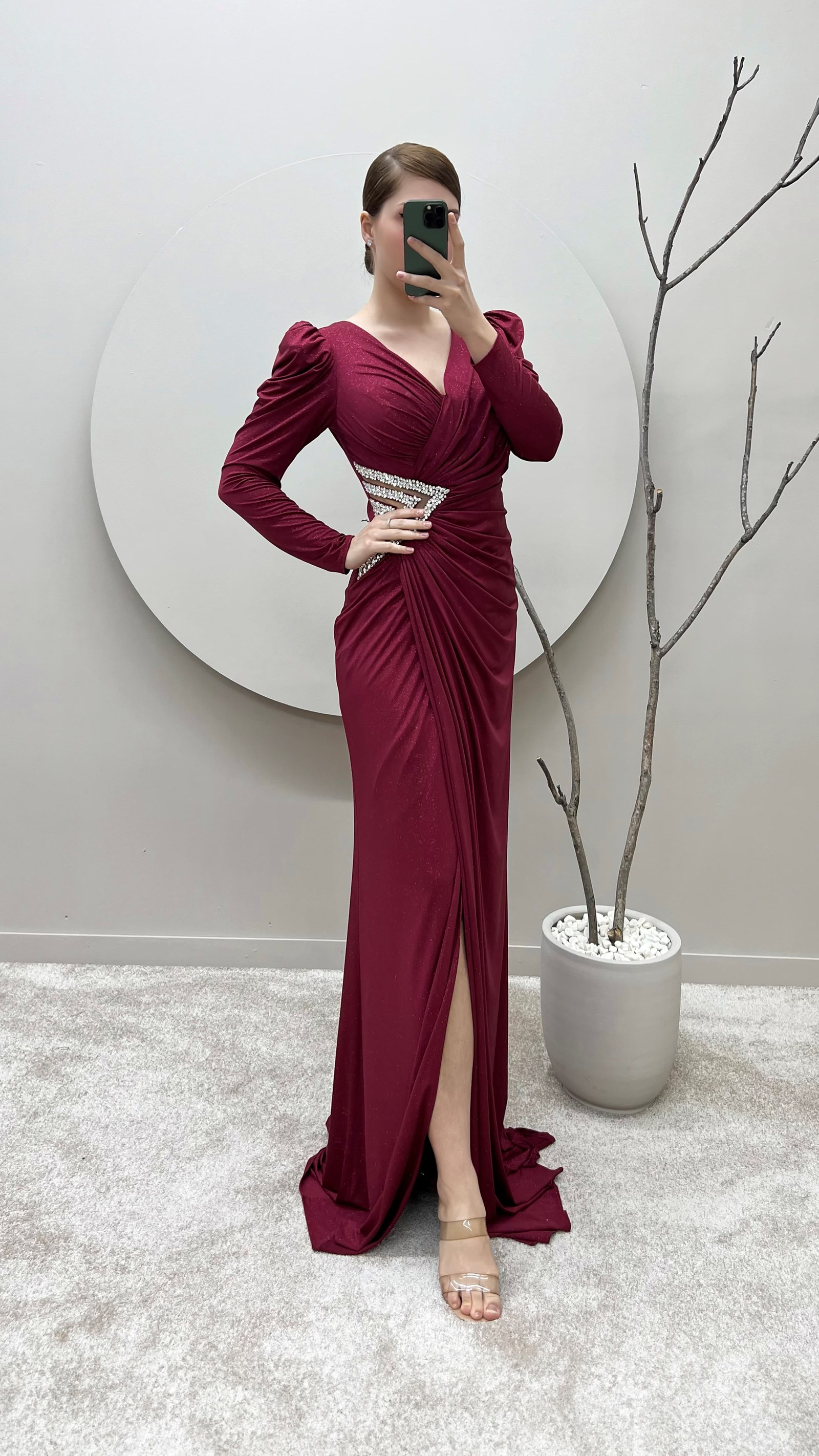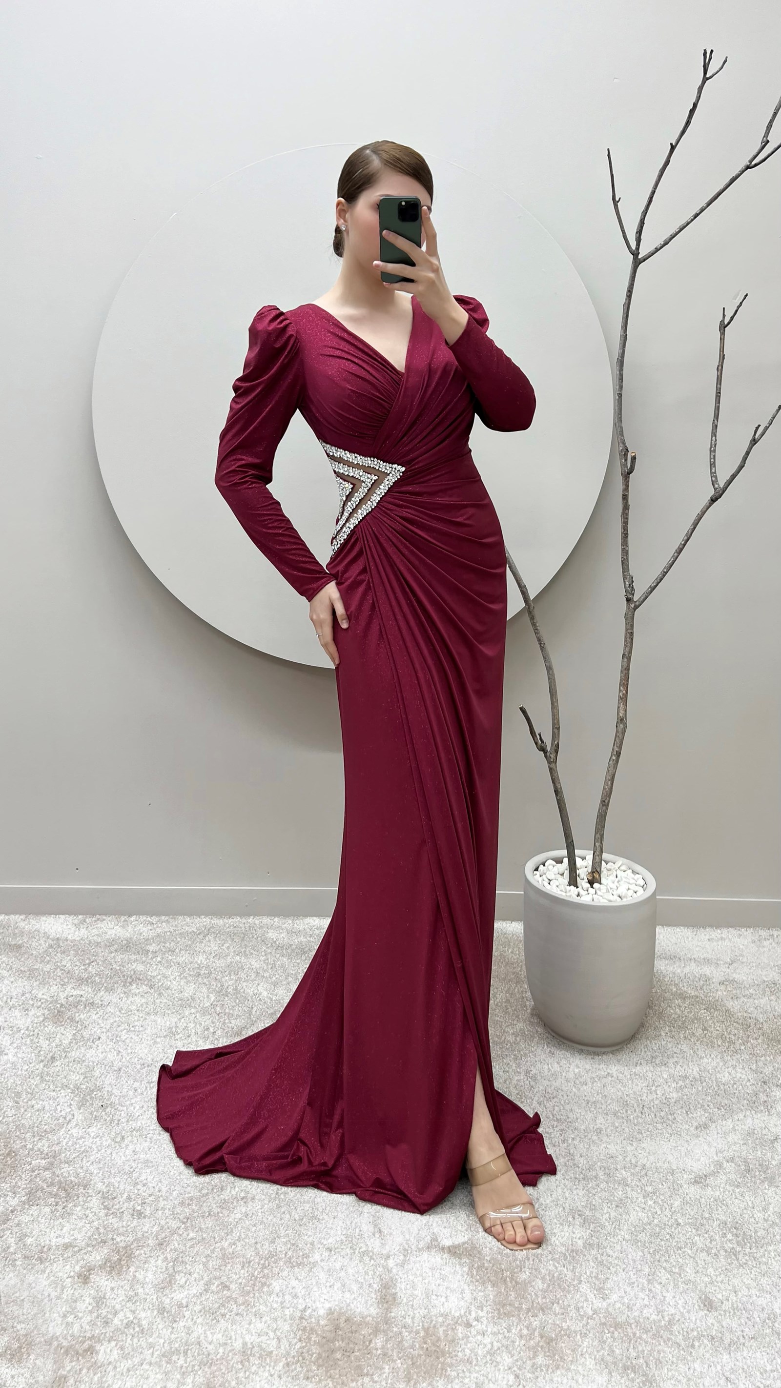 Bordo Balon Kol Kruvaze Yaka Beli Taşlı Tasarım Büyük Beden Saten Abiye Elbise