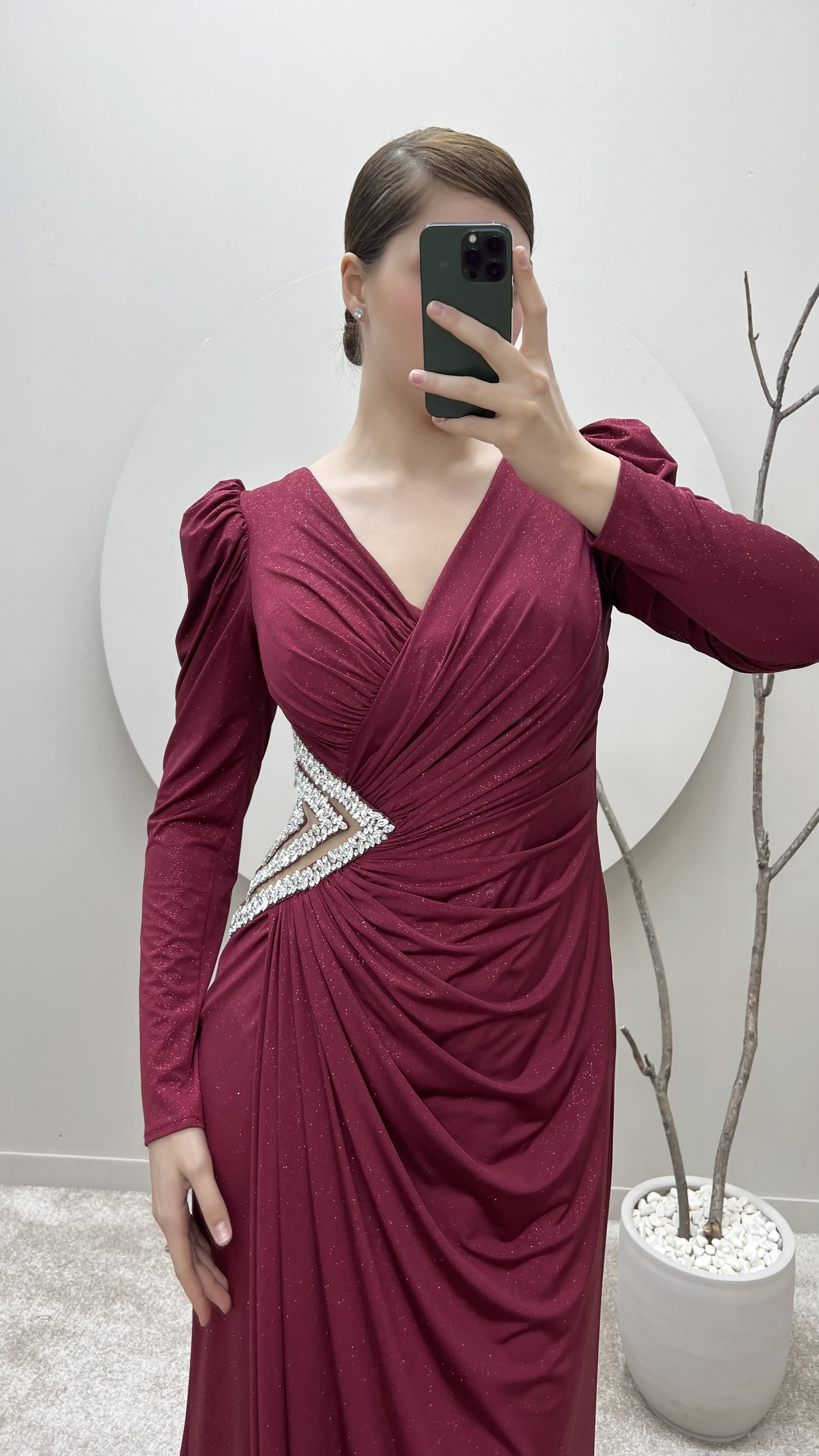 • Bordo Balon Kol Kruvaze Yaka Beli Taşlı Tasarım Büyük Beden Saten Abiye Elbise