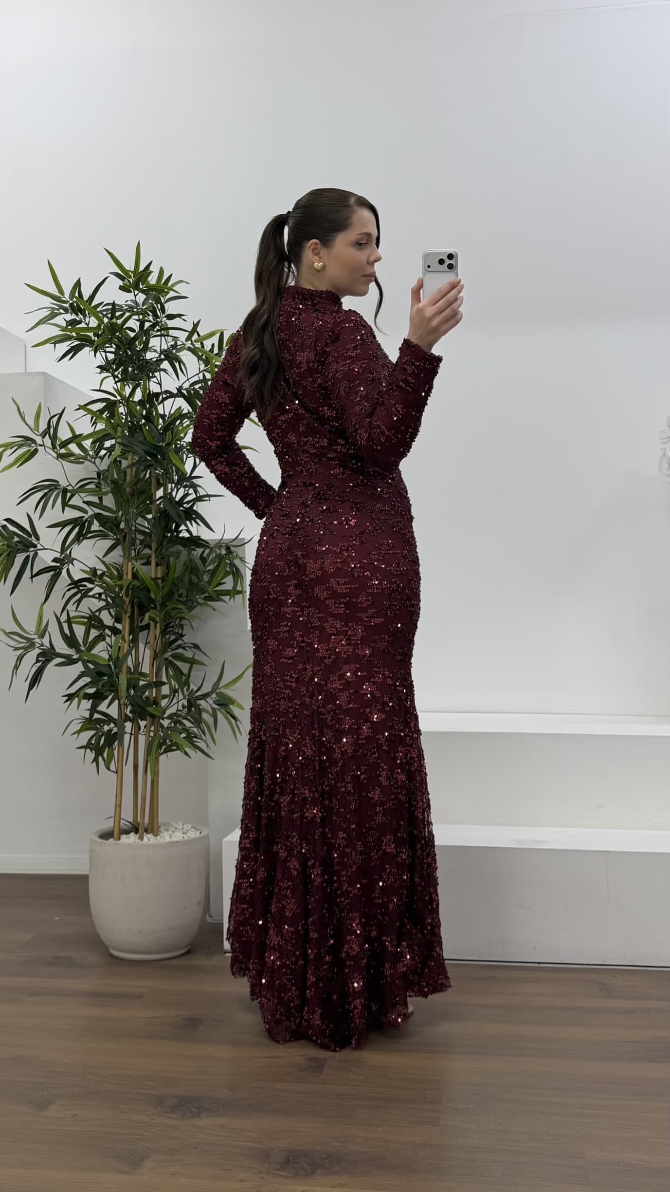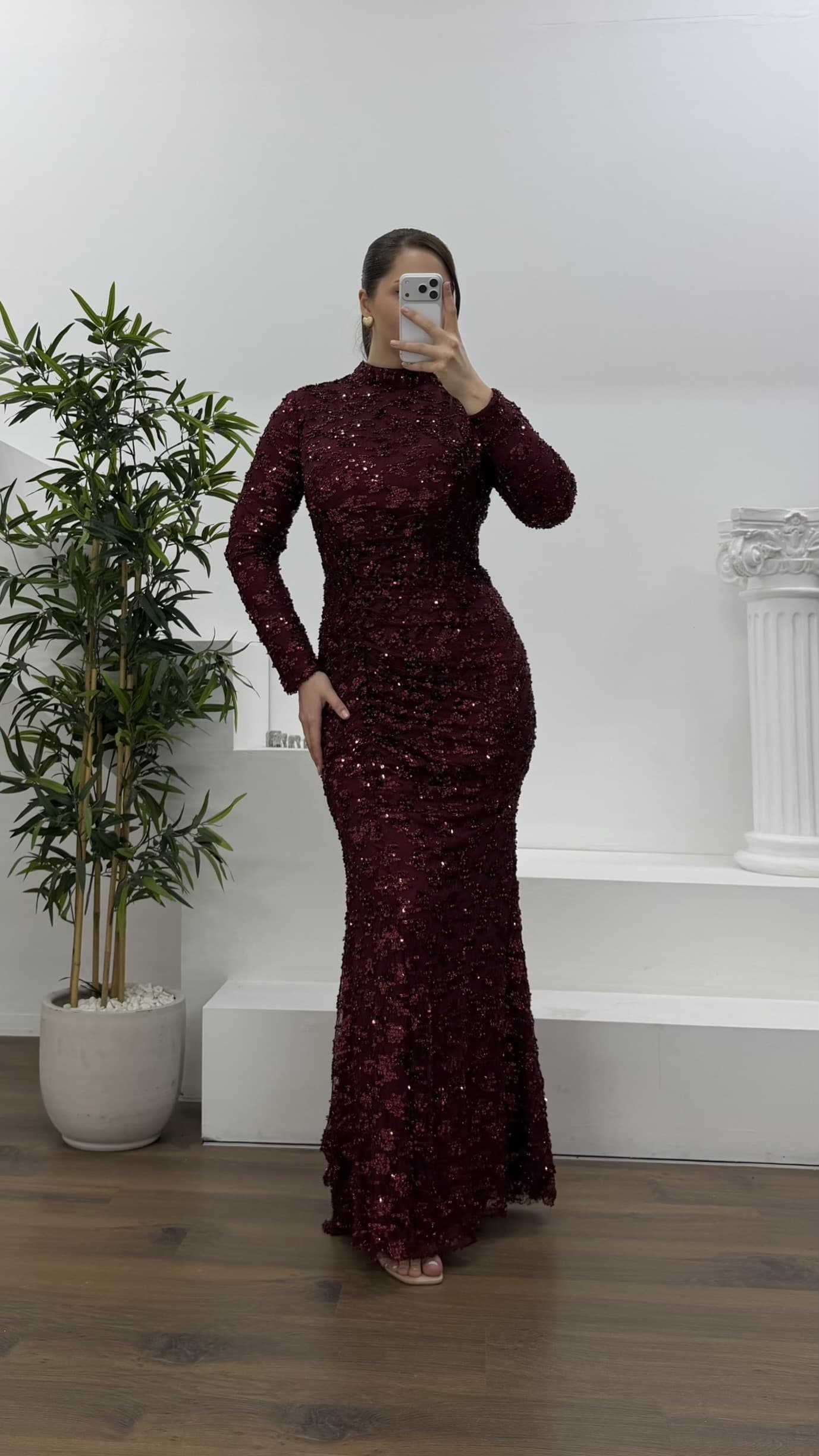 • Bordo Beli Drapeli Pul Payet Büyük Beden Abiye Elbise
