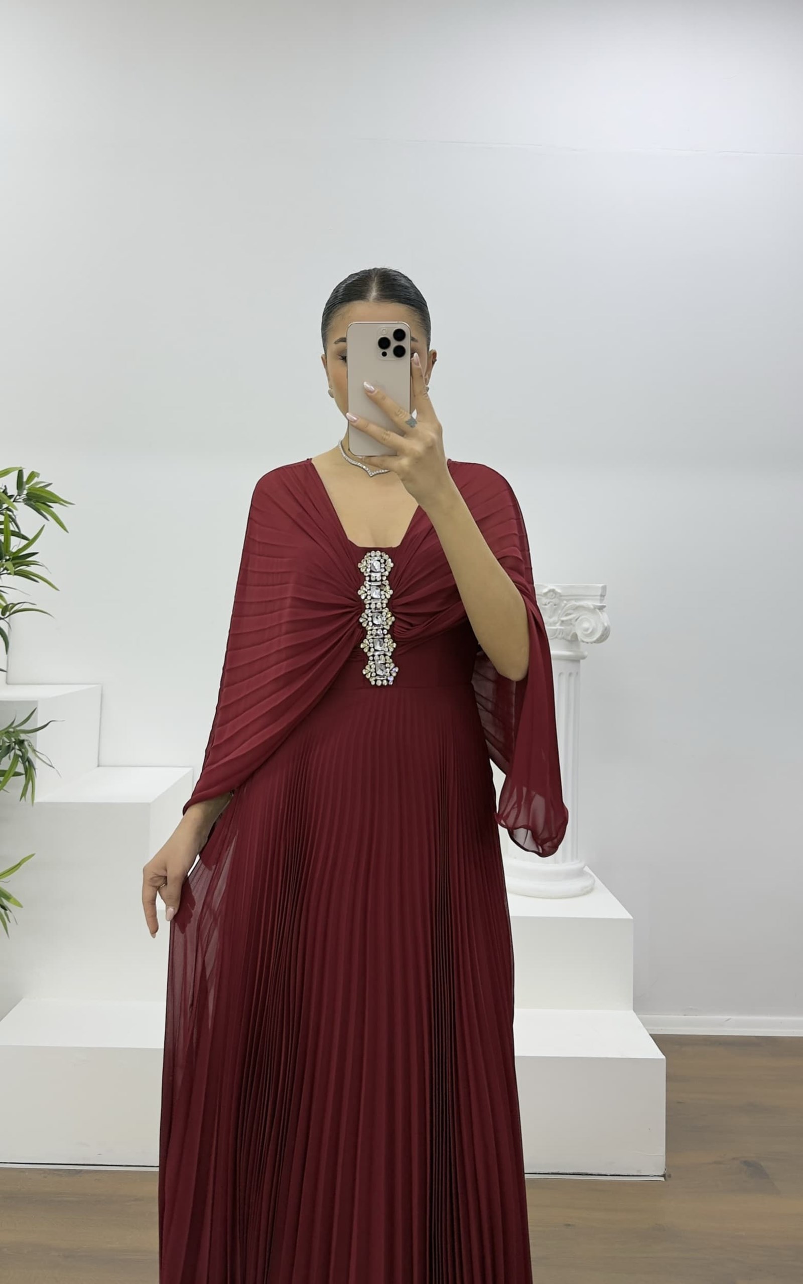 • Bordo Broş Detaylı Melek Kanadı Şifon Abiye Elbise