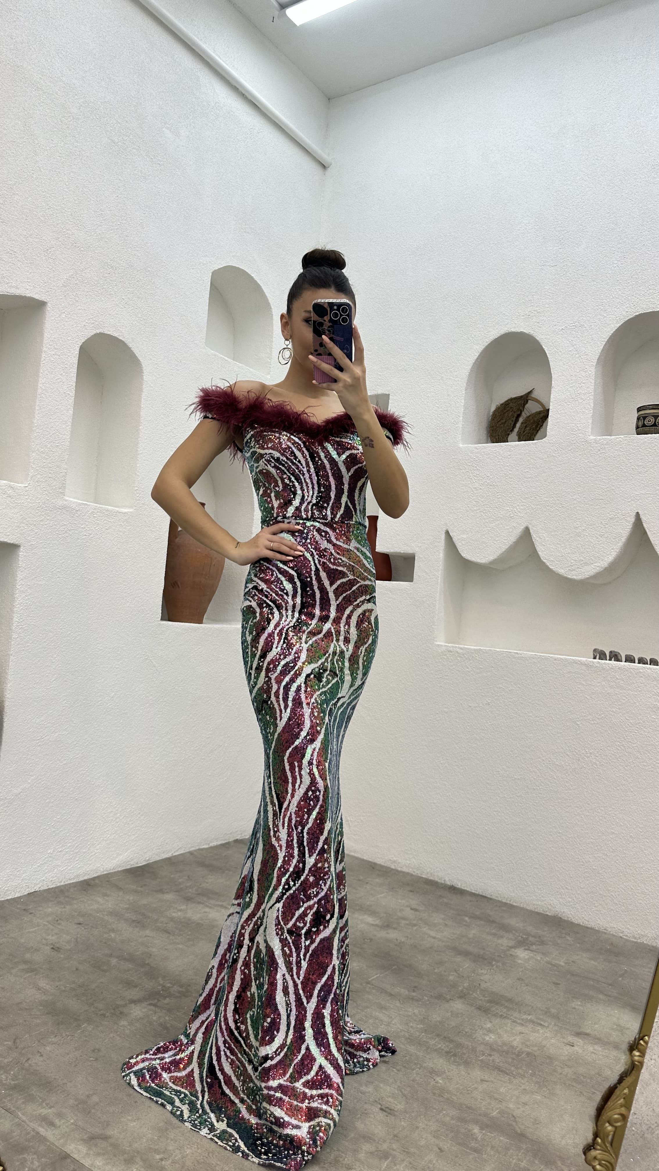 Bordo Göğsü Peluş Detay Desenli Pul Payet Abiye Elbise