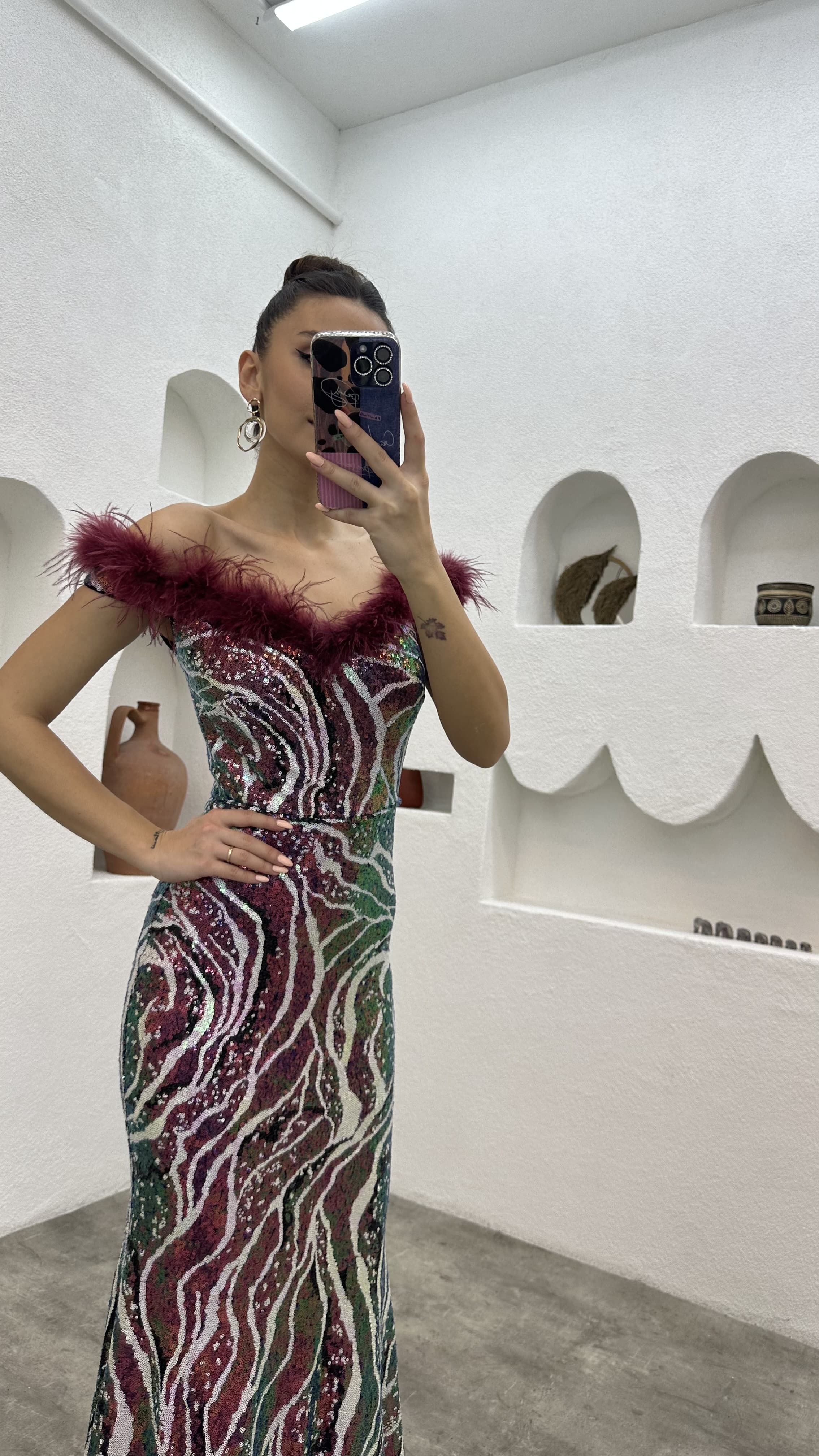 • Bordo Göğsü Peluş Detay Desenli Pul Payet Abiye Elbise