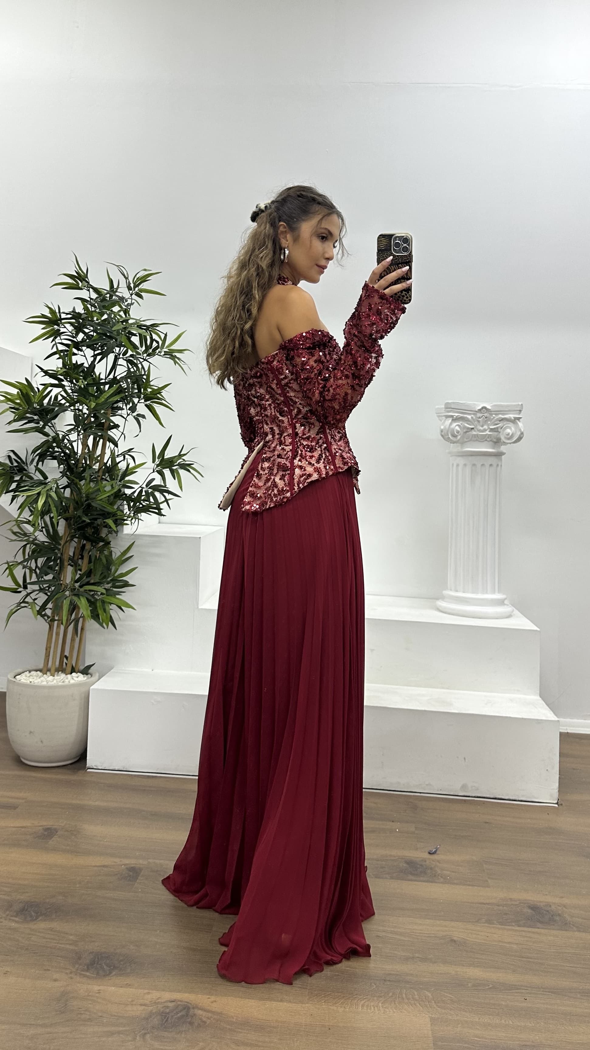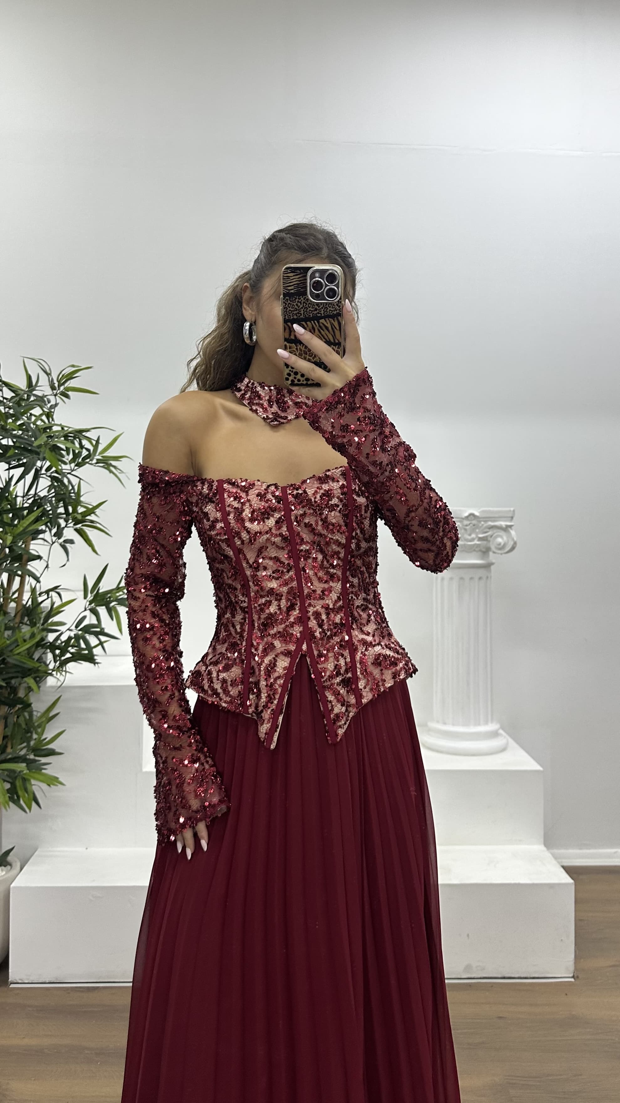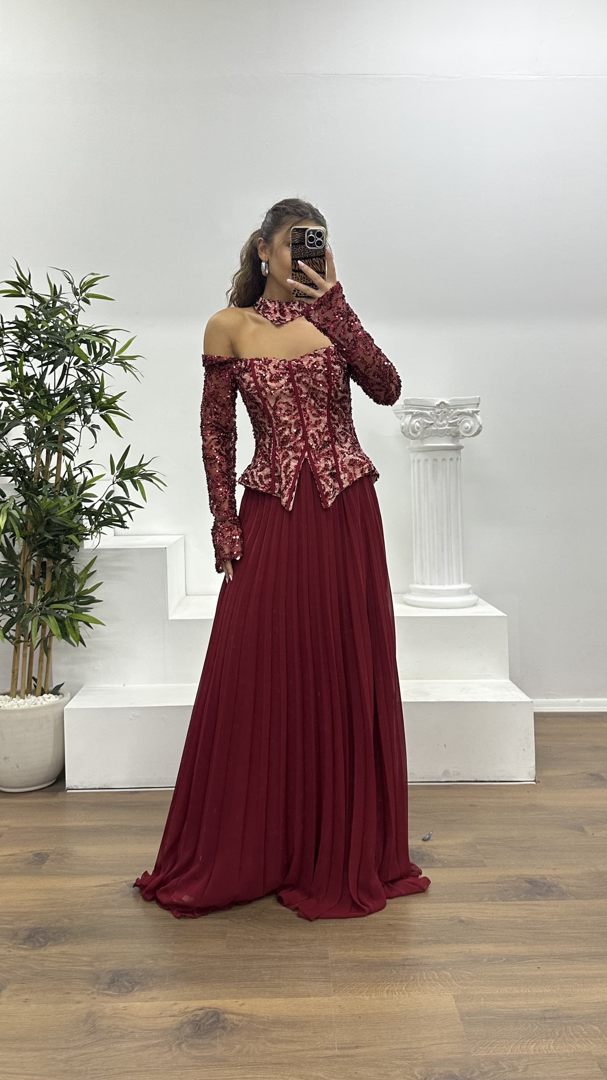 Ürün 36-42 bedene kadar uyumlu, göğüs pedli, astarlı, fermuarlı, boyun detay, işlemeli abiye olarak tasarlanmıştır.