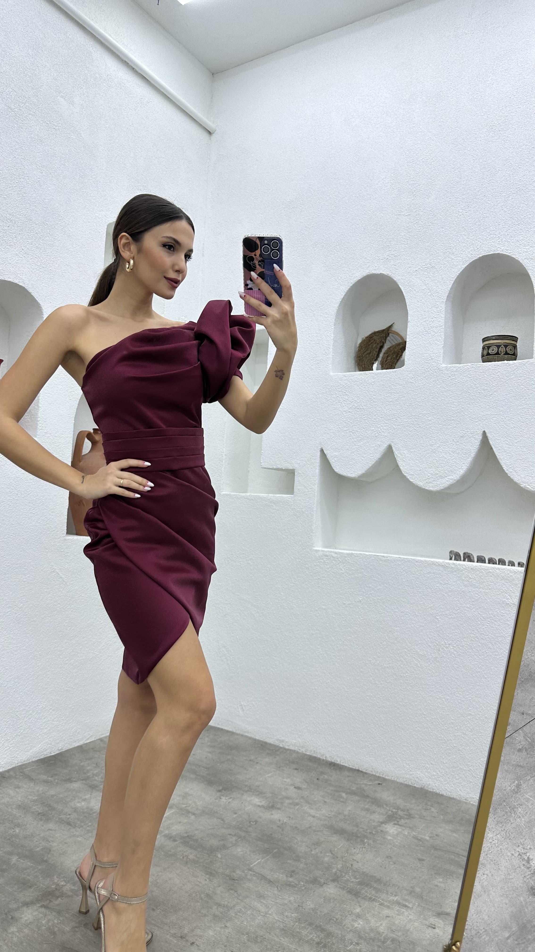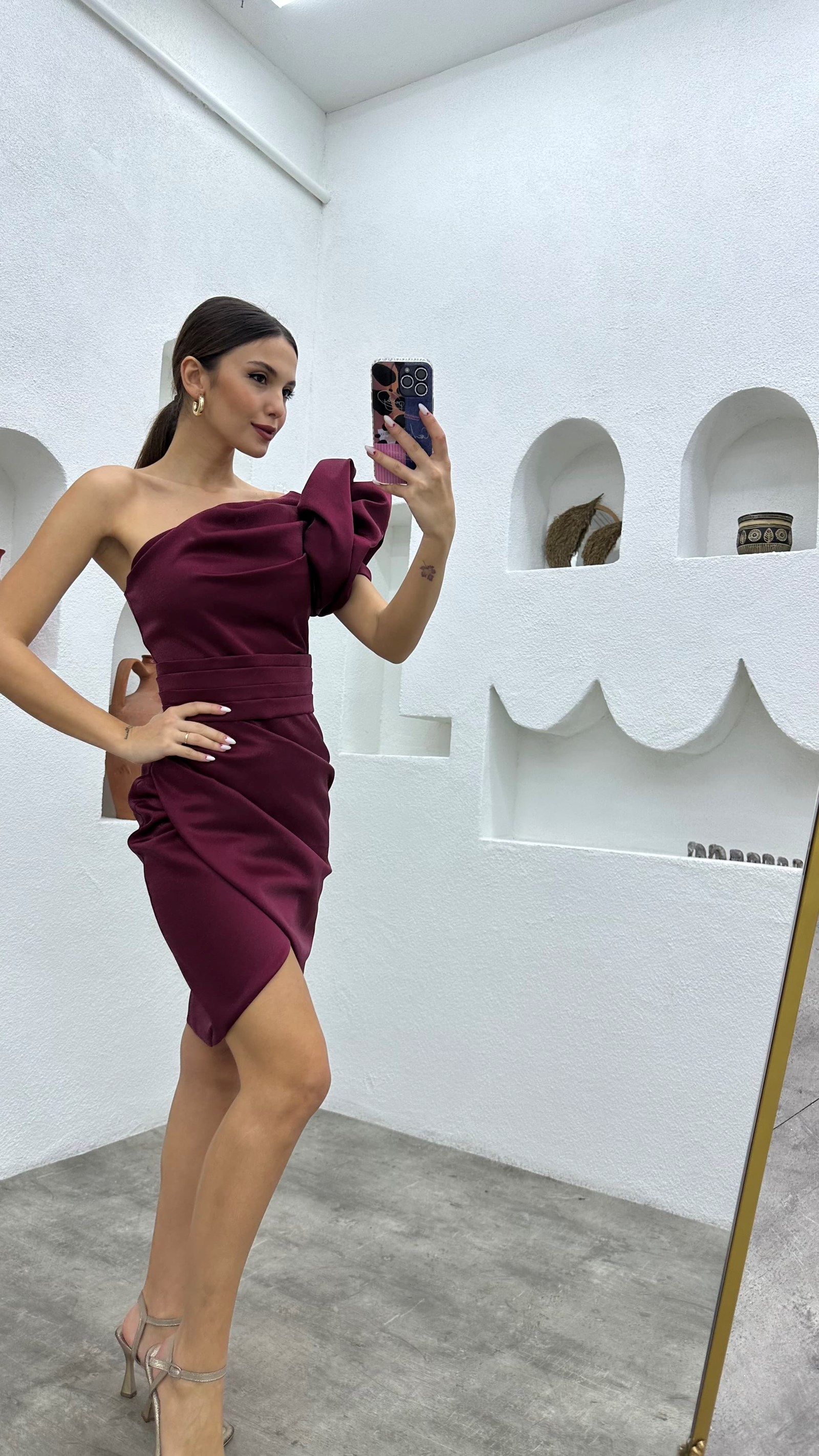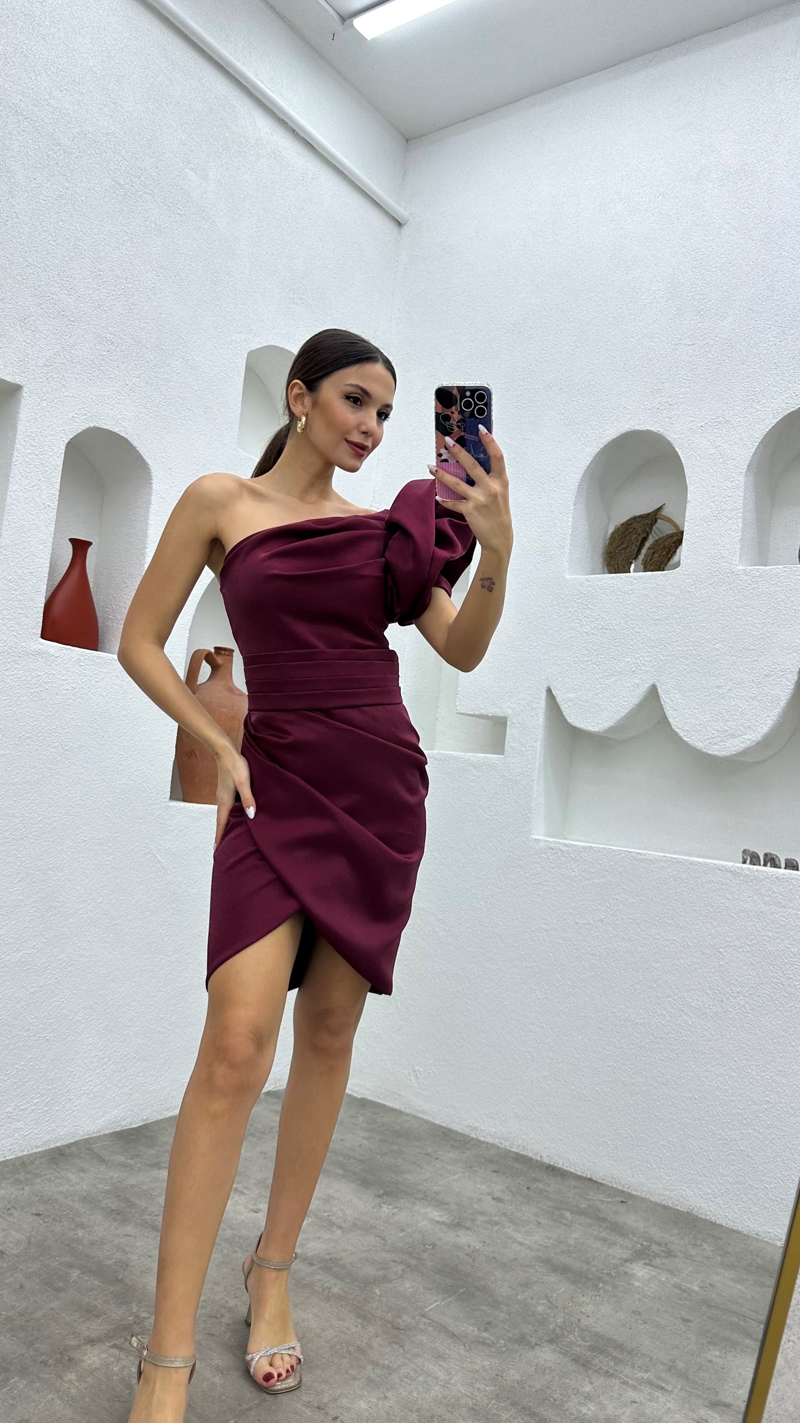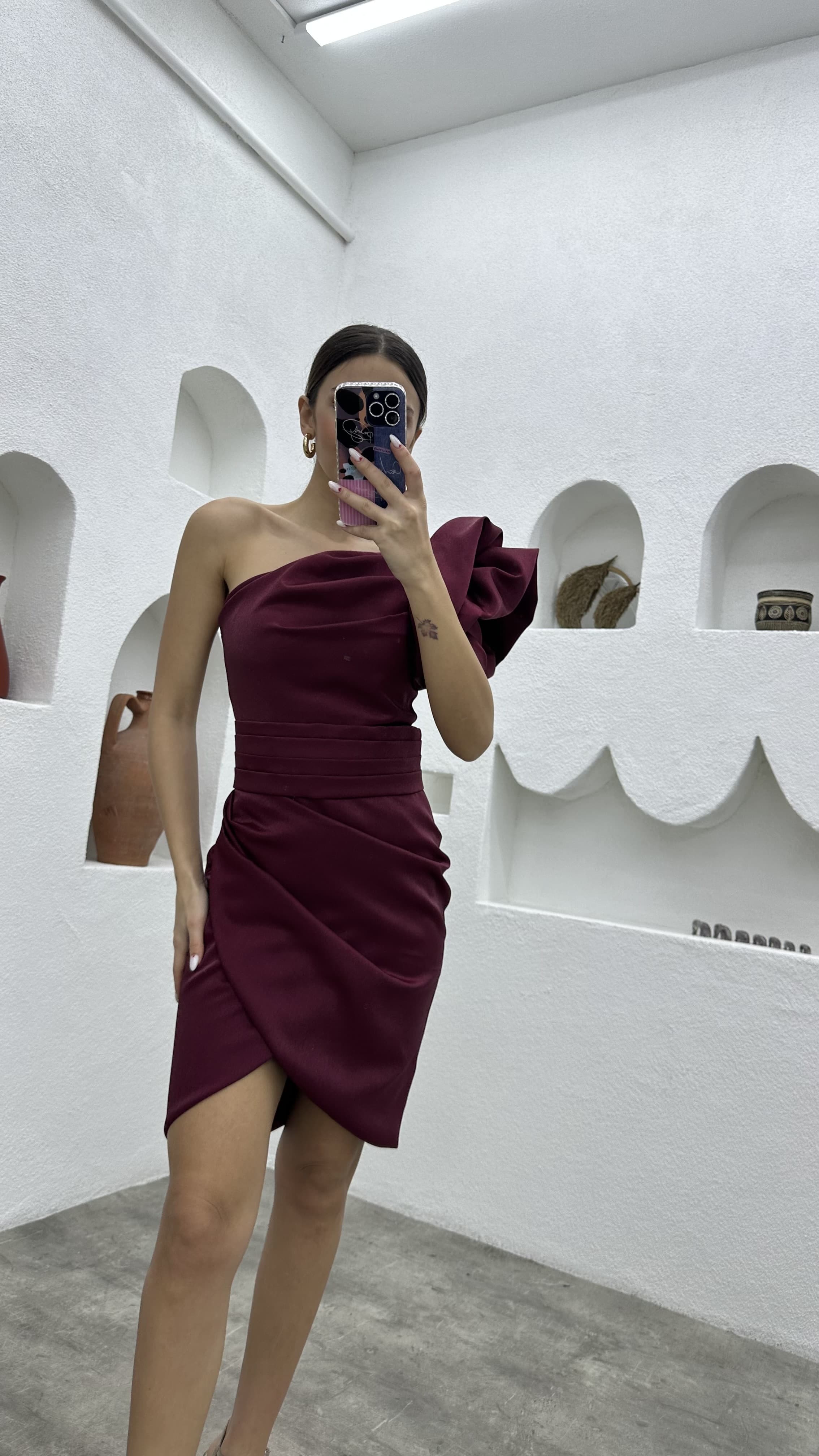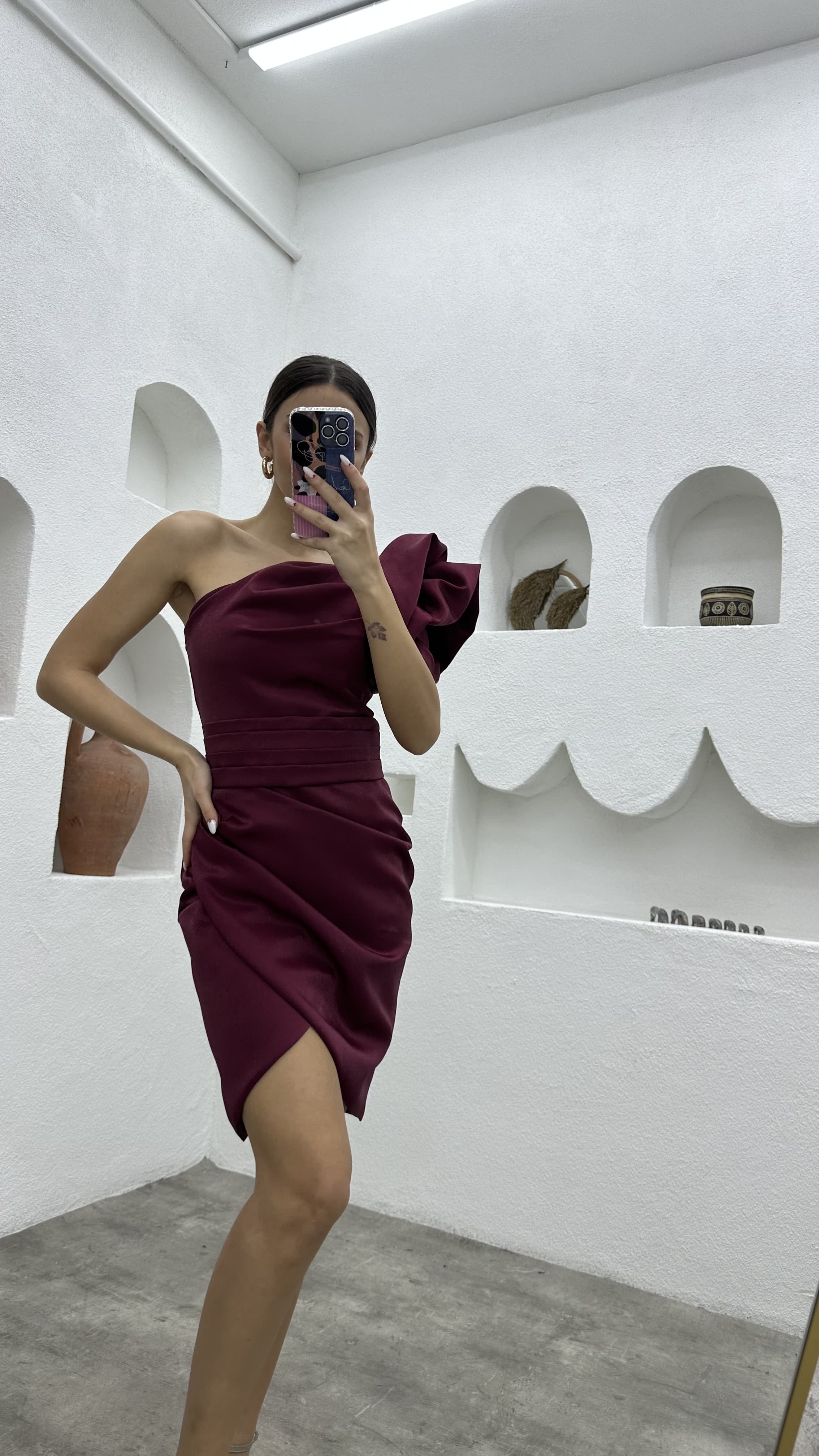 • Bordo Kolu Volanlı Tek Omuz Abiye Elbise