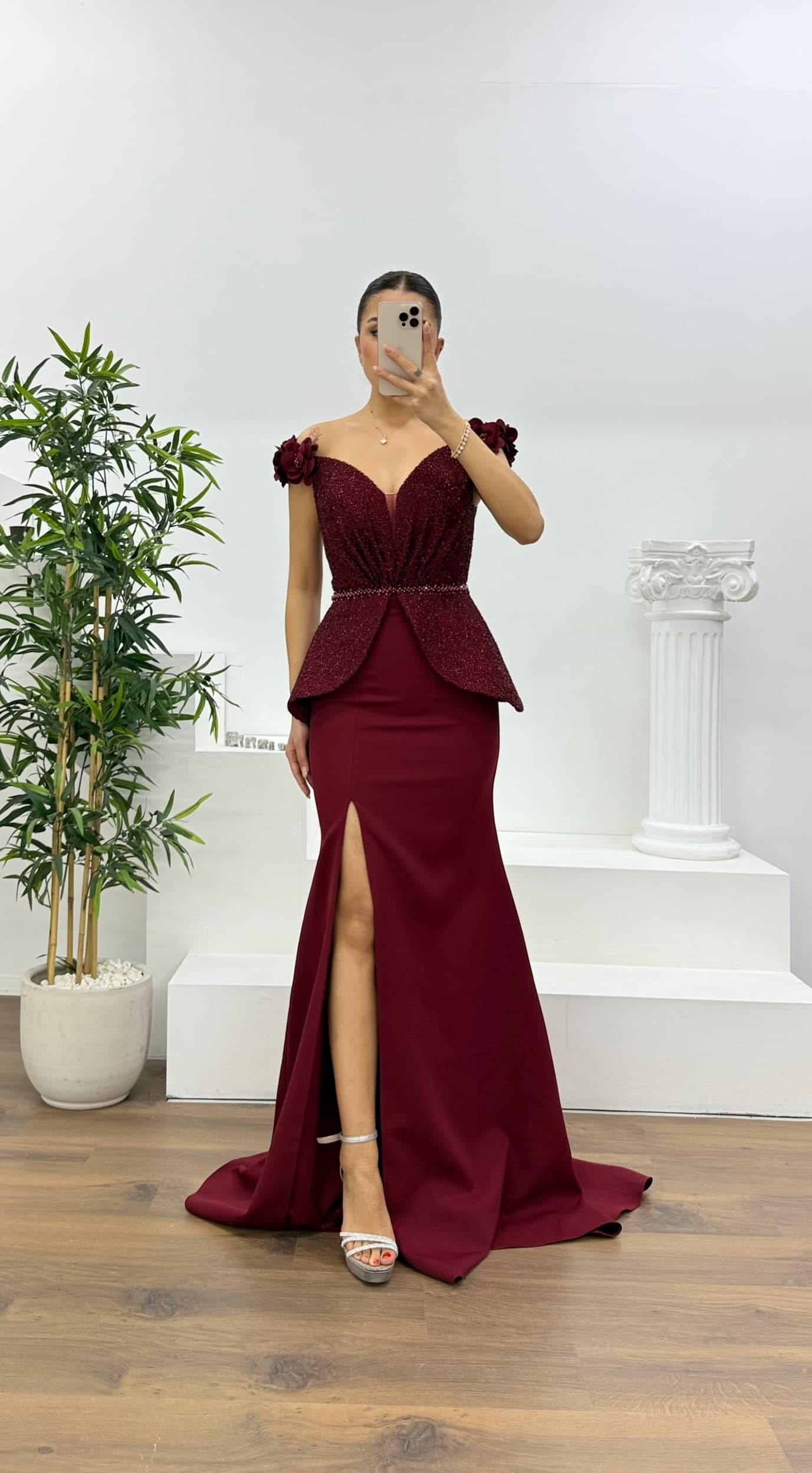 • Bordo Simli Çiçek Askılı Peplum Kesim Uzun Abiye Elbise