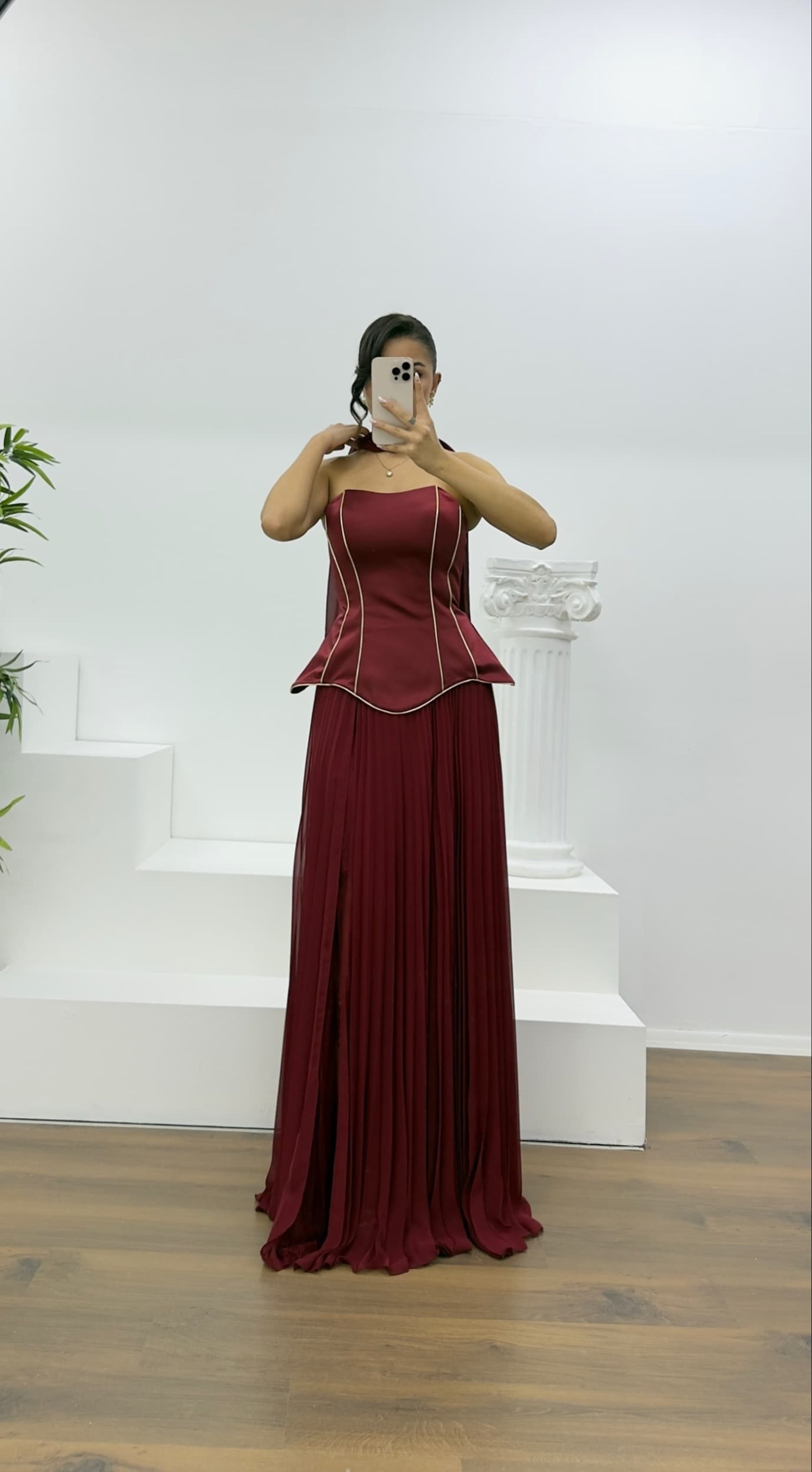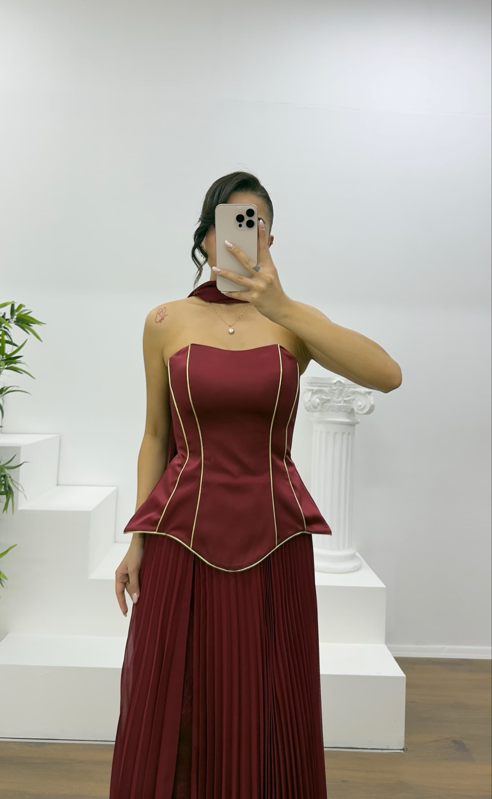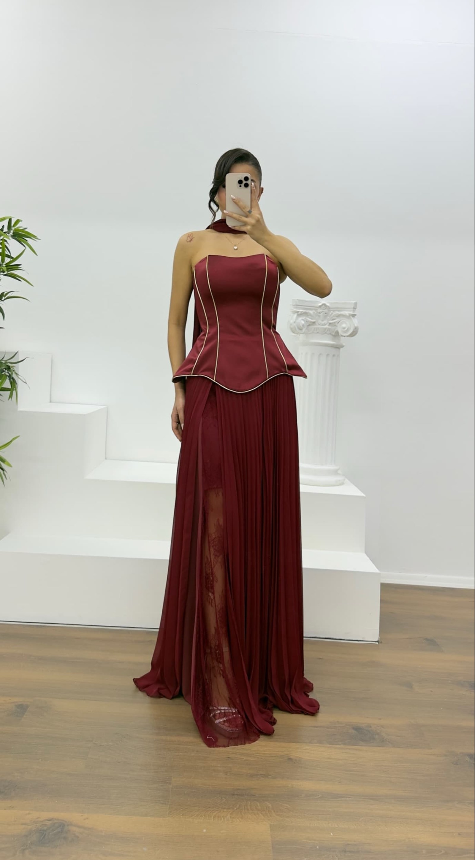 • Zümrüt Straplez Piliseli Abiye Elbise