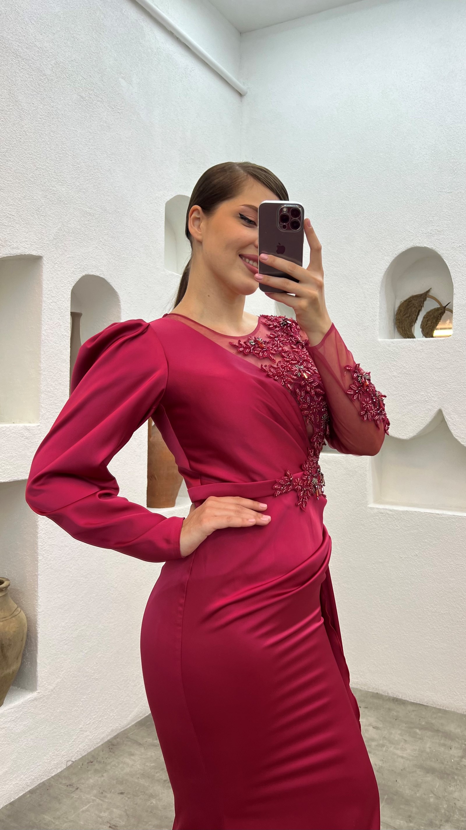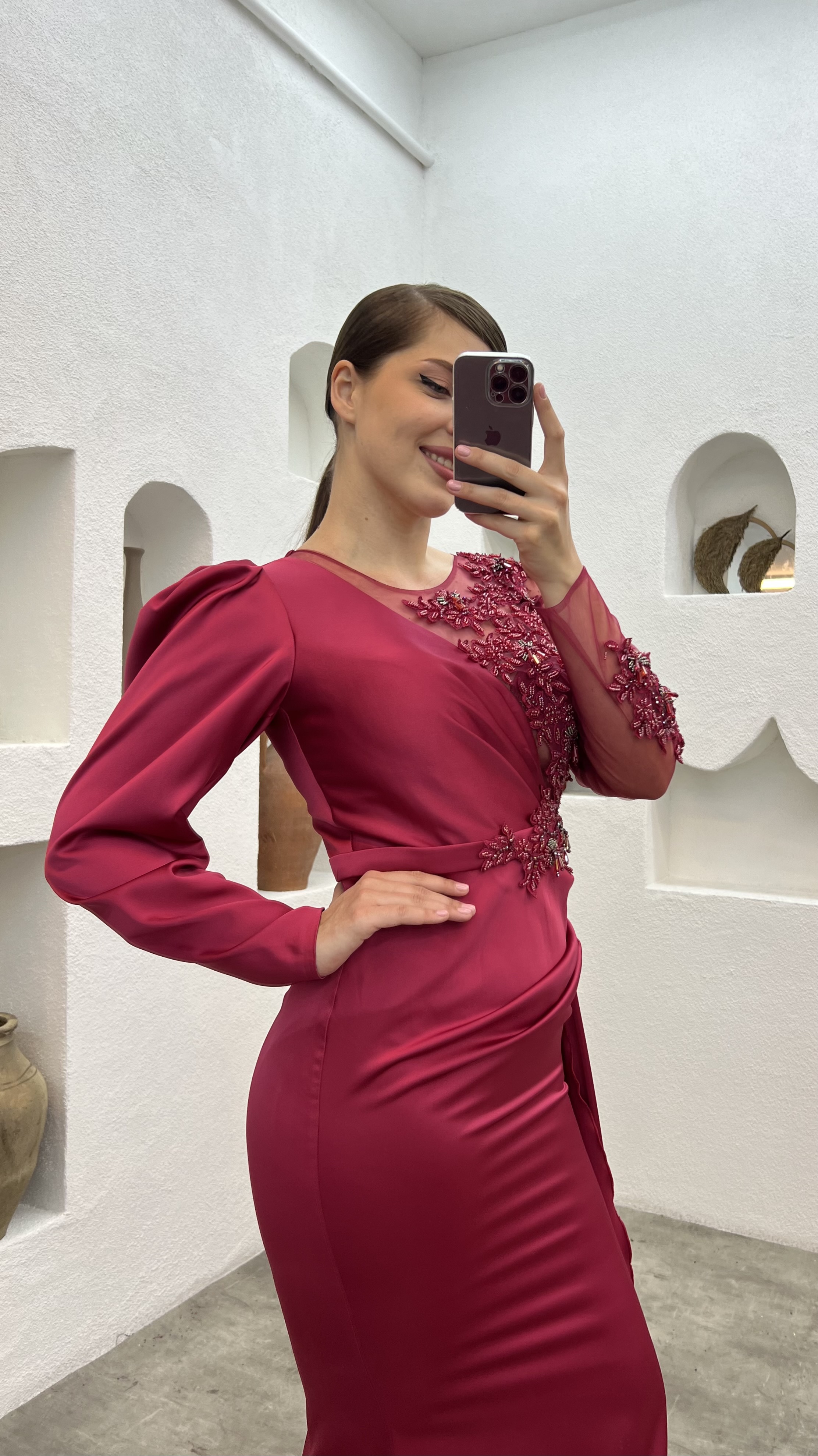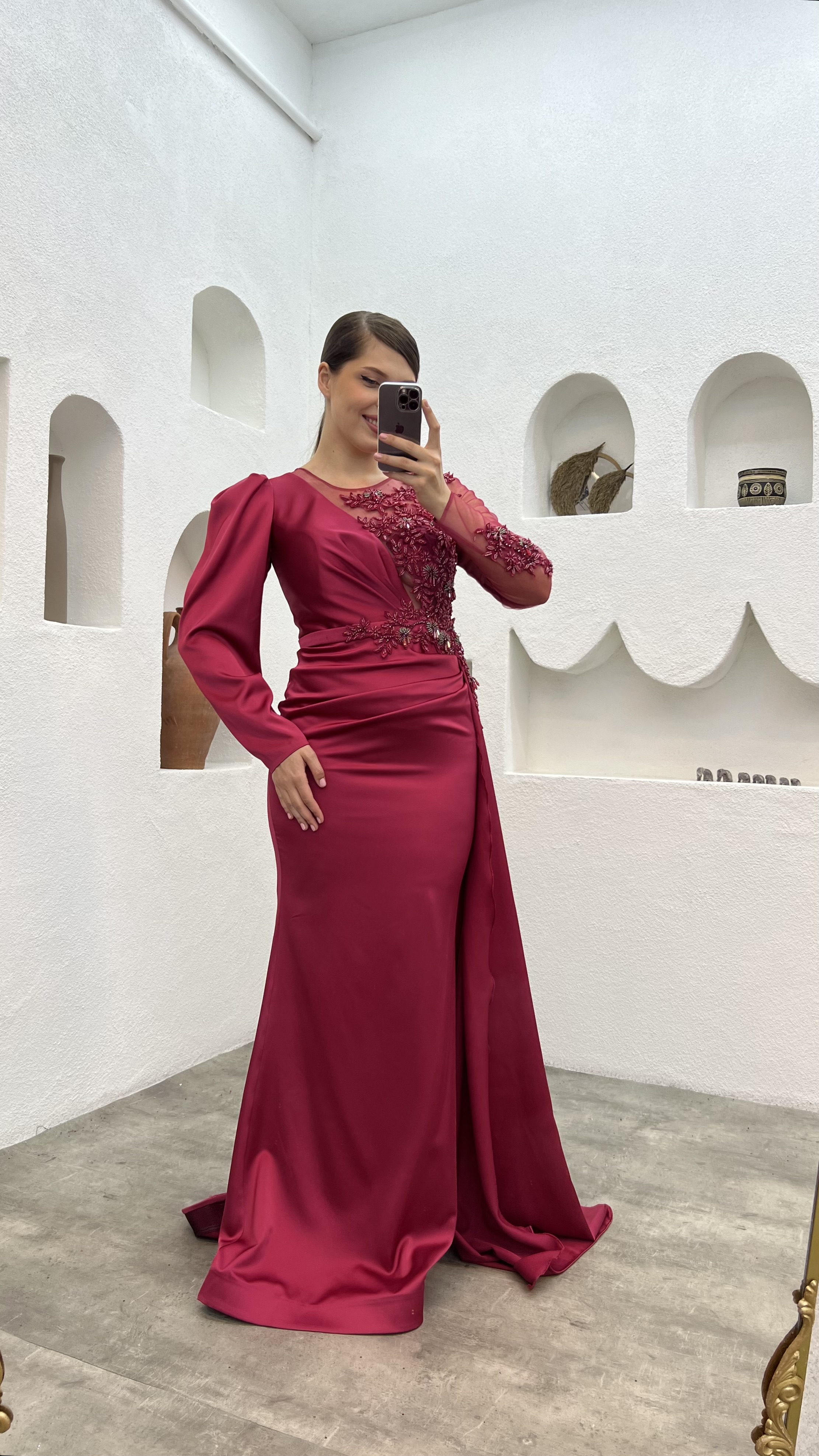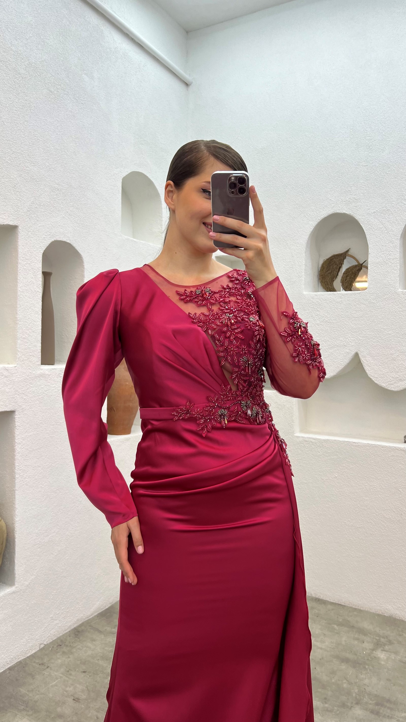 • Bordo Tek Kolu Tül Detay İşlemeli Büyük Beden Abiye Elbise