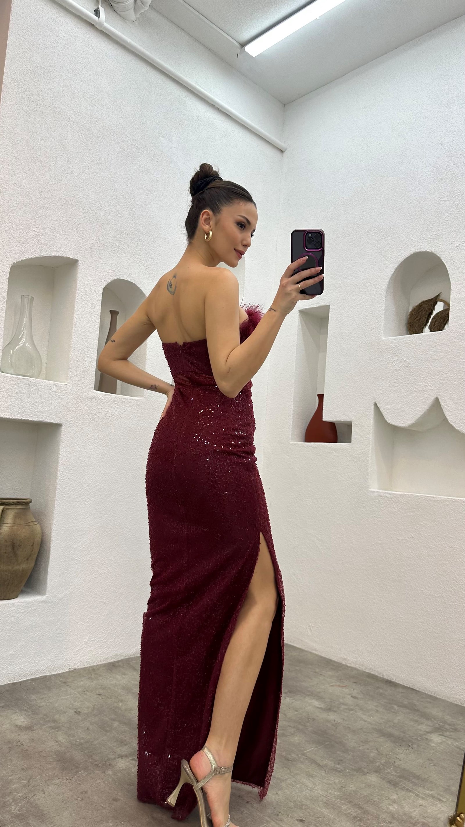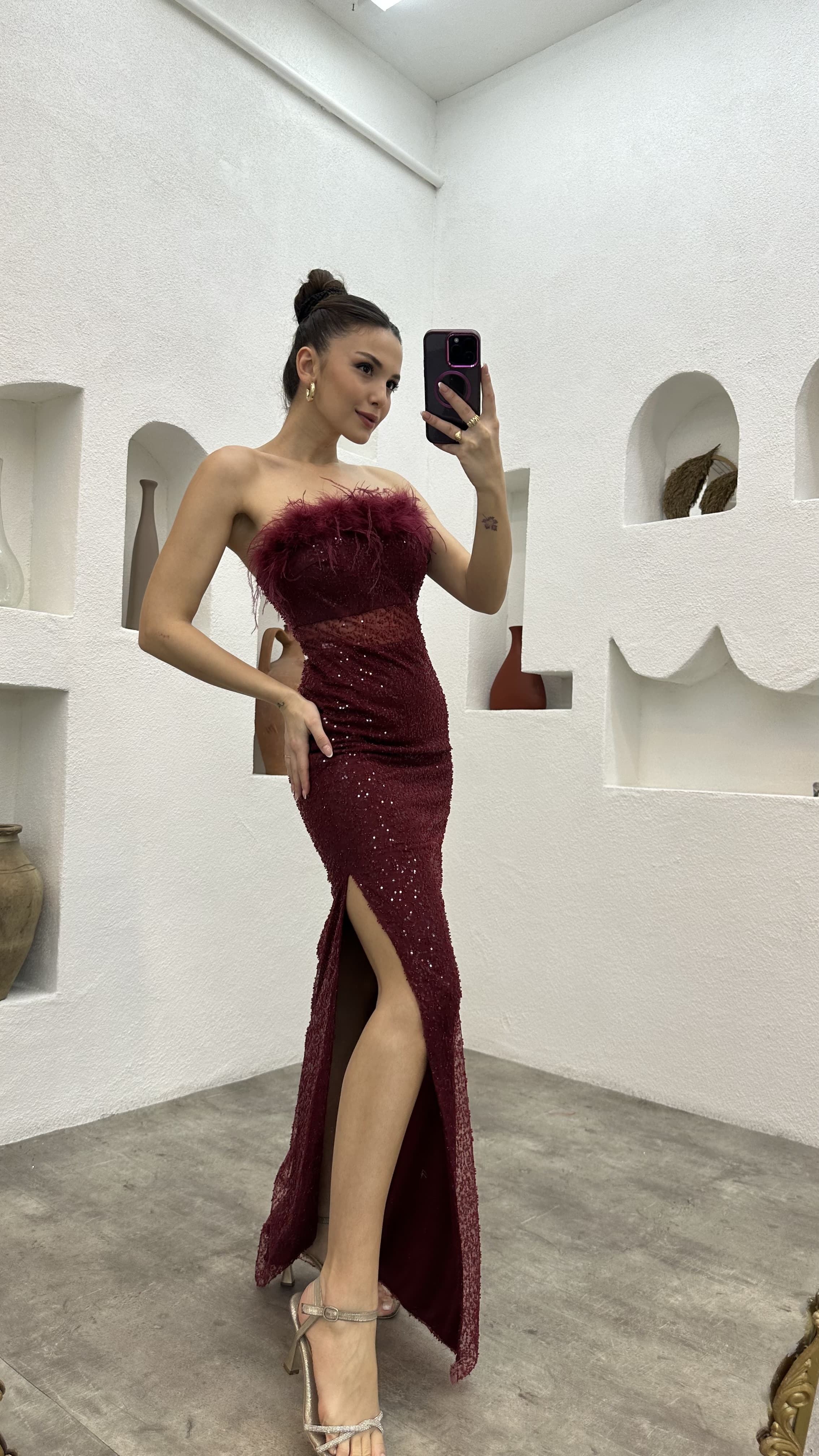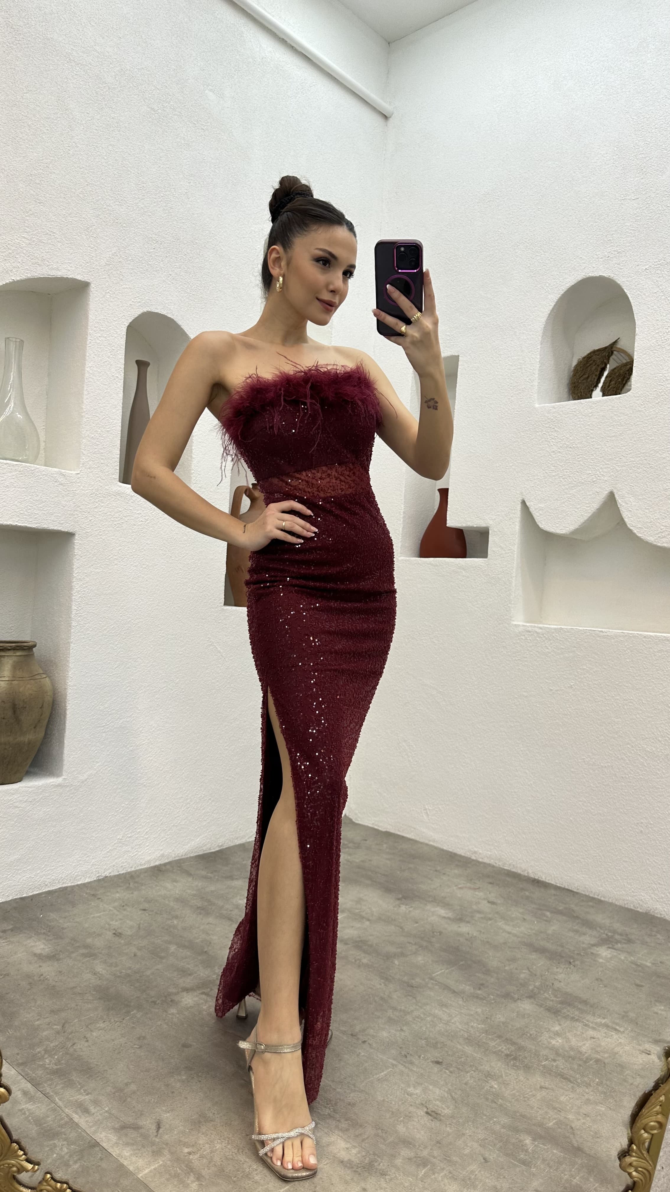 • Bordo Tüylü Transparan Detay Abiye Elbise