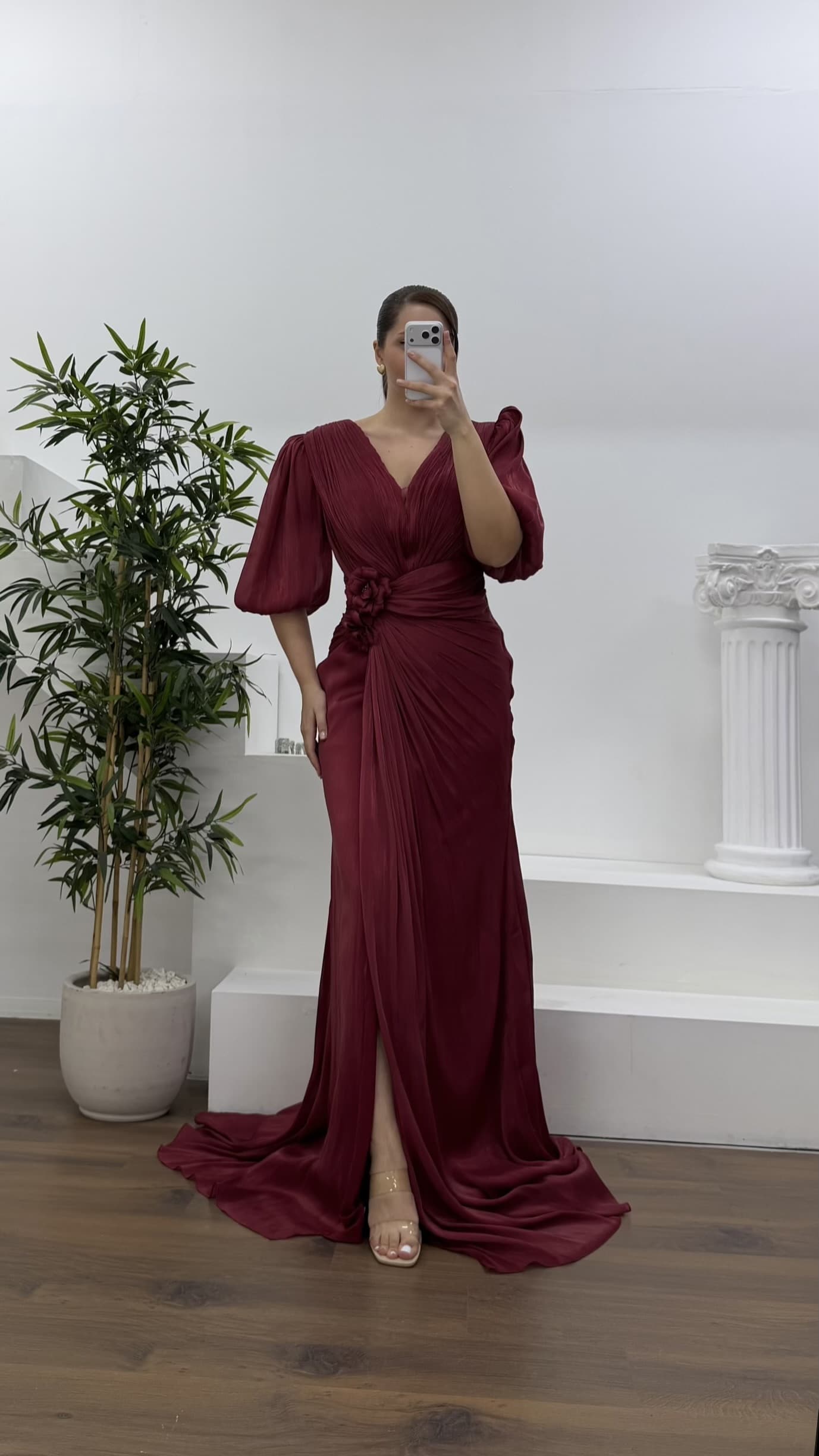 V yaka çiçek detay abiye elbise