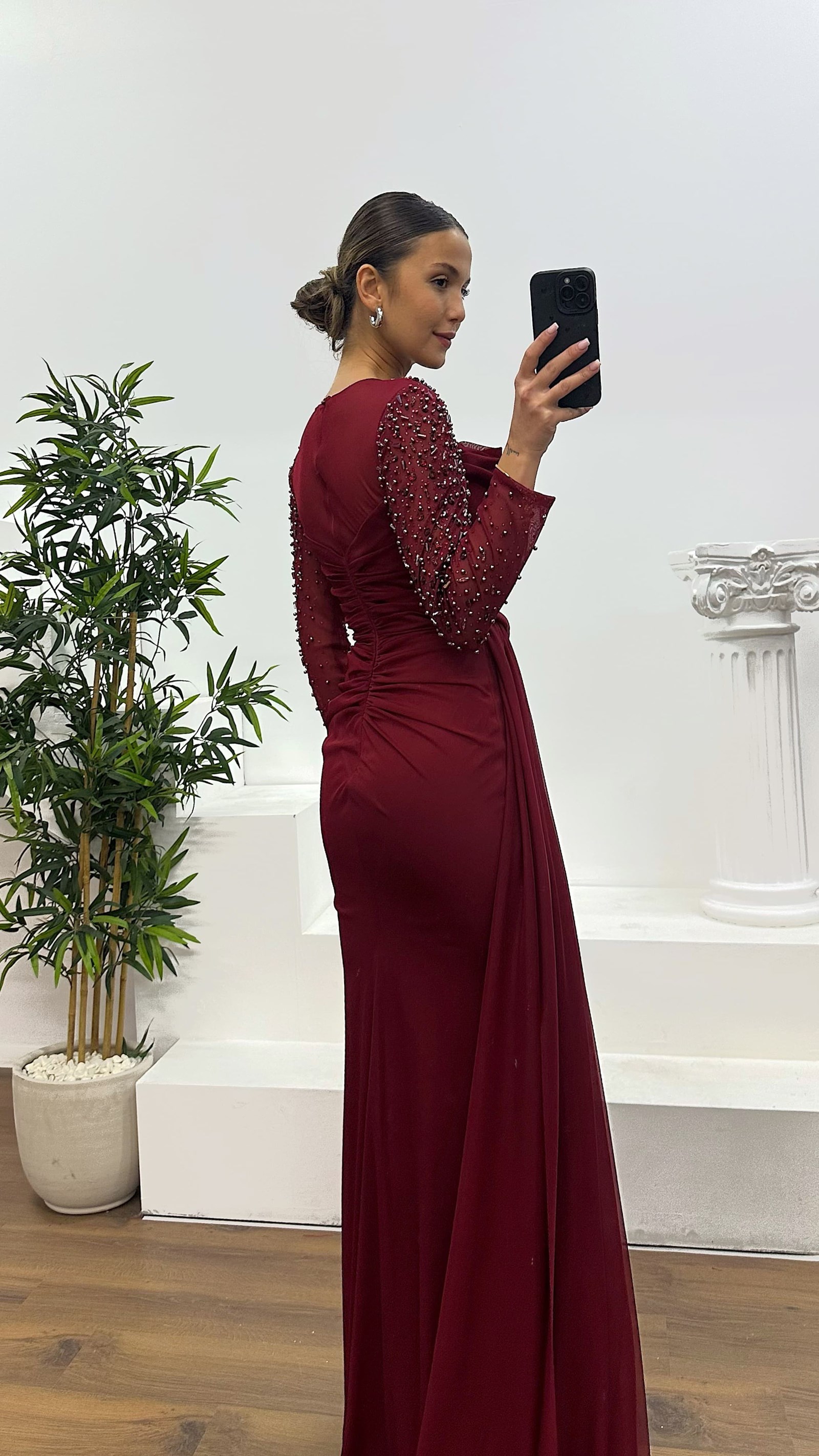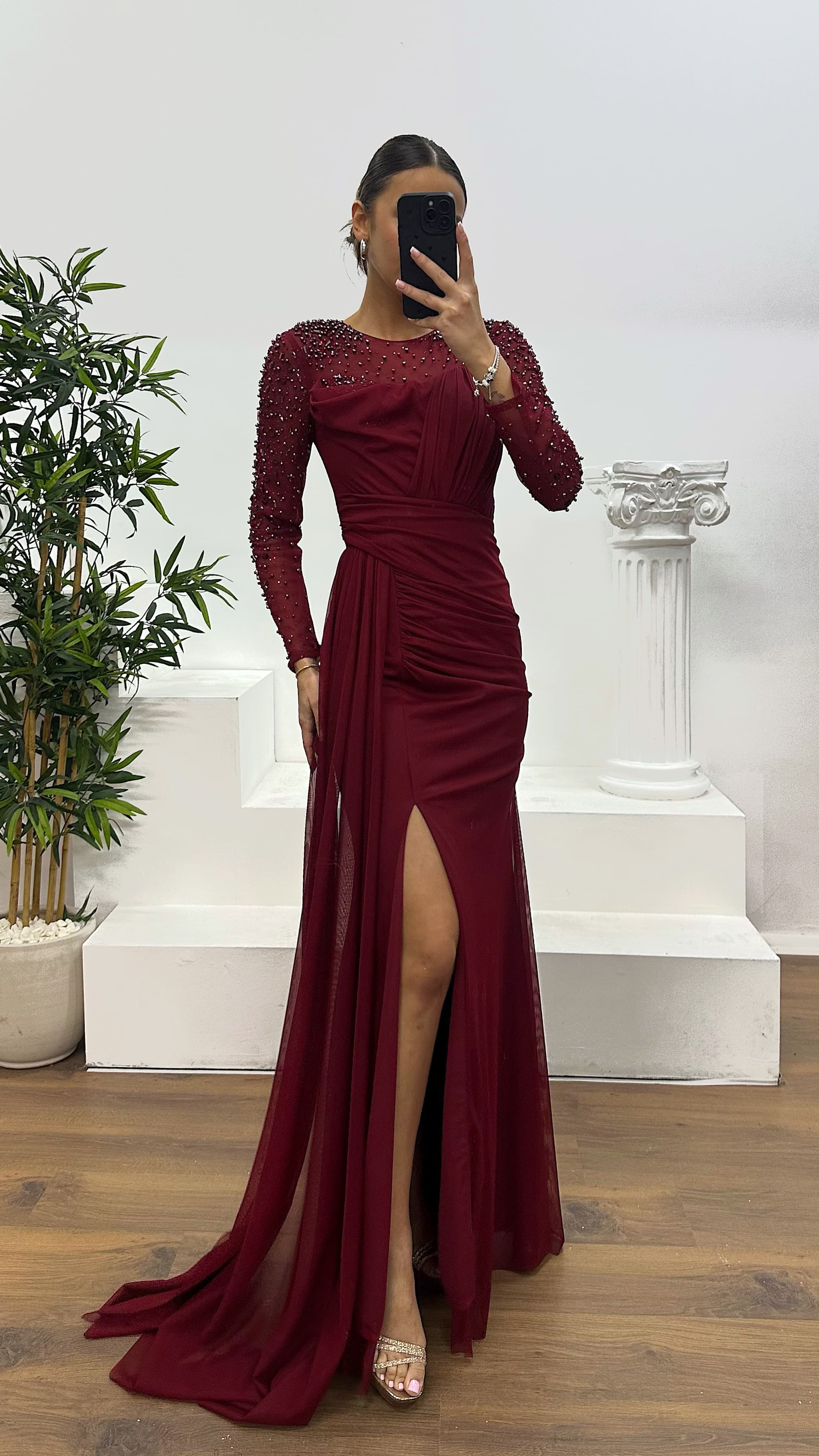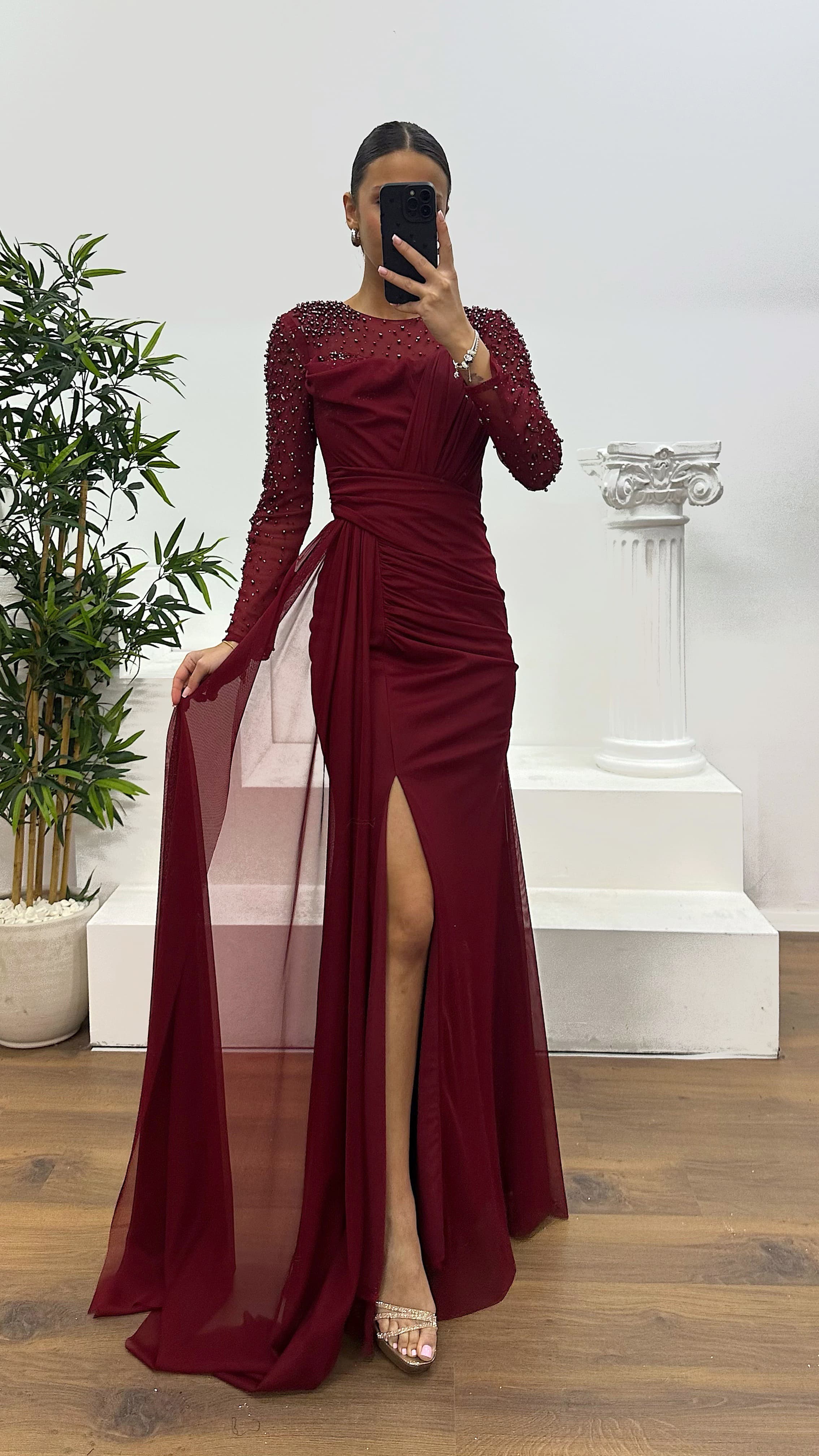 Ürün 36-44 bedene kadar uyumlu, göğüs pedli, astarlı, arka kapama fermuar, yırtmaçlı, işleme detay abiye olarak tasarlanmıştır.