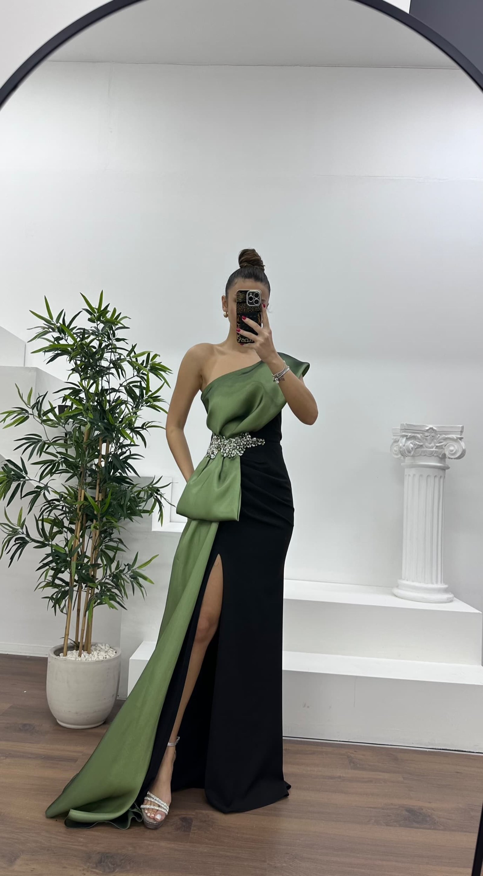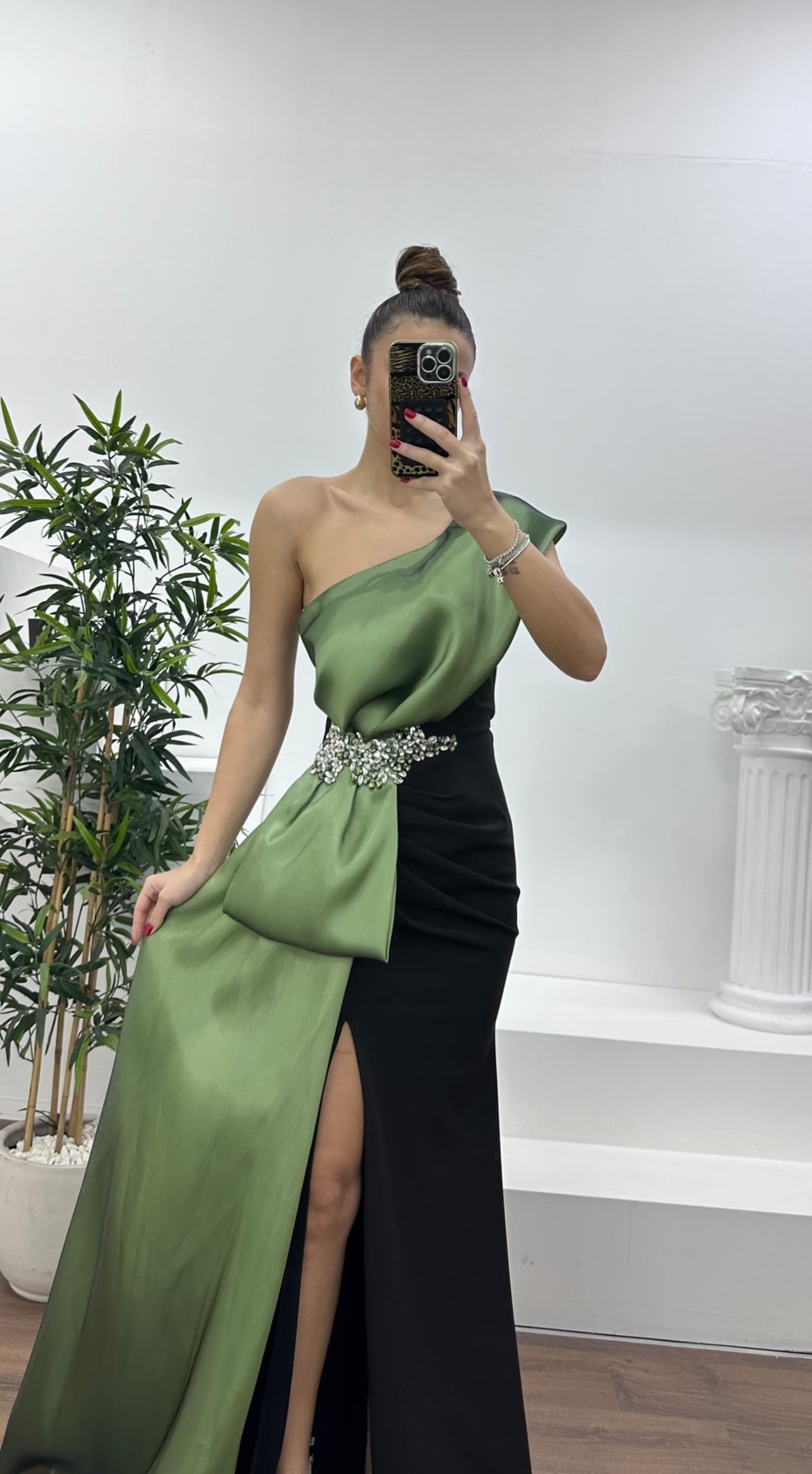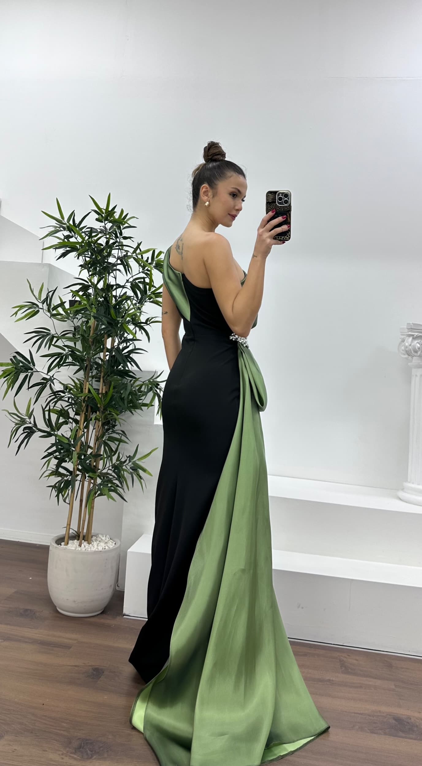 • Kemik Tek Omuz Taş Detay Abiye Elbise