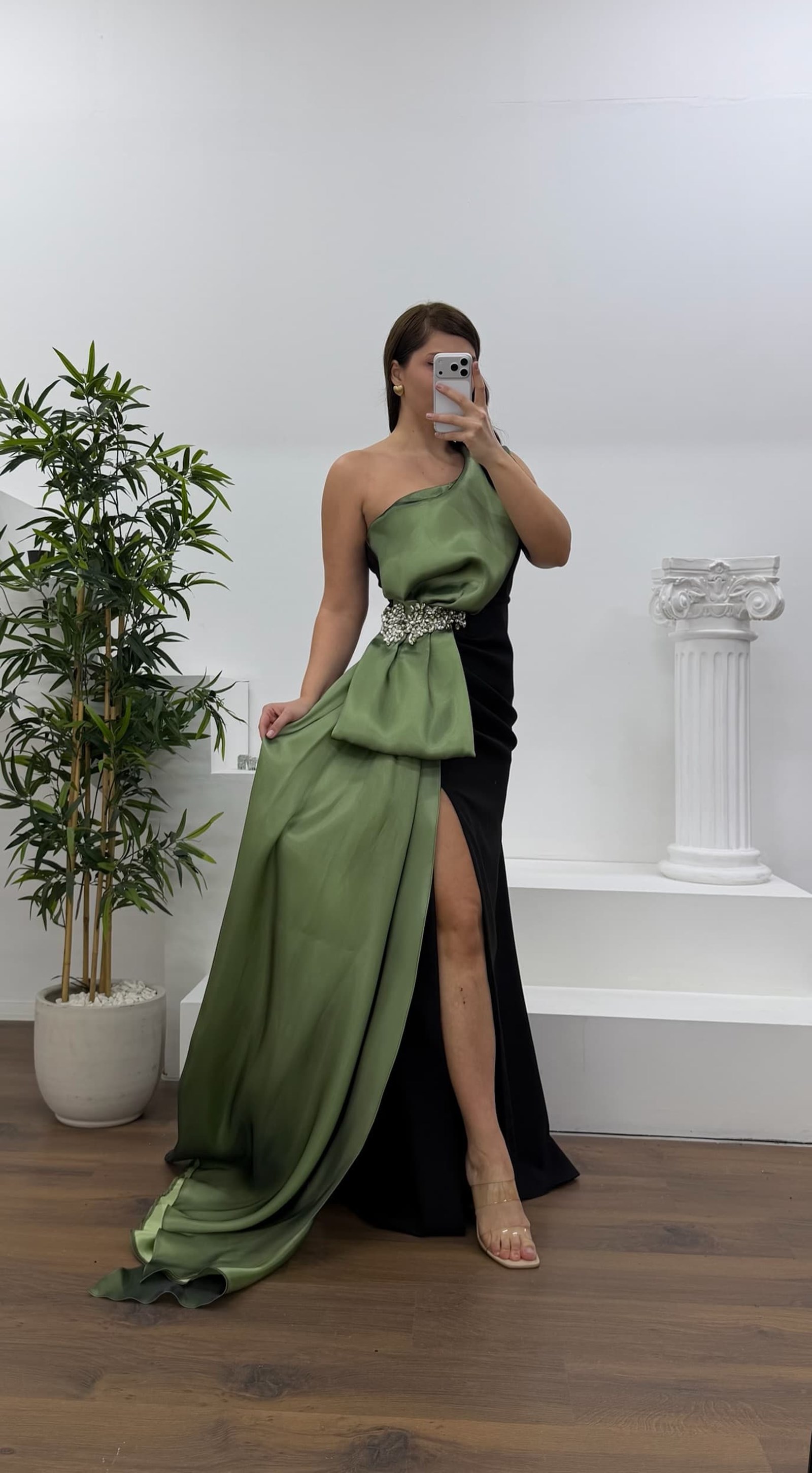 • Çağla Tek Omuz Taş Detay Büyük Beden Abiye Elbise