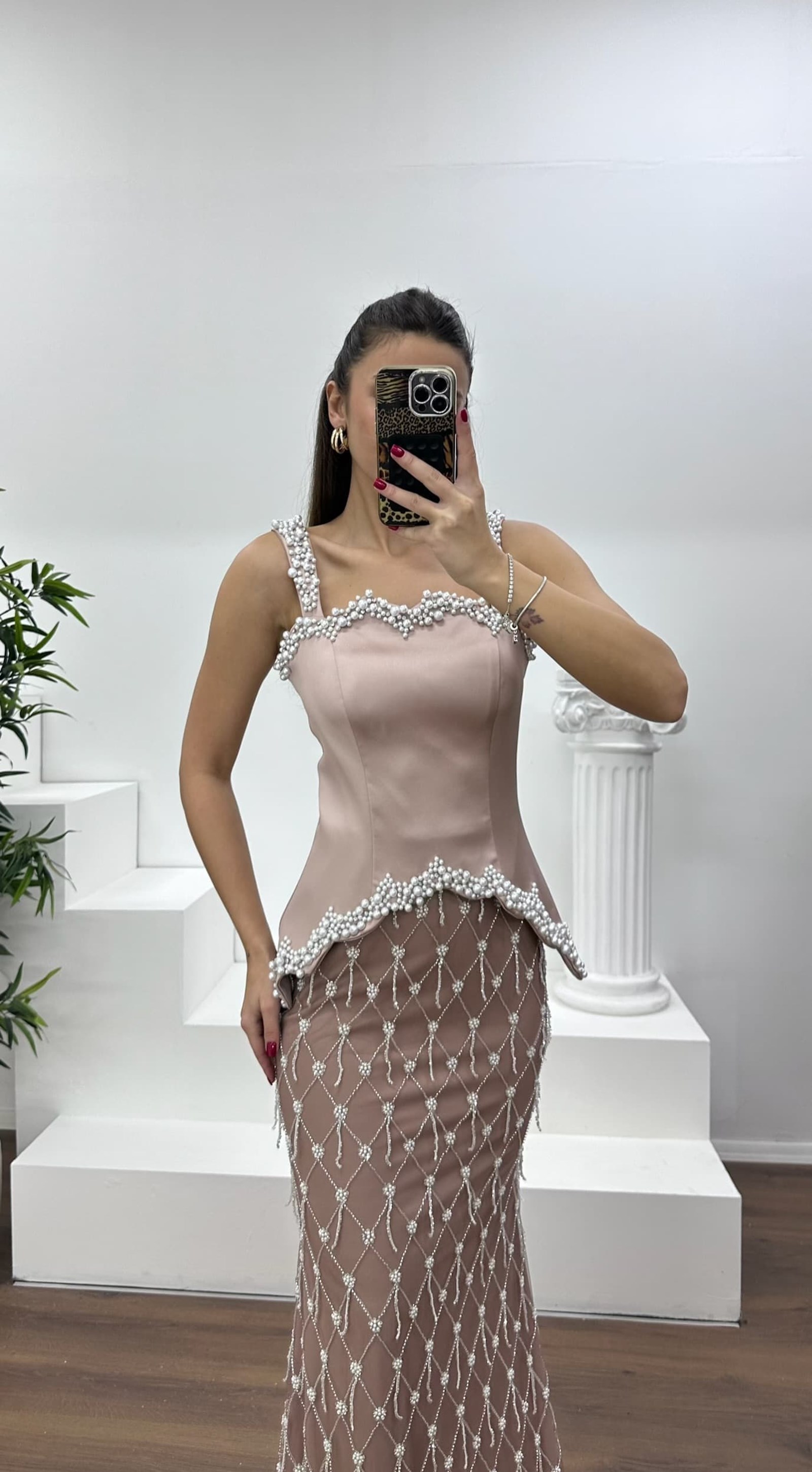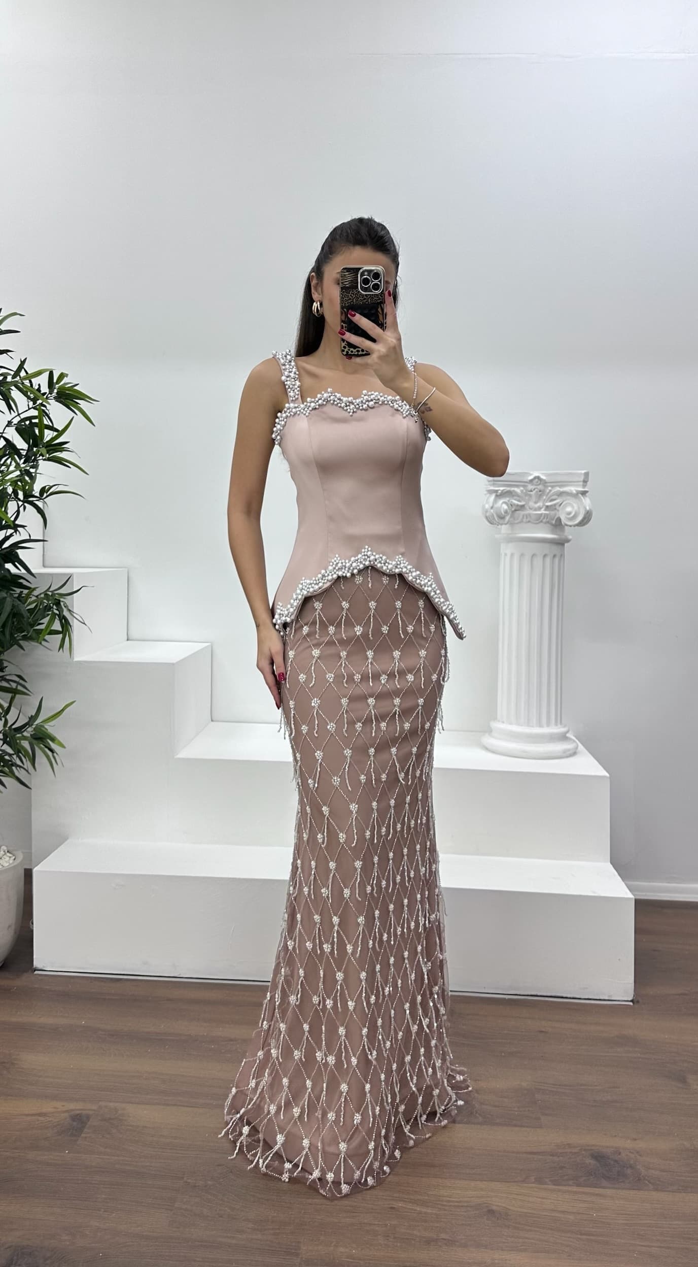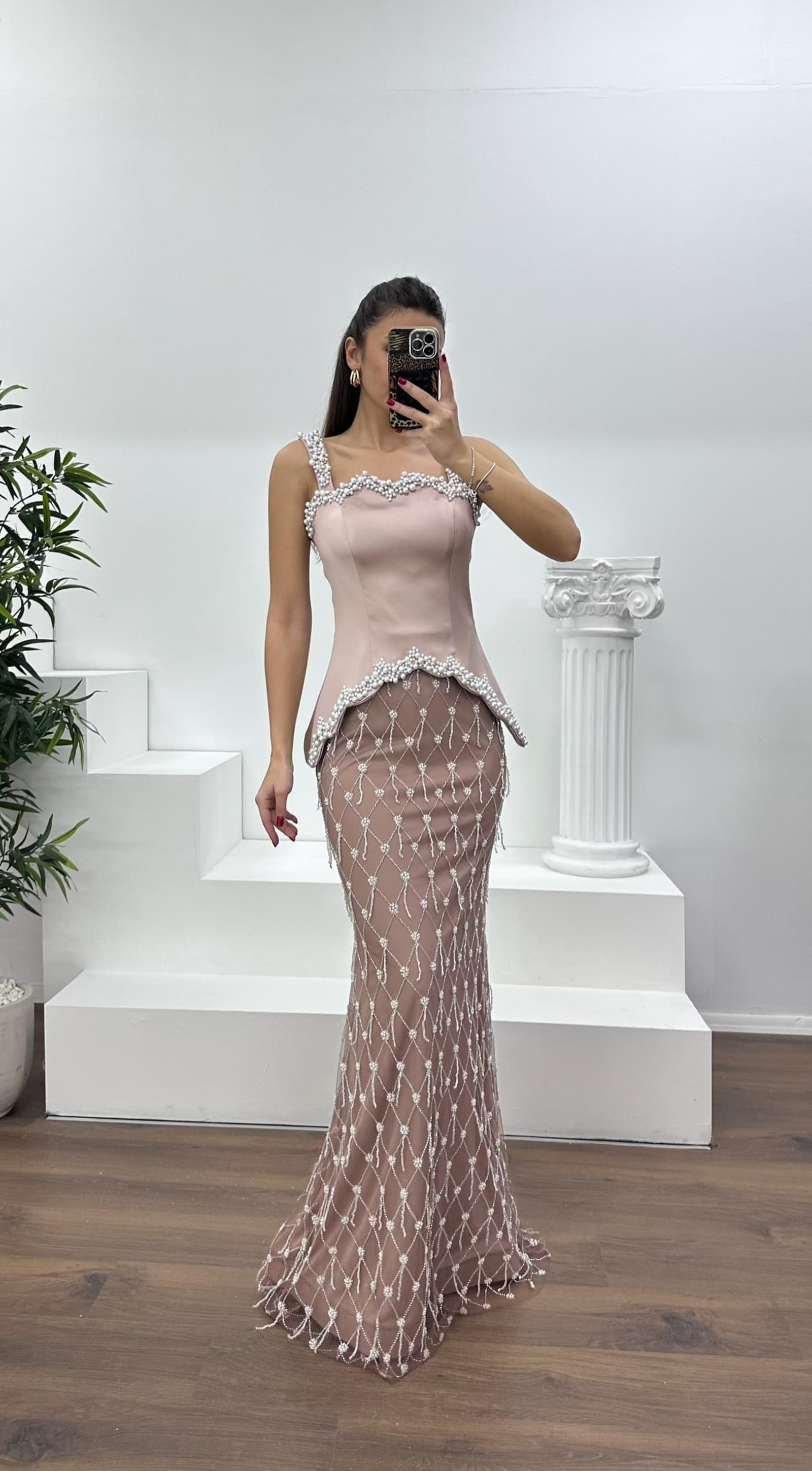 • Pudra Kare Yaka Boncuklu Uzun Abiye Elbise