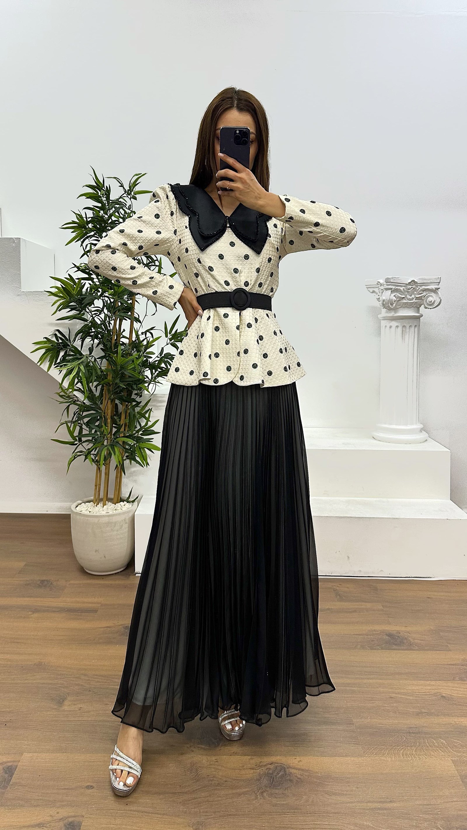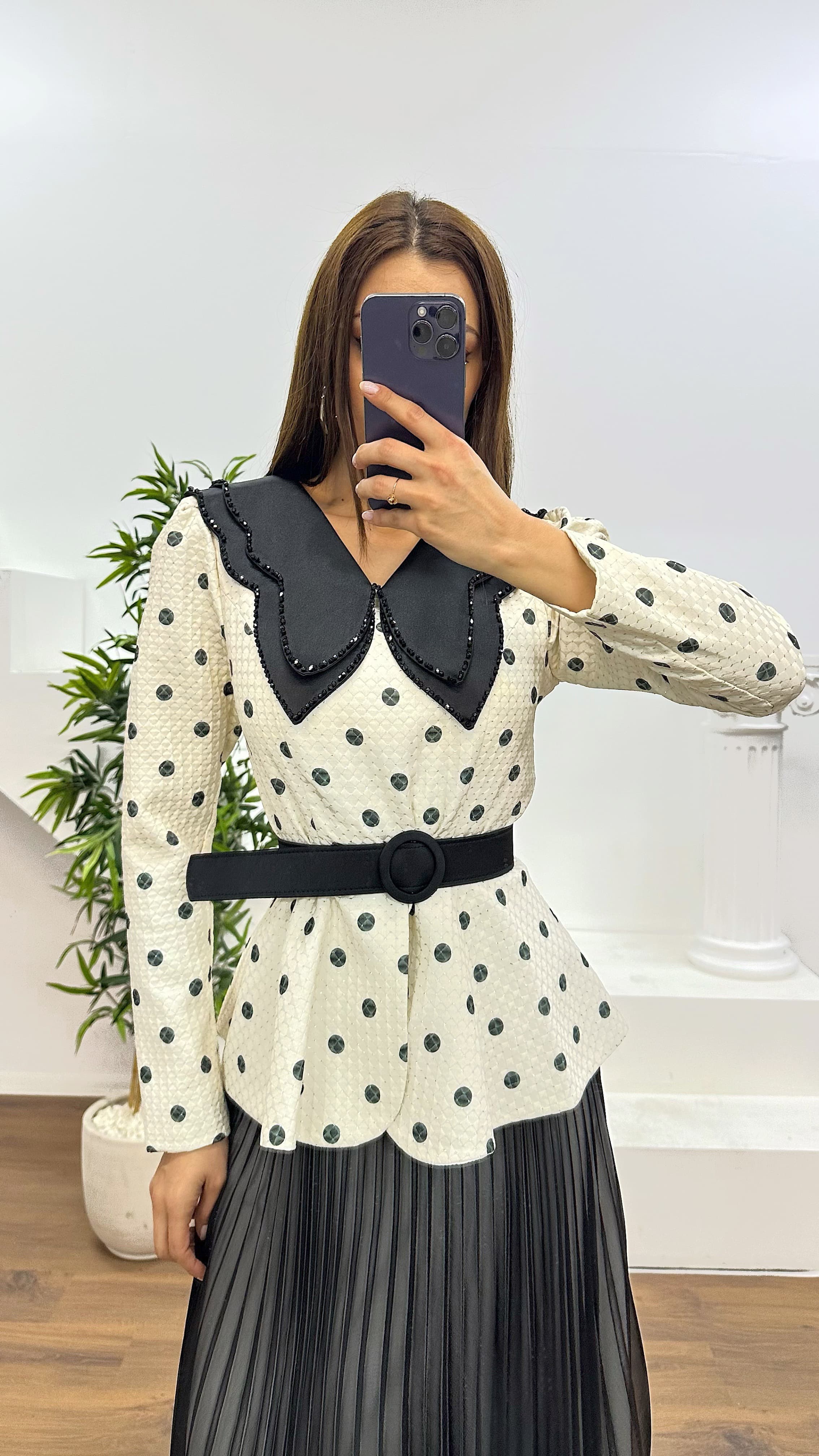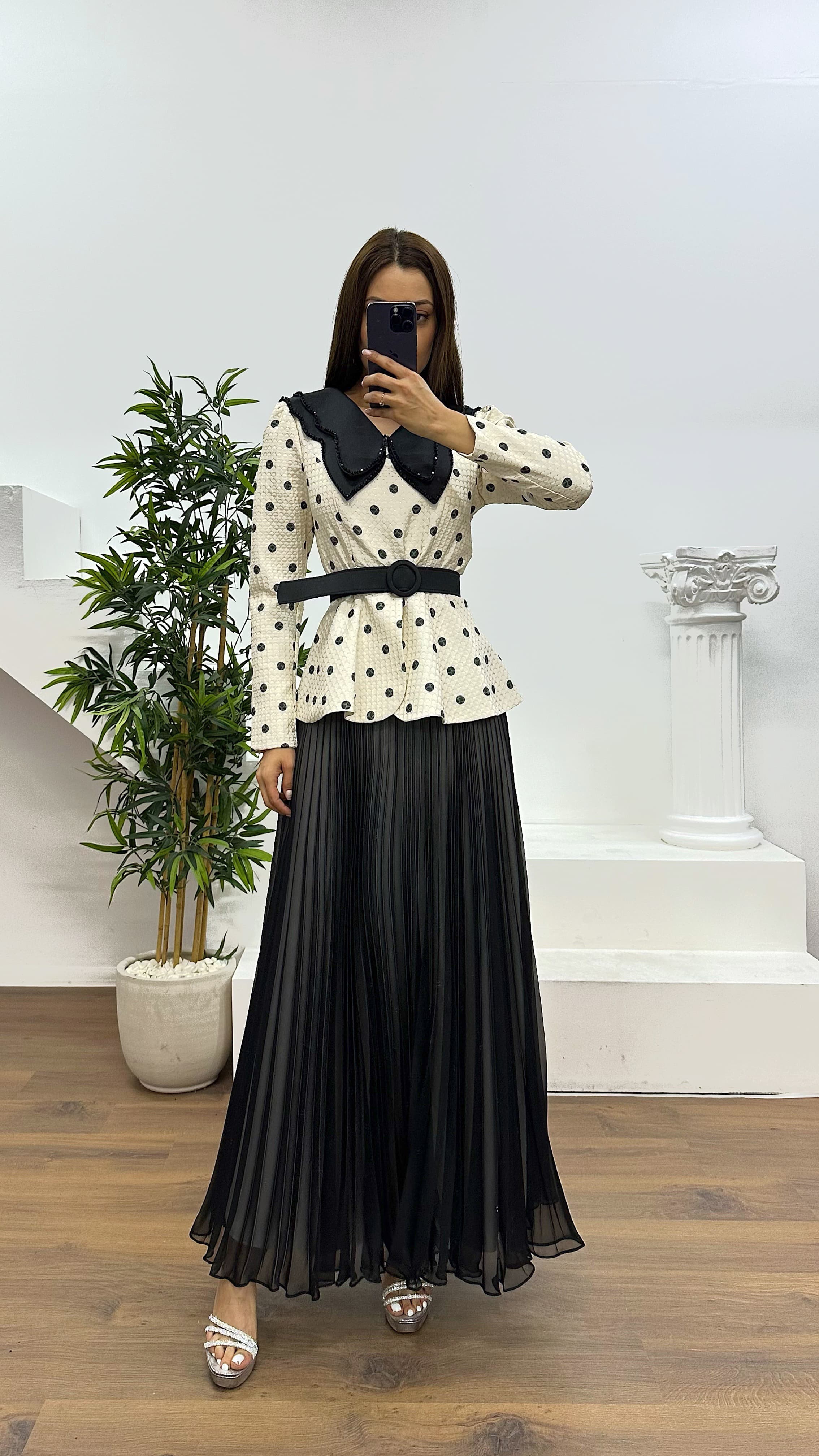 • Siyah Bebe Yaka Puantiyeli Etek Takım