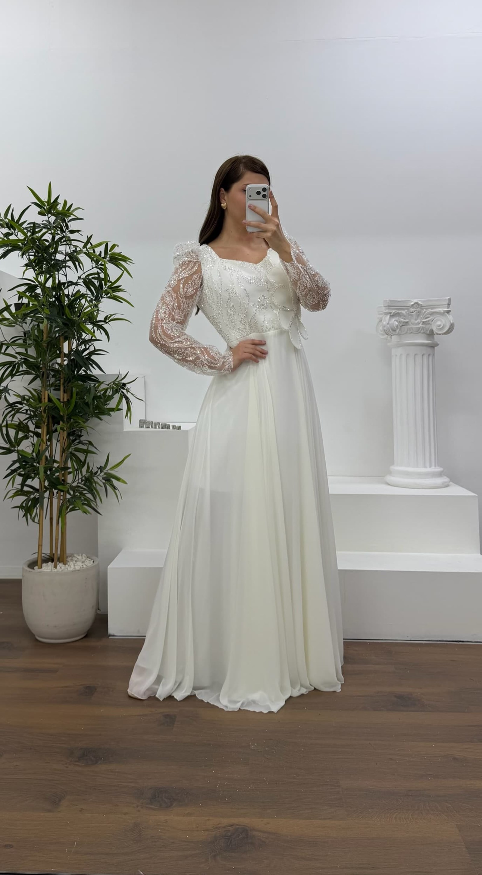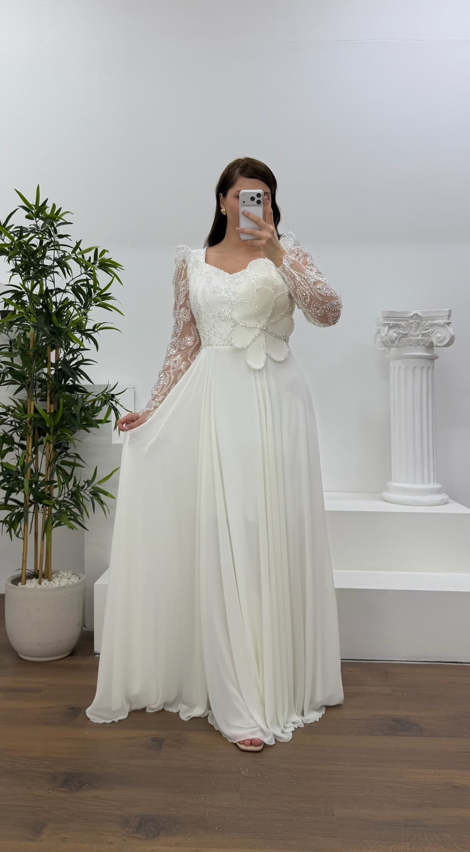 Ekru Beli Çiçek Detay Şifon Büyük Beden Abiye Elbise