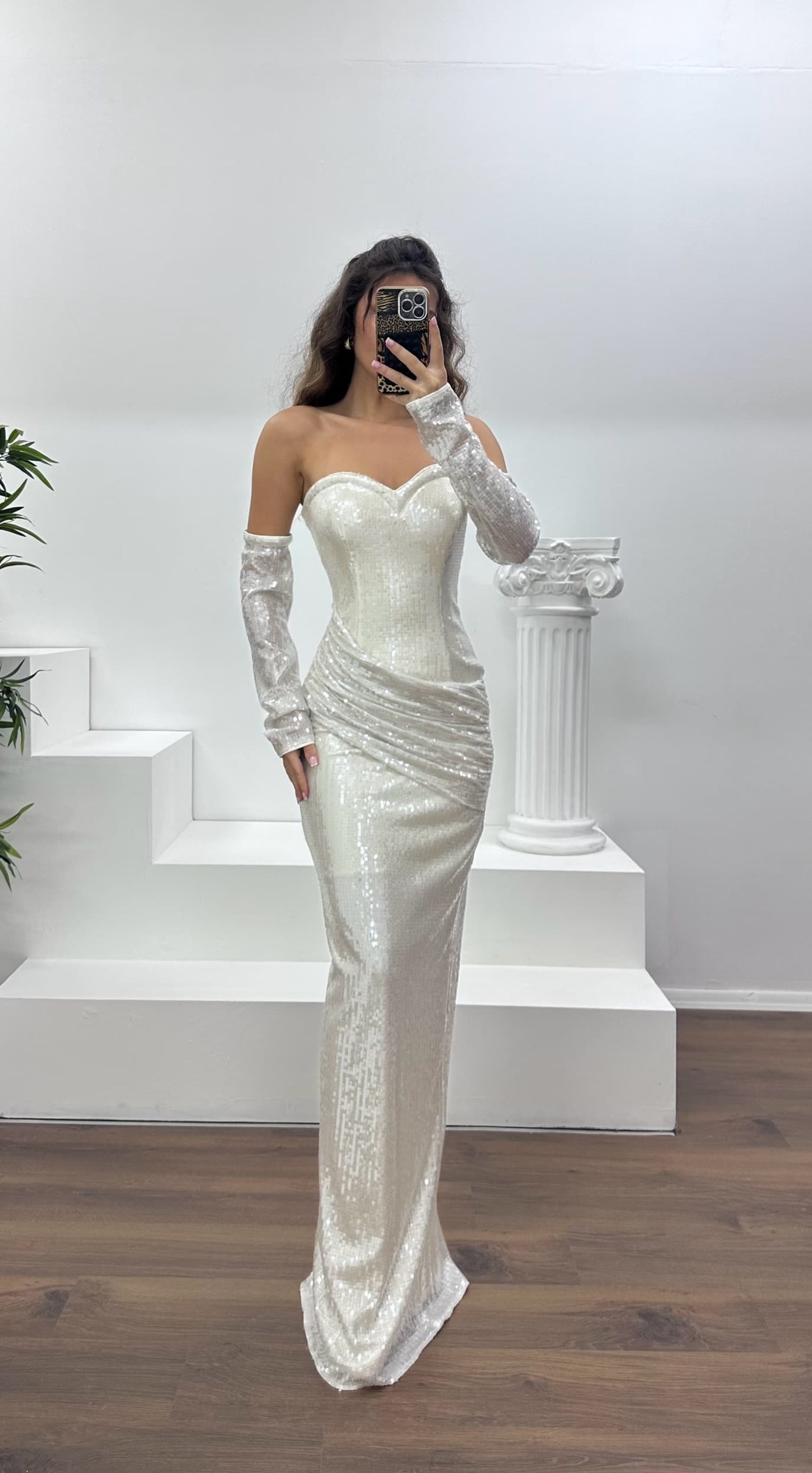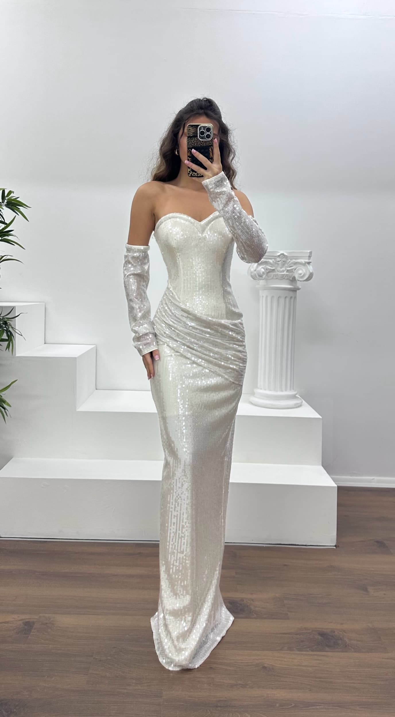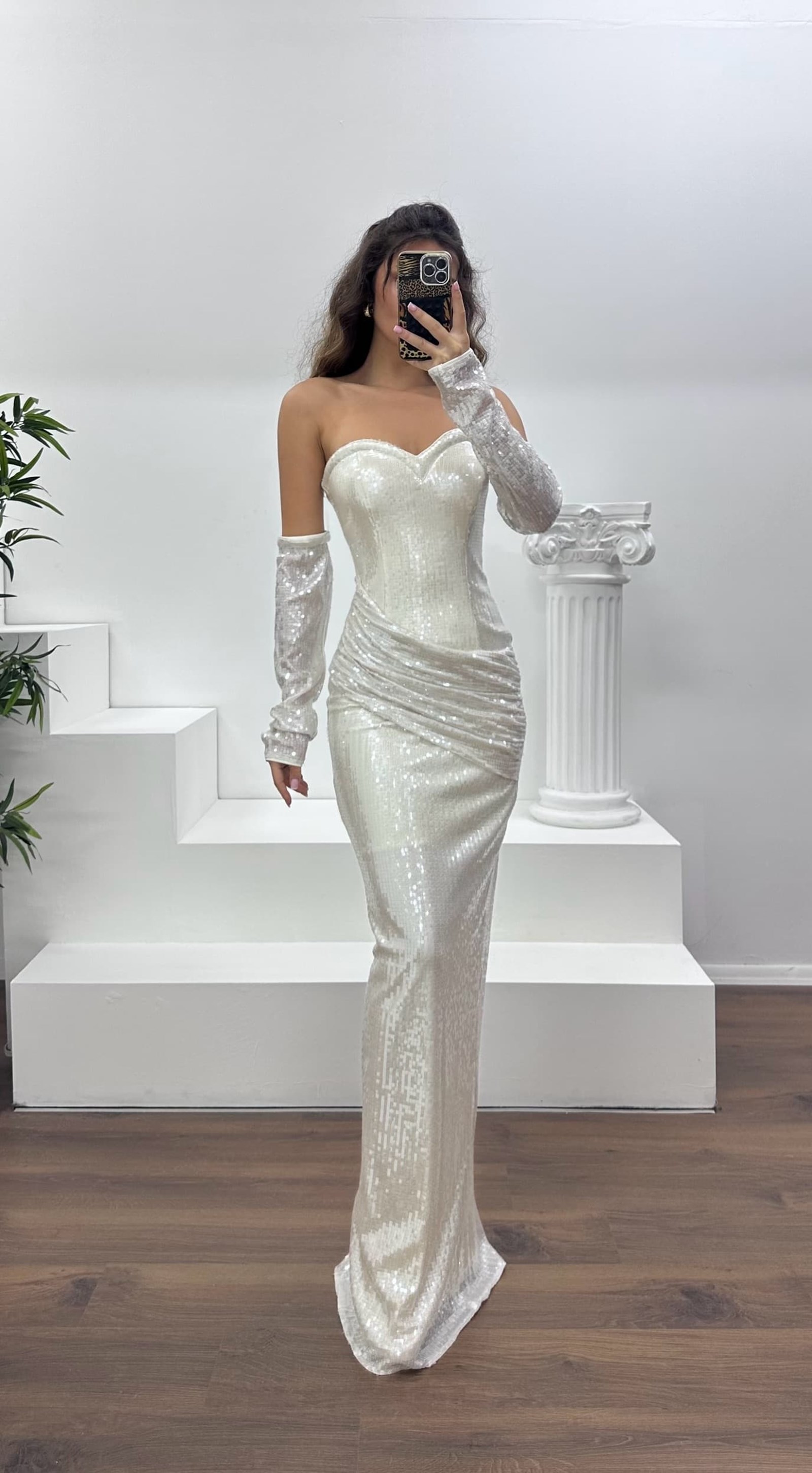 • Gümüş Straplez Pullu Abiye Elbise