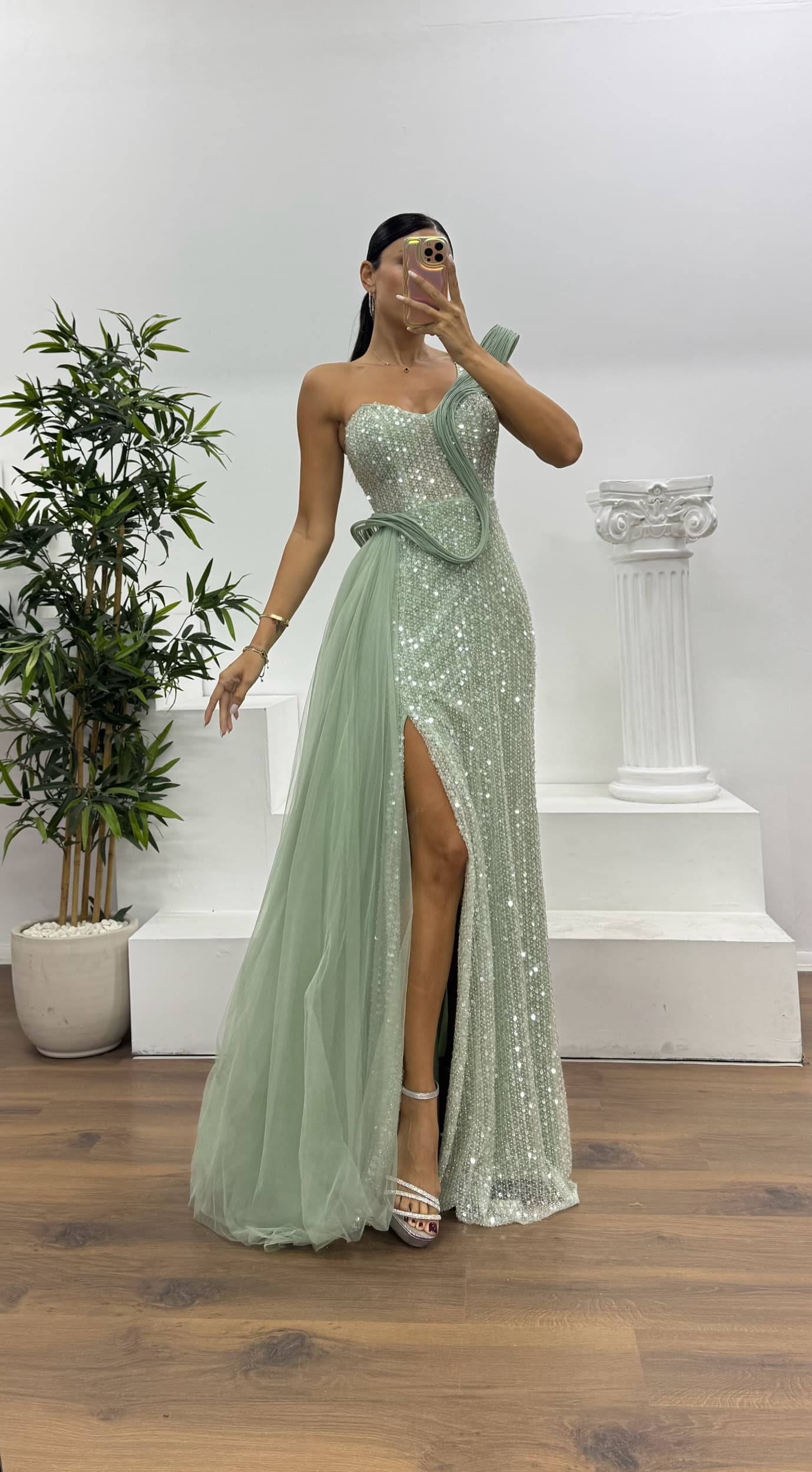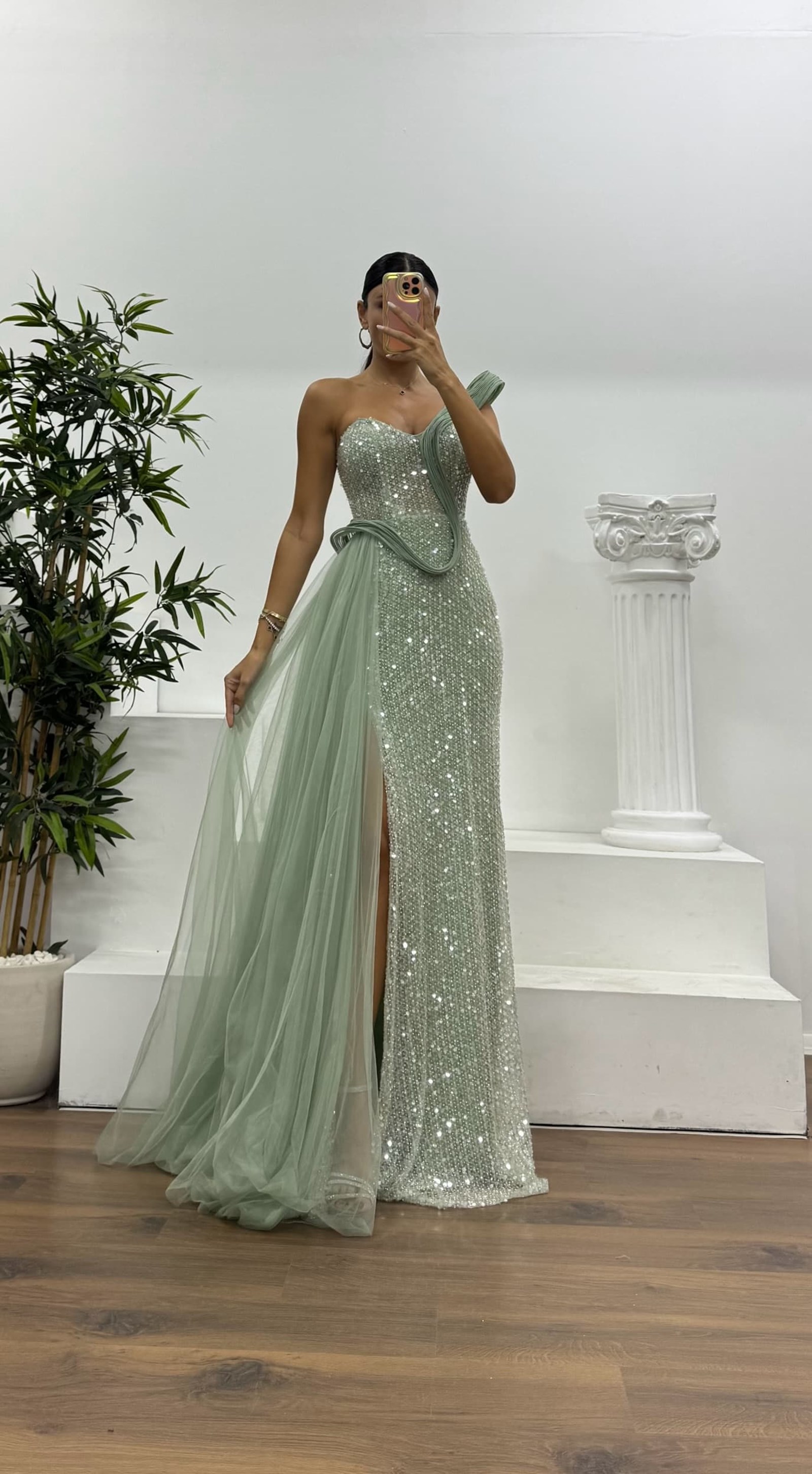 Tek omuz tül detay abiye elbise