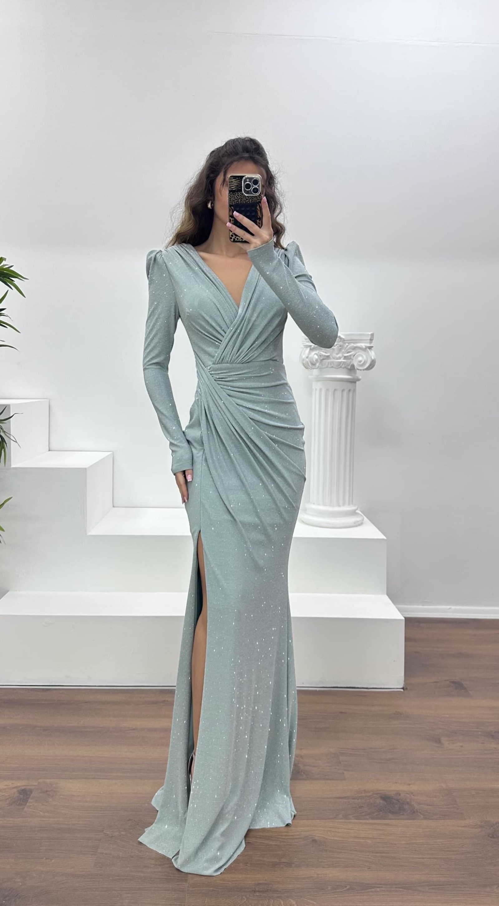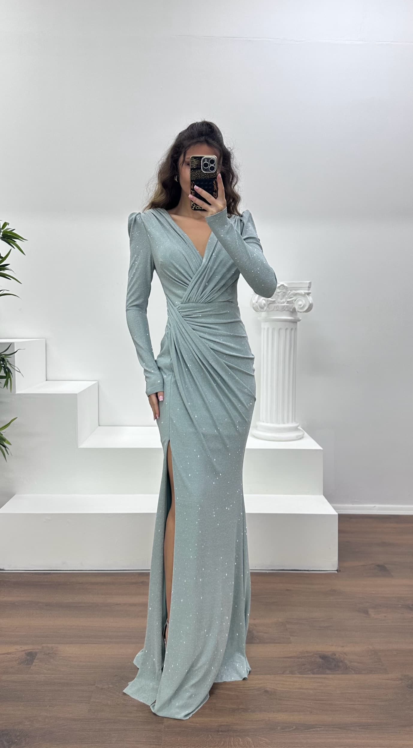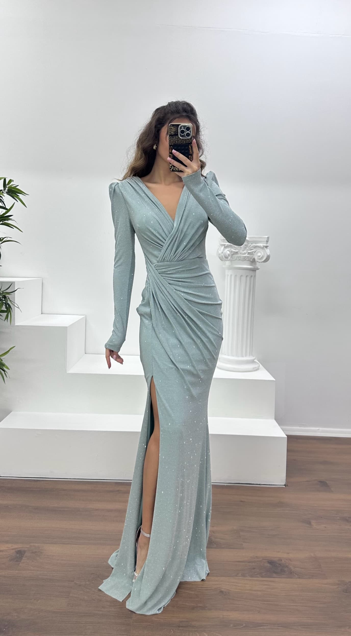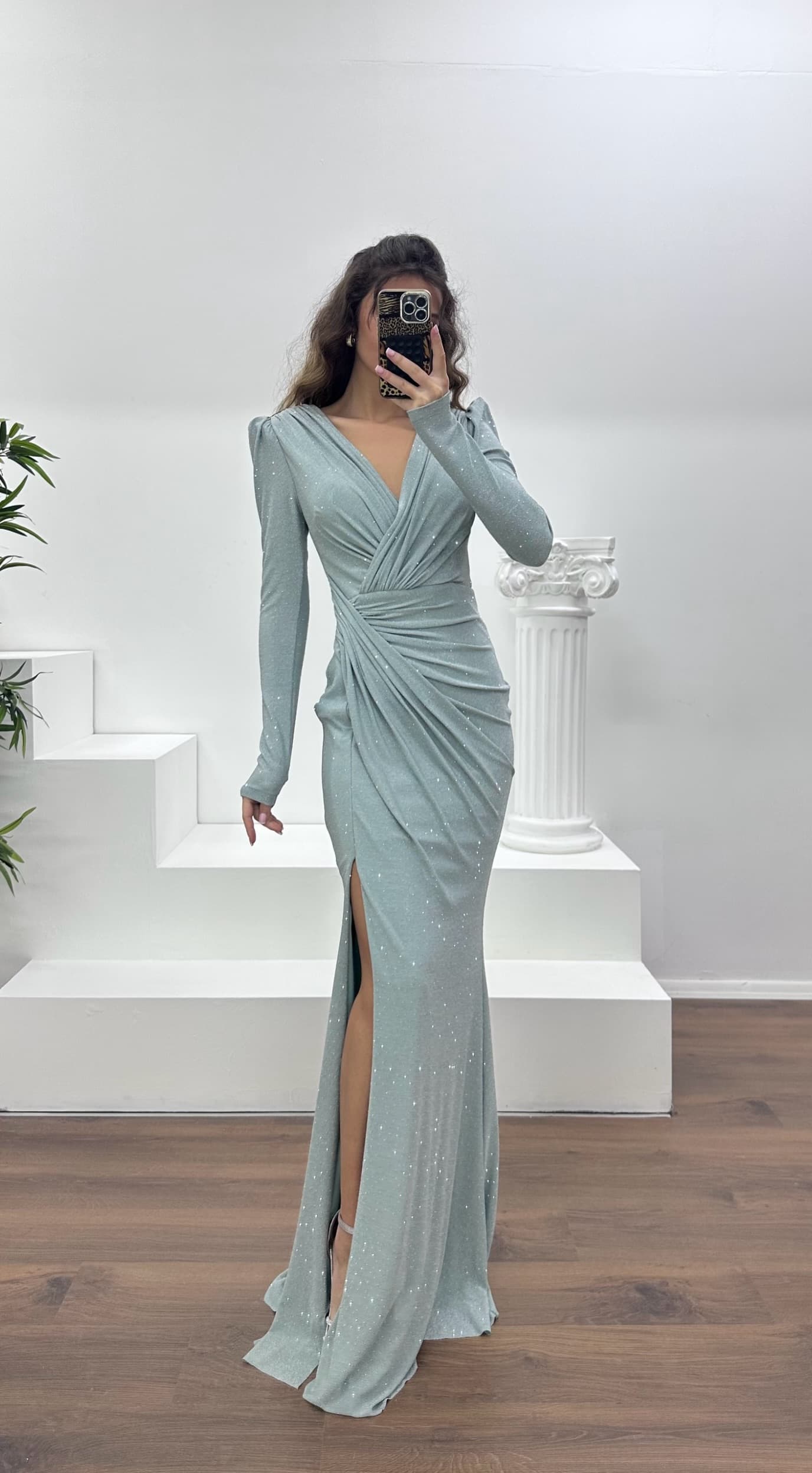 Ürün 36-44 bedene kadar uyumludur. göğüs pedli, astarlı, arka kapama fermuar, yırtmaçlı, drapeli abiye olarak tasarlanmıştır.