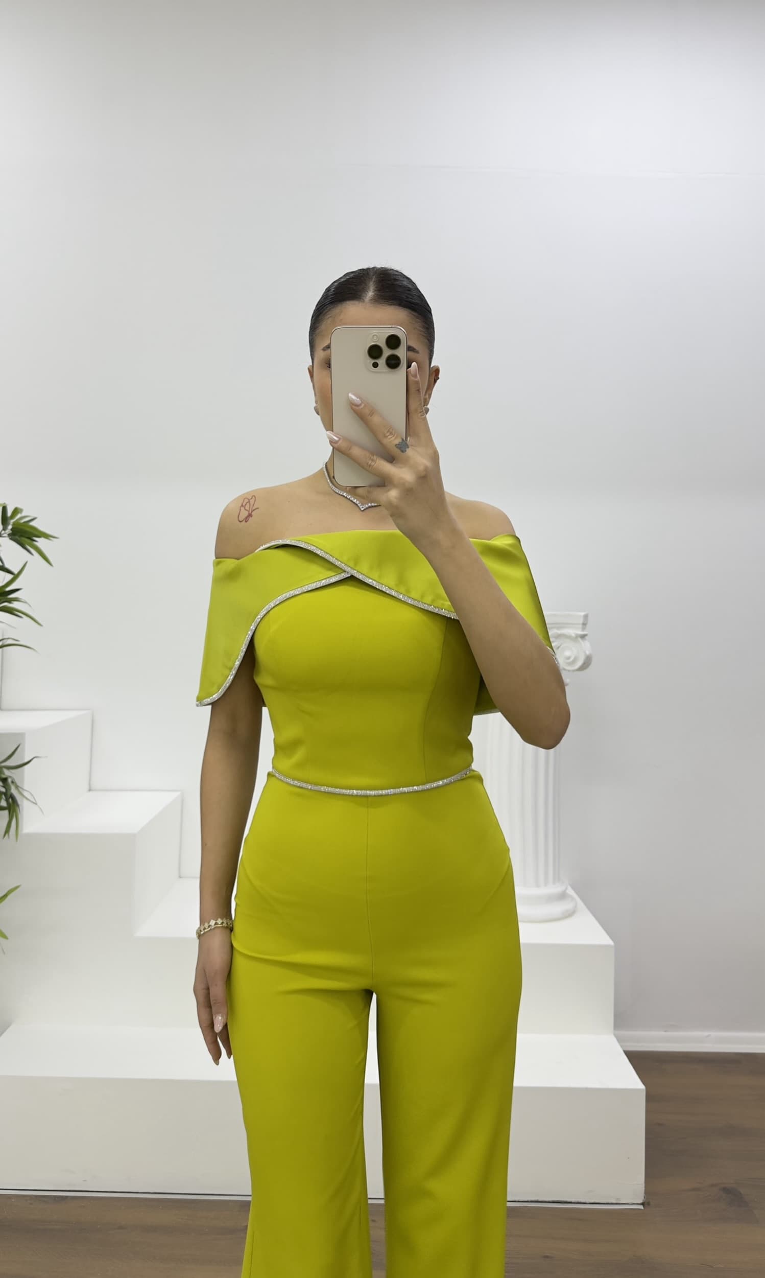 • Fıstık Yeşili Kayık Yaka Taş Detay Abiye Tulum