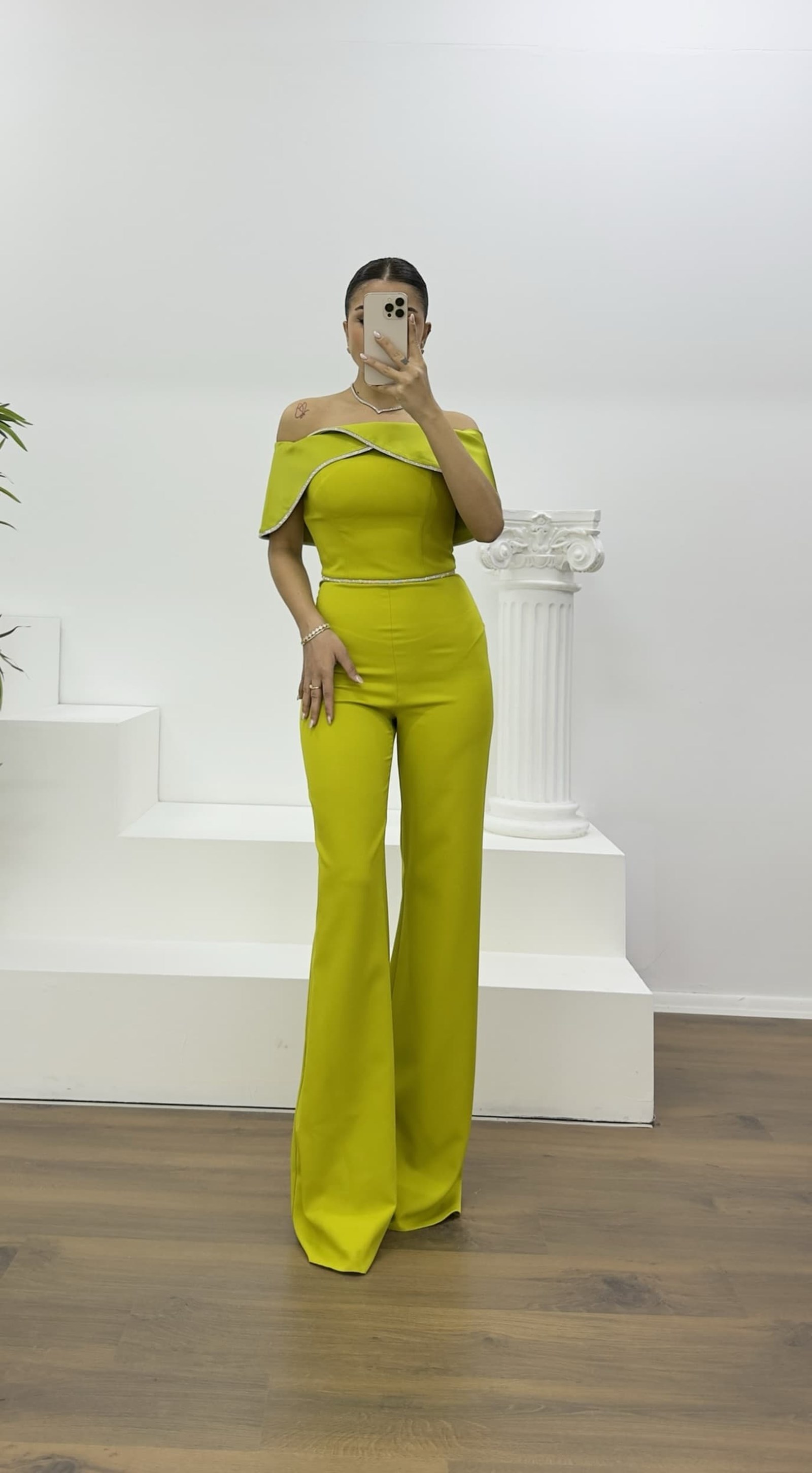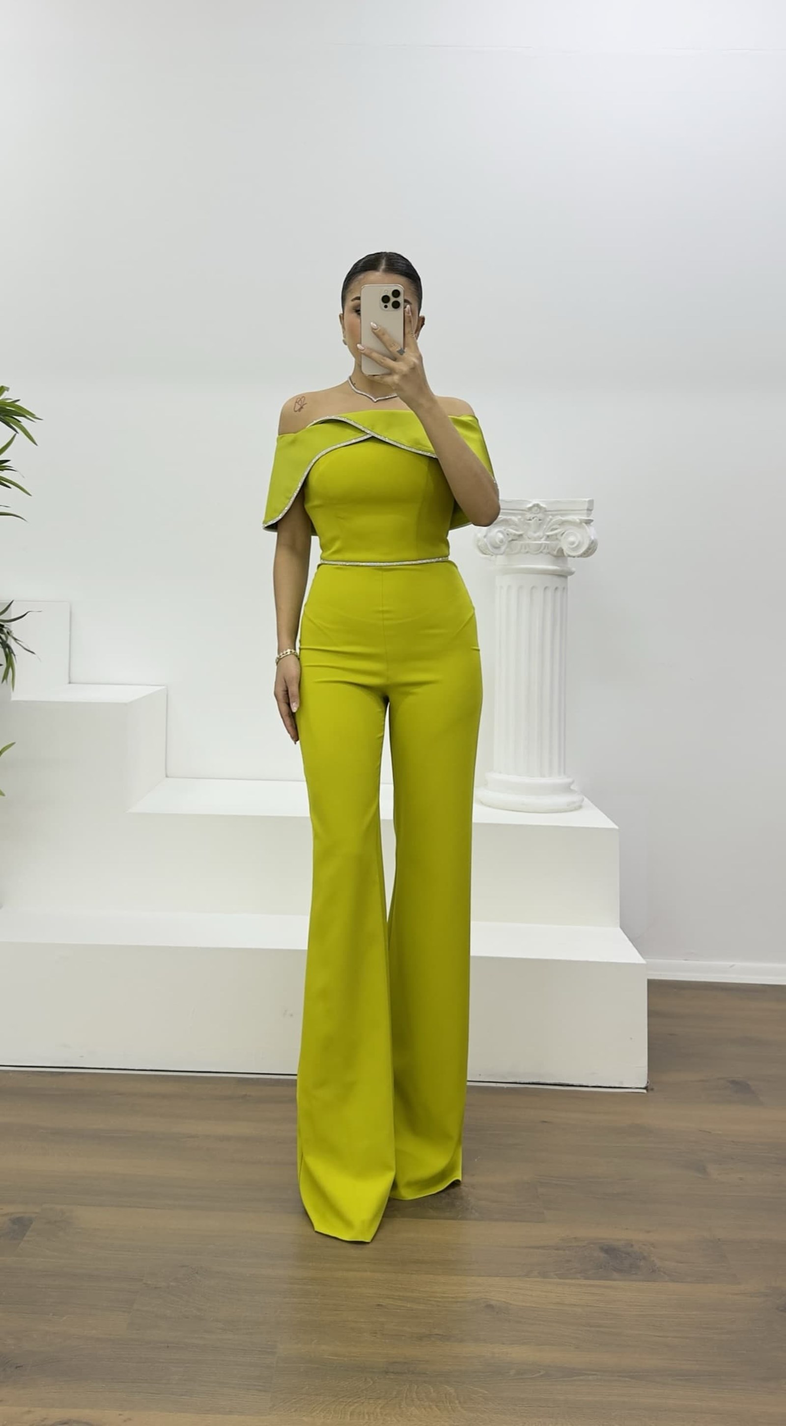 Fıstık Yeşili Kayık Yaka Taş Detay Abiye Tulum