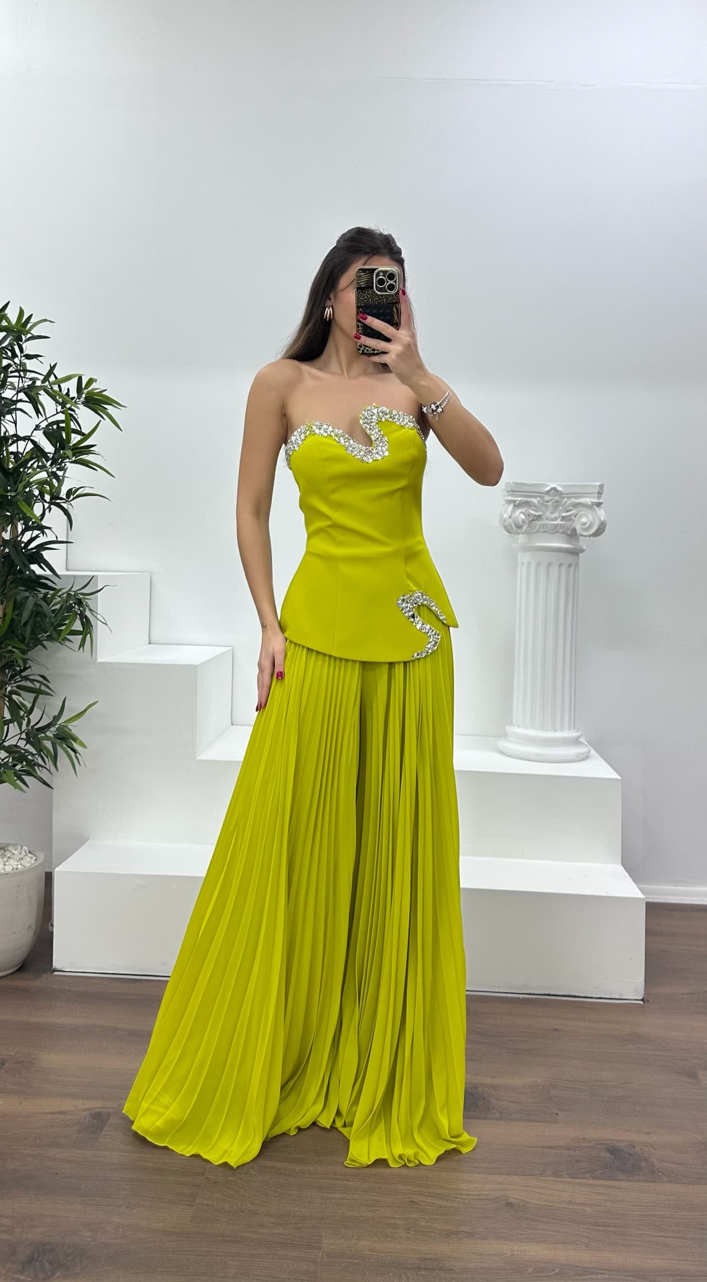 • Fıstık Yeşili Straplez Asimetrik Desen Taşlı Abiye Tulum