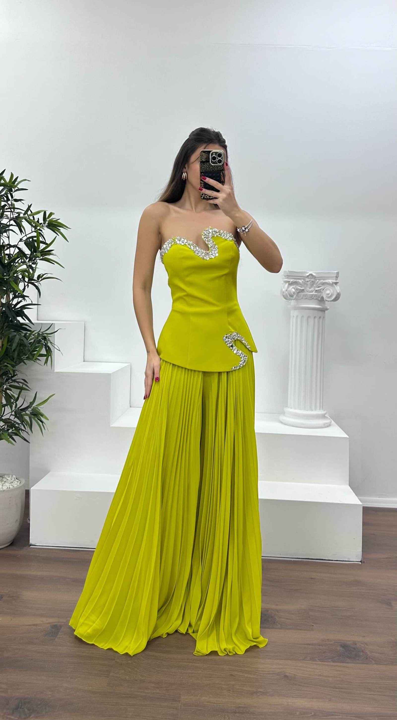 • Fıstık Yeşili Straplez  Asimetrik Desen Taşlı Abiye Tulum