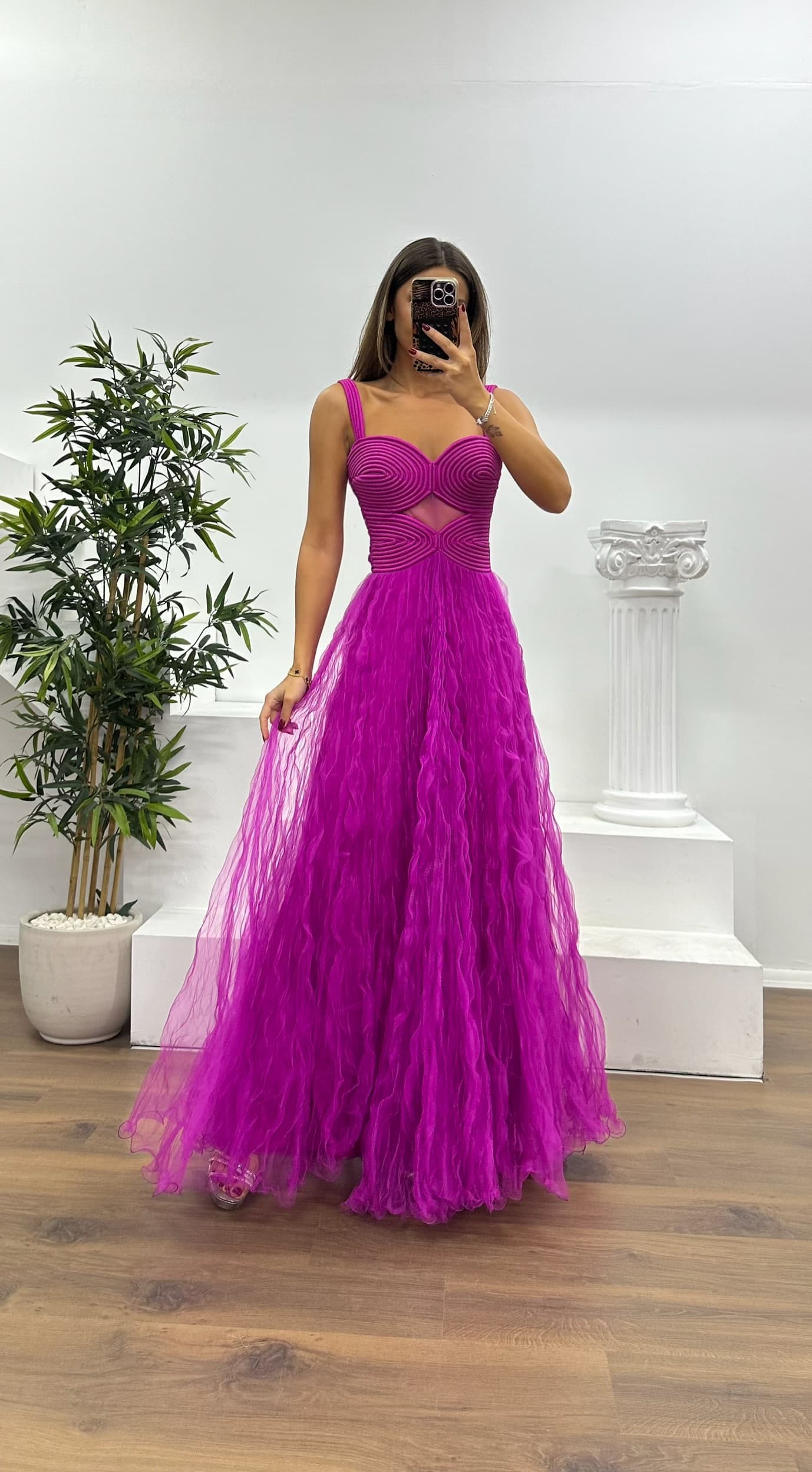 • Elma Yeşili Askılı Tül Abiye Elbise