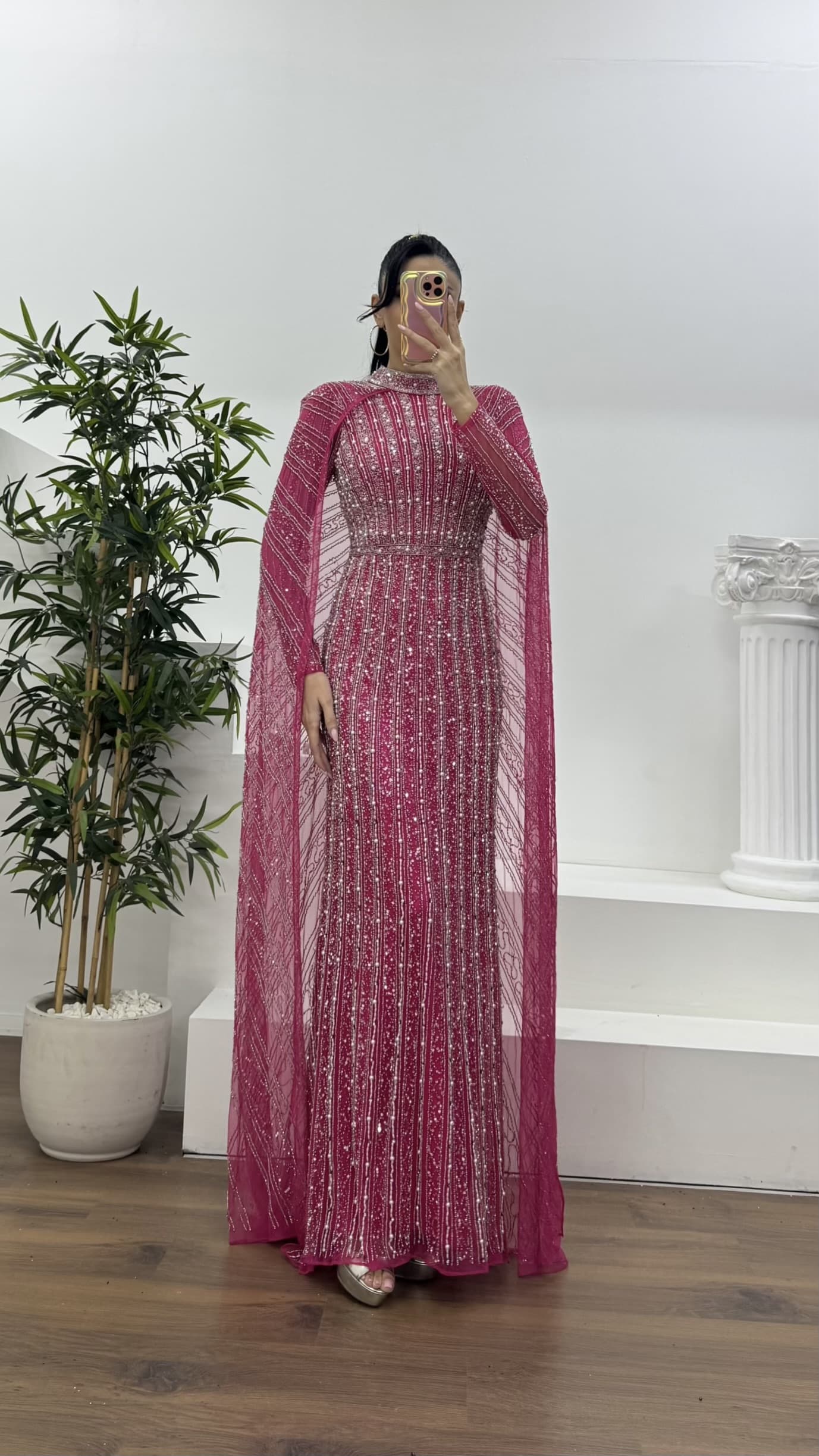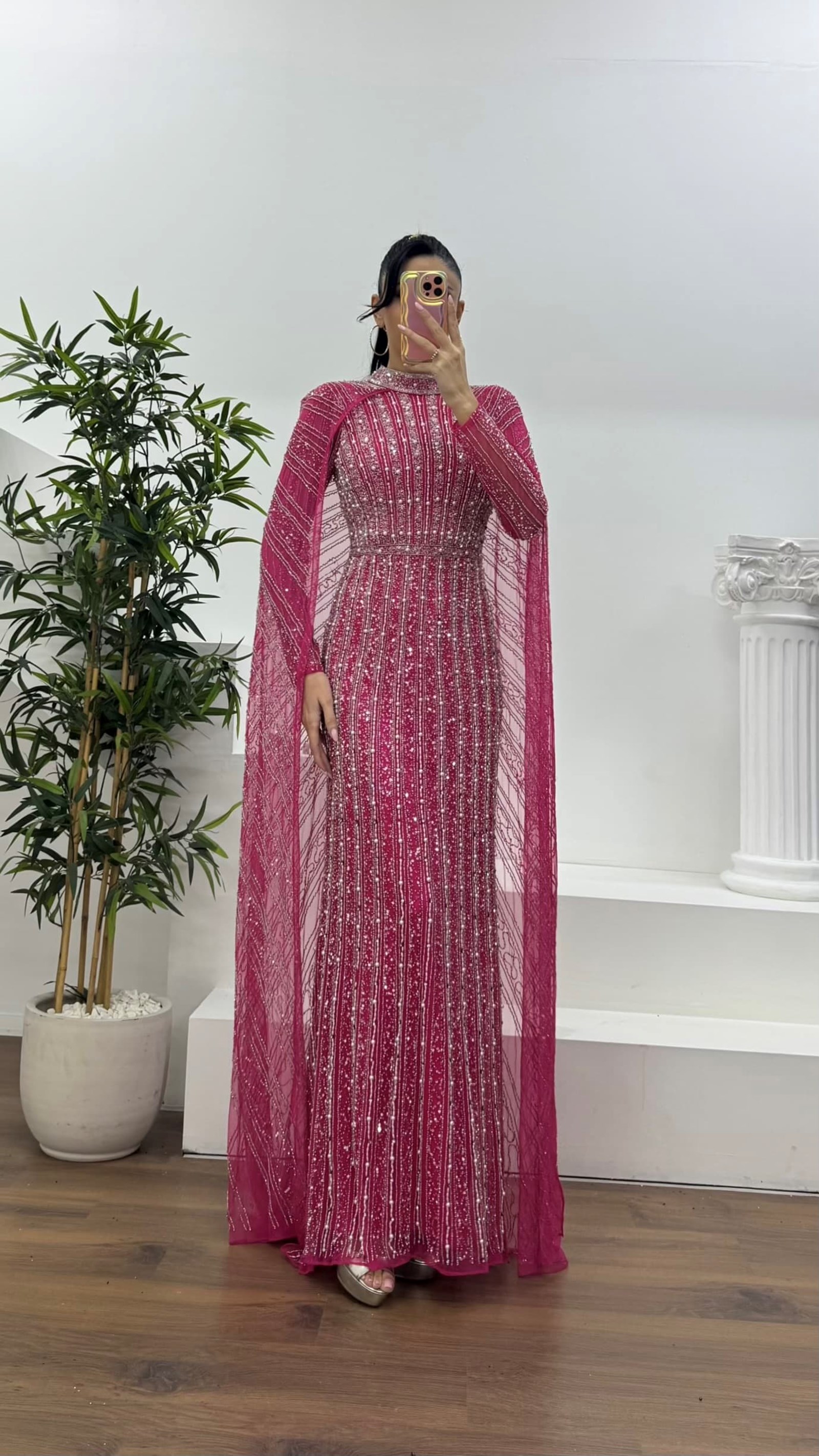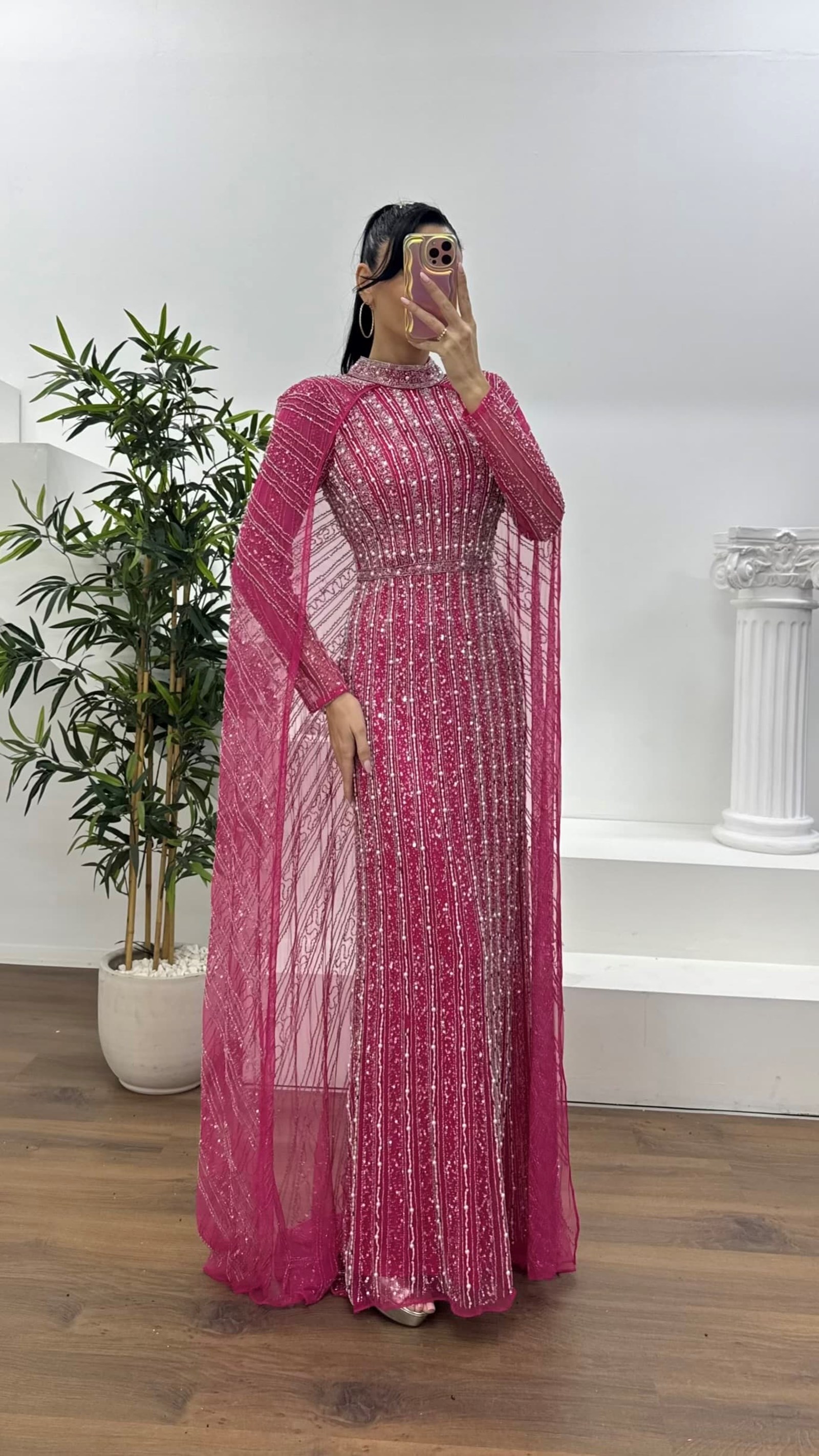• Fuşya Bisiklet Yaka Pelerinli Boncuk İşlemeli Abiye Elbise