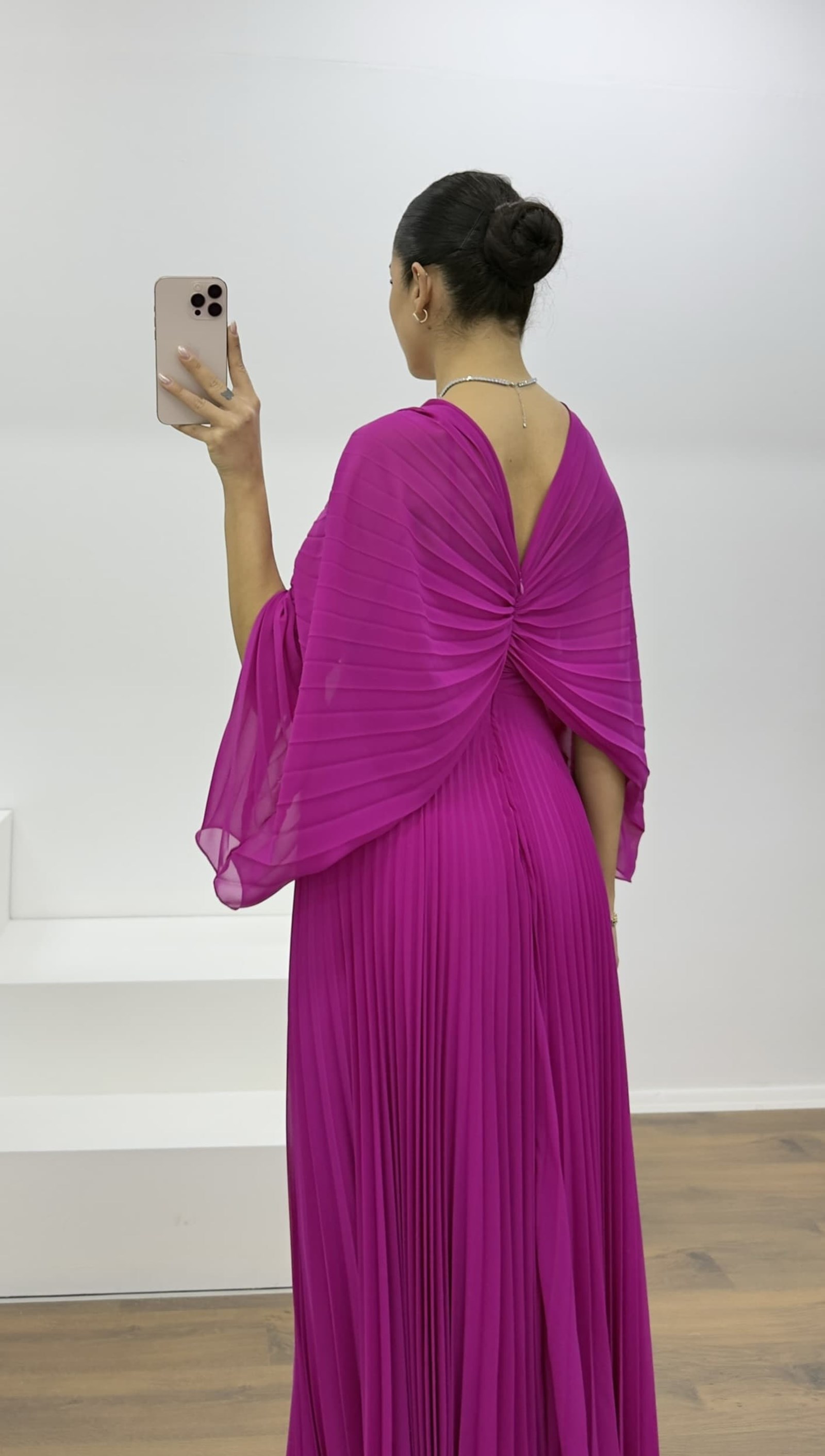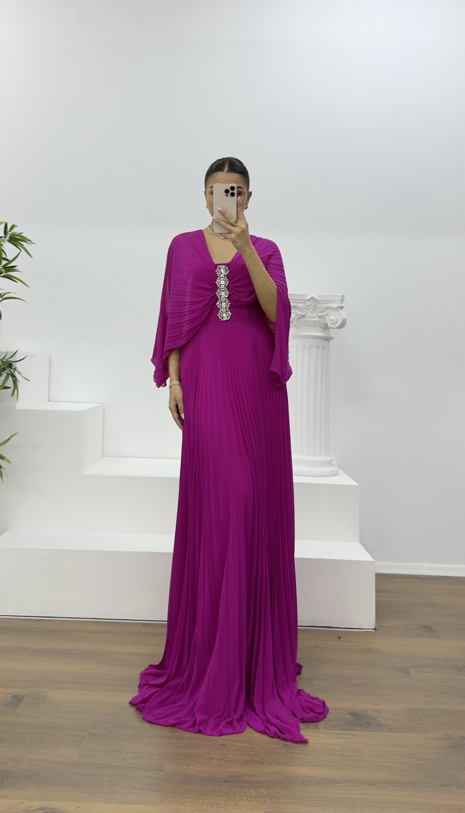 • Fuşya Broş Detaylı Melek Kanadı Şifon Abiye Elbise