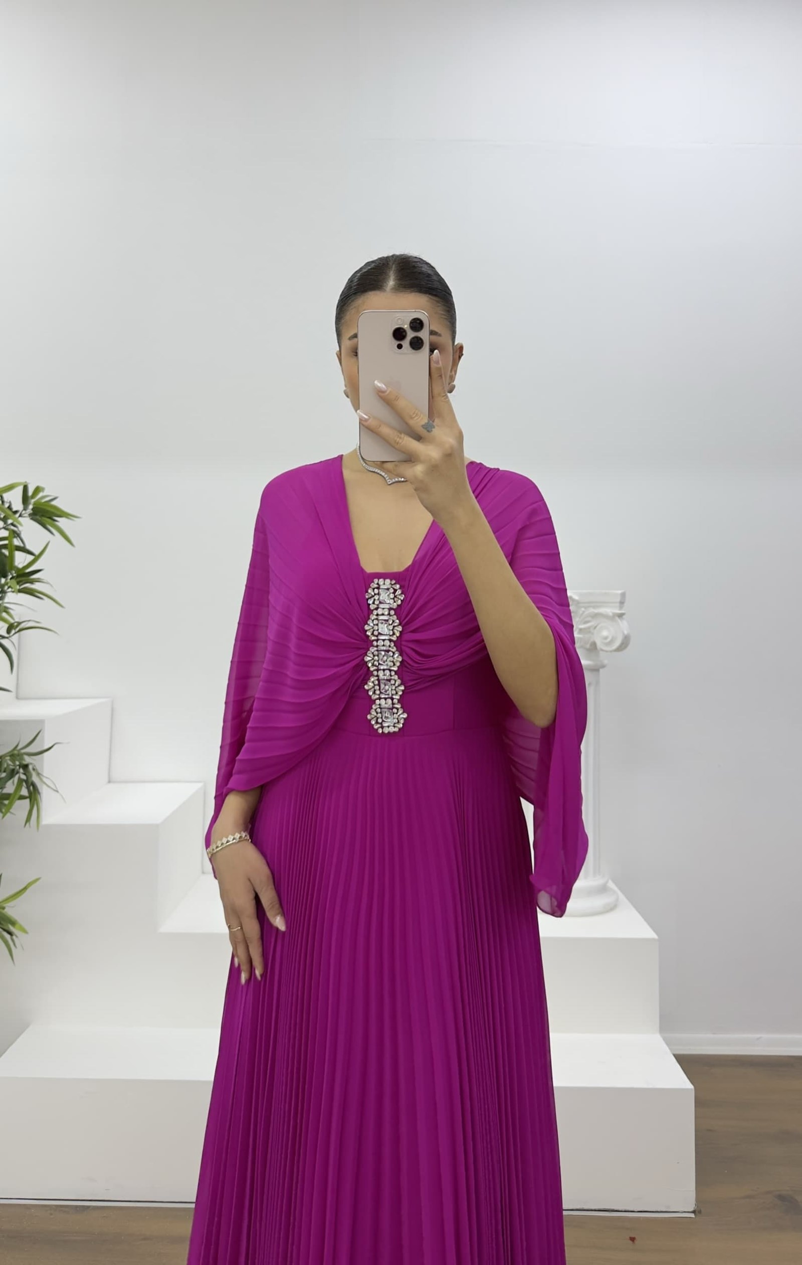 Fuşya Broş Detaylı Melek Kanadı Şifon Abiye Elbise