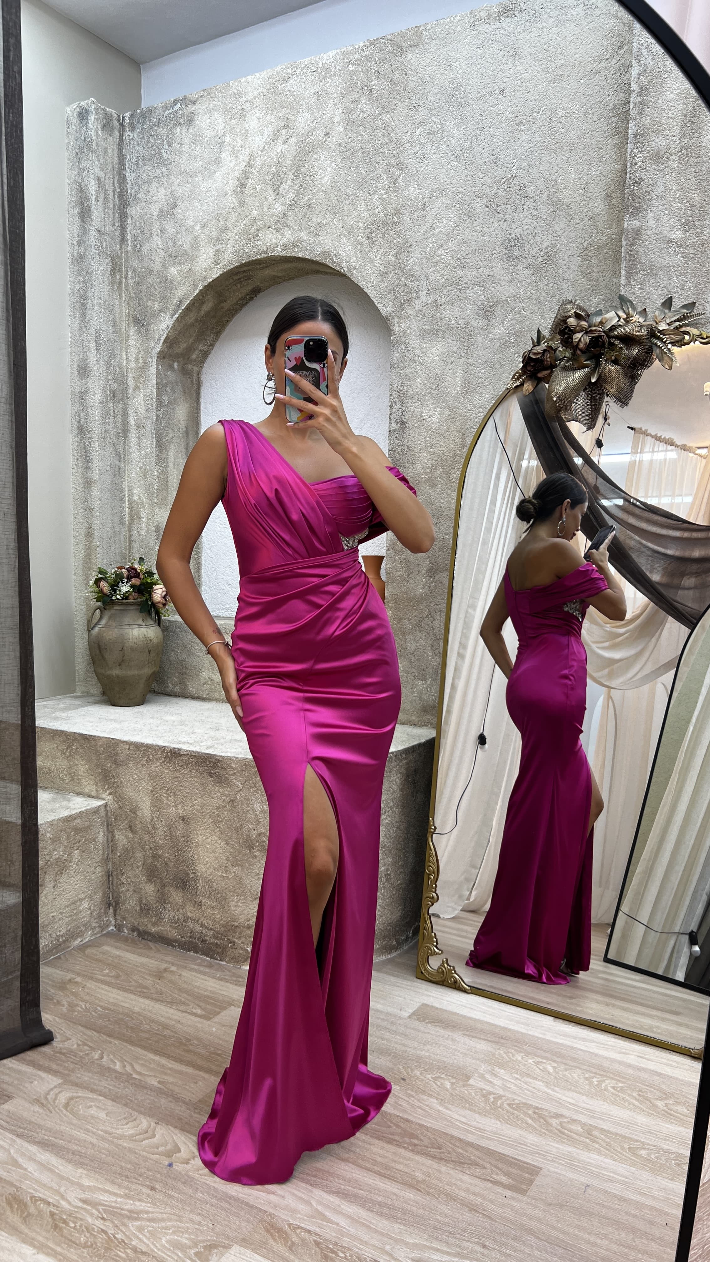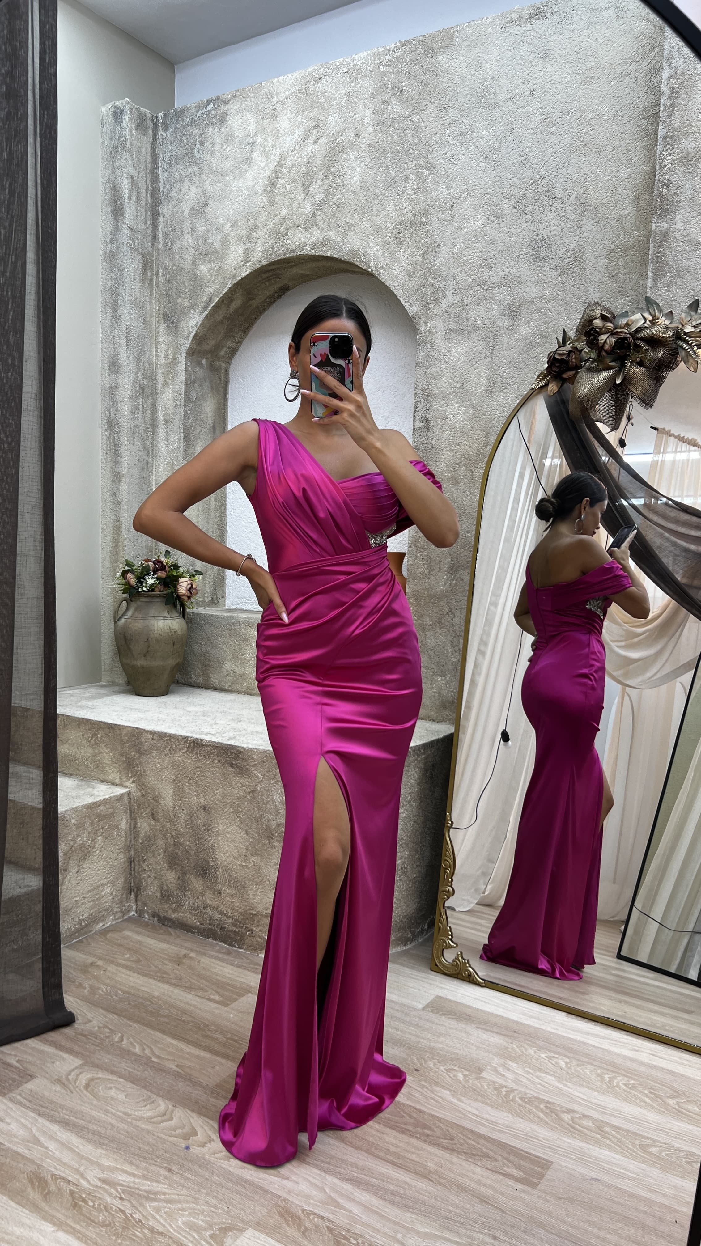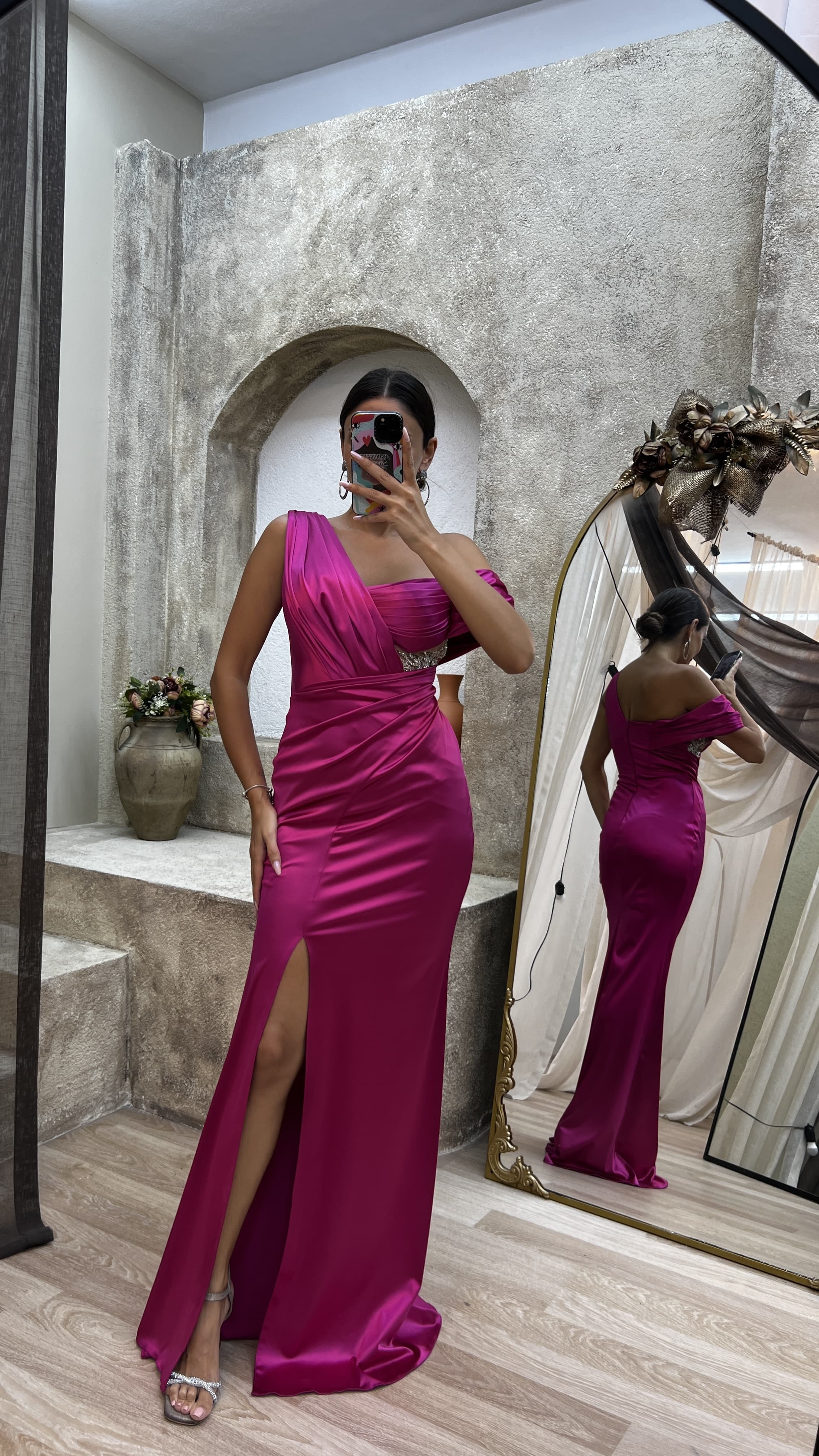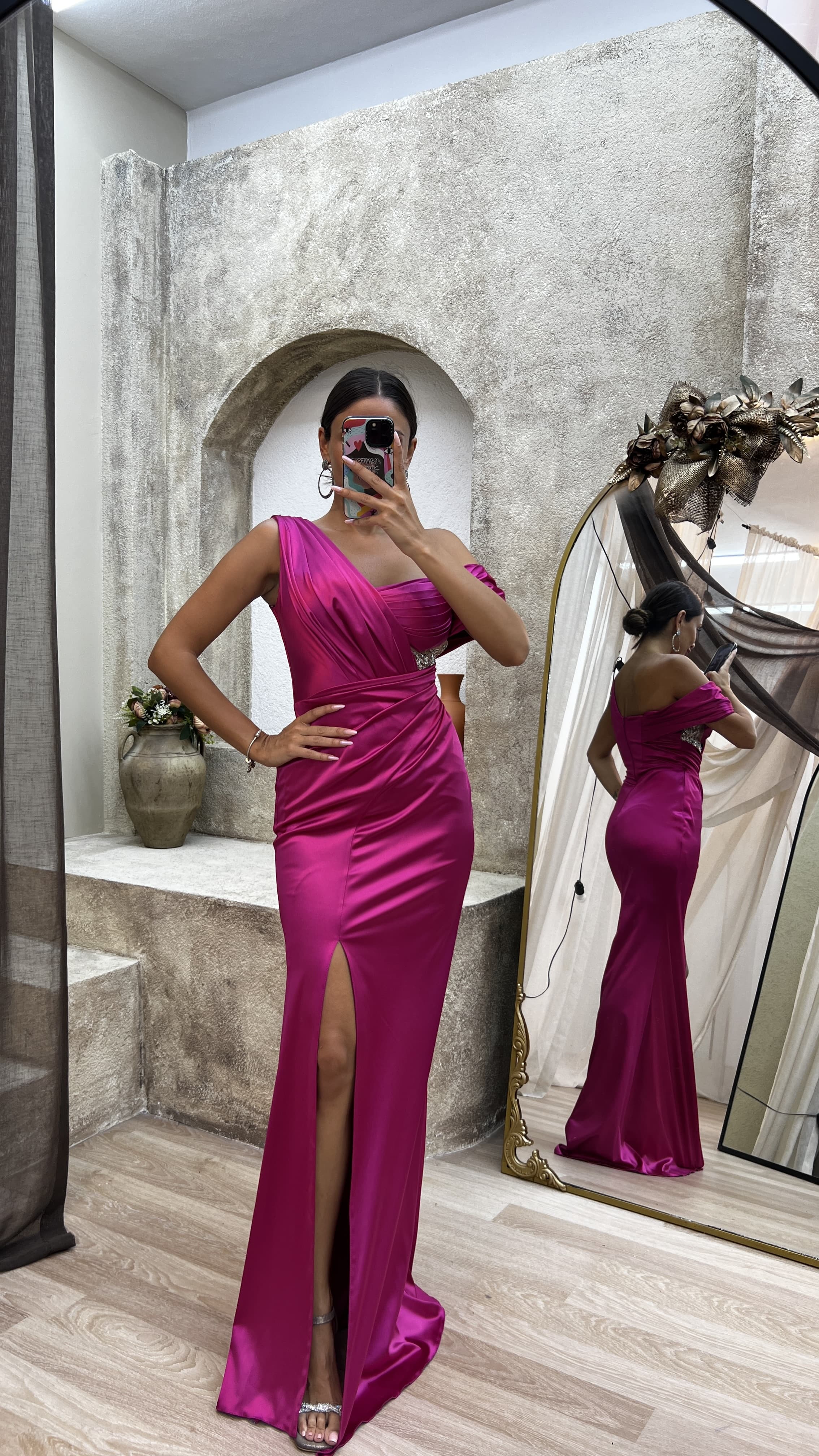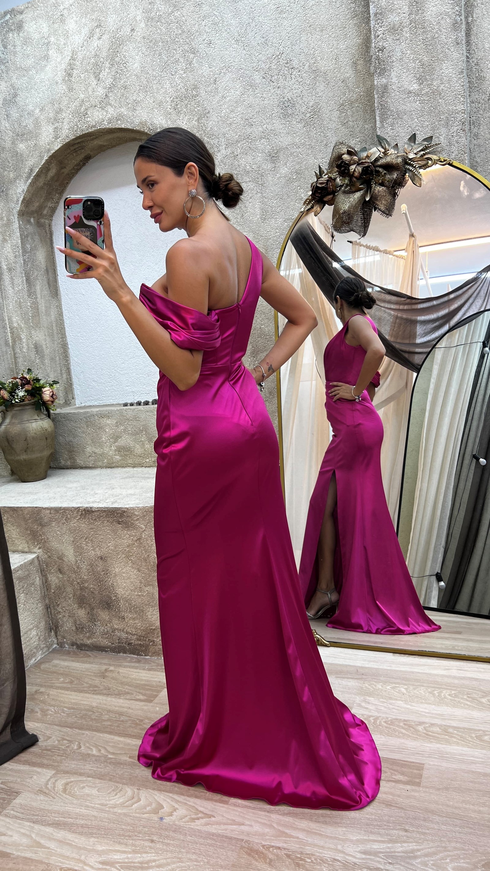 • Fuşya Göğüs Detay Yırtmaçlı Saten Abiye Elbise