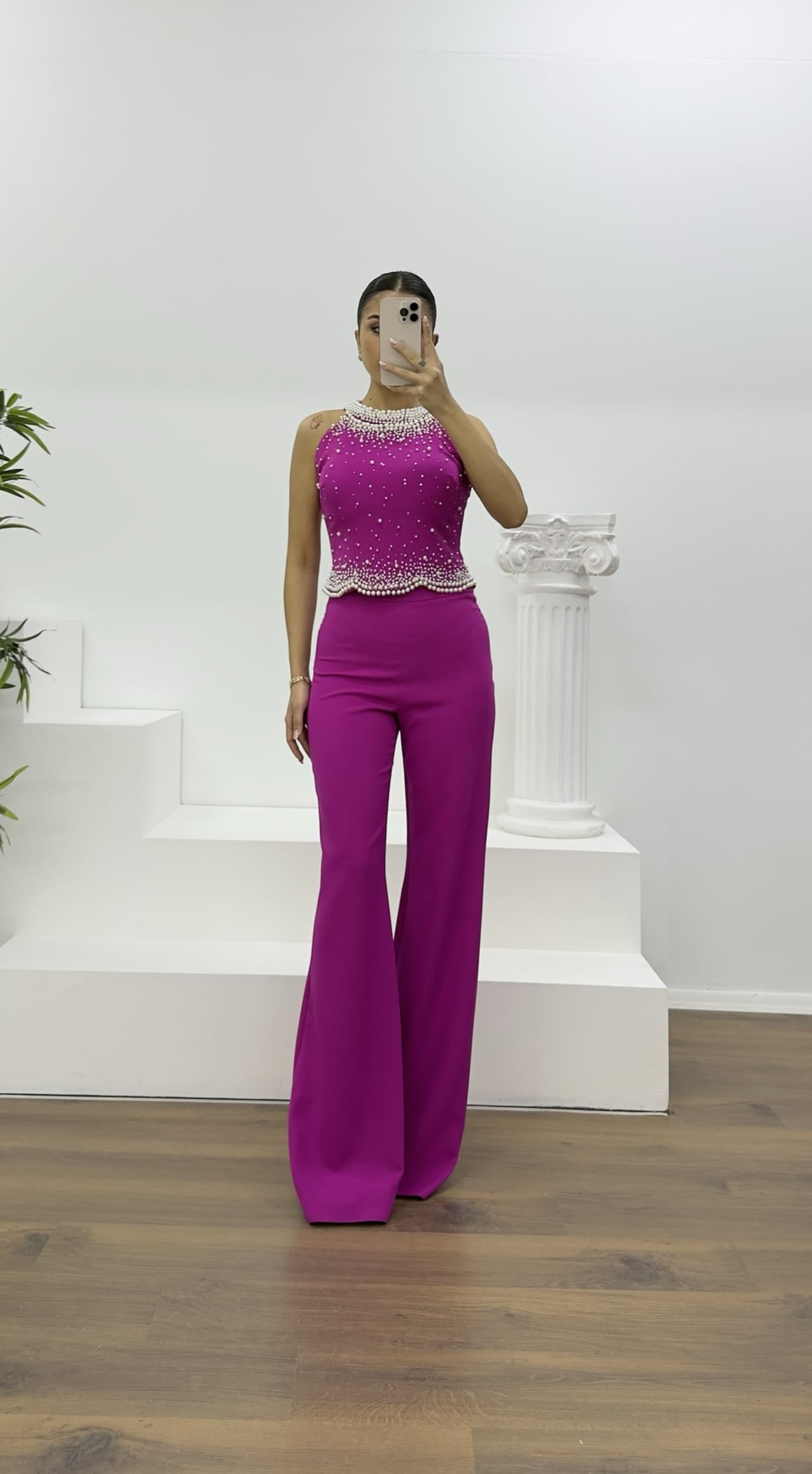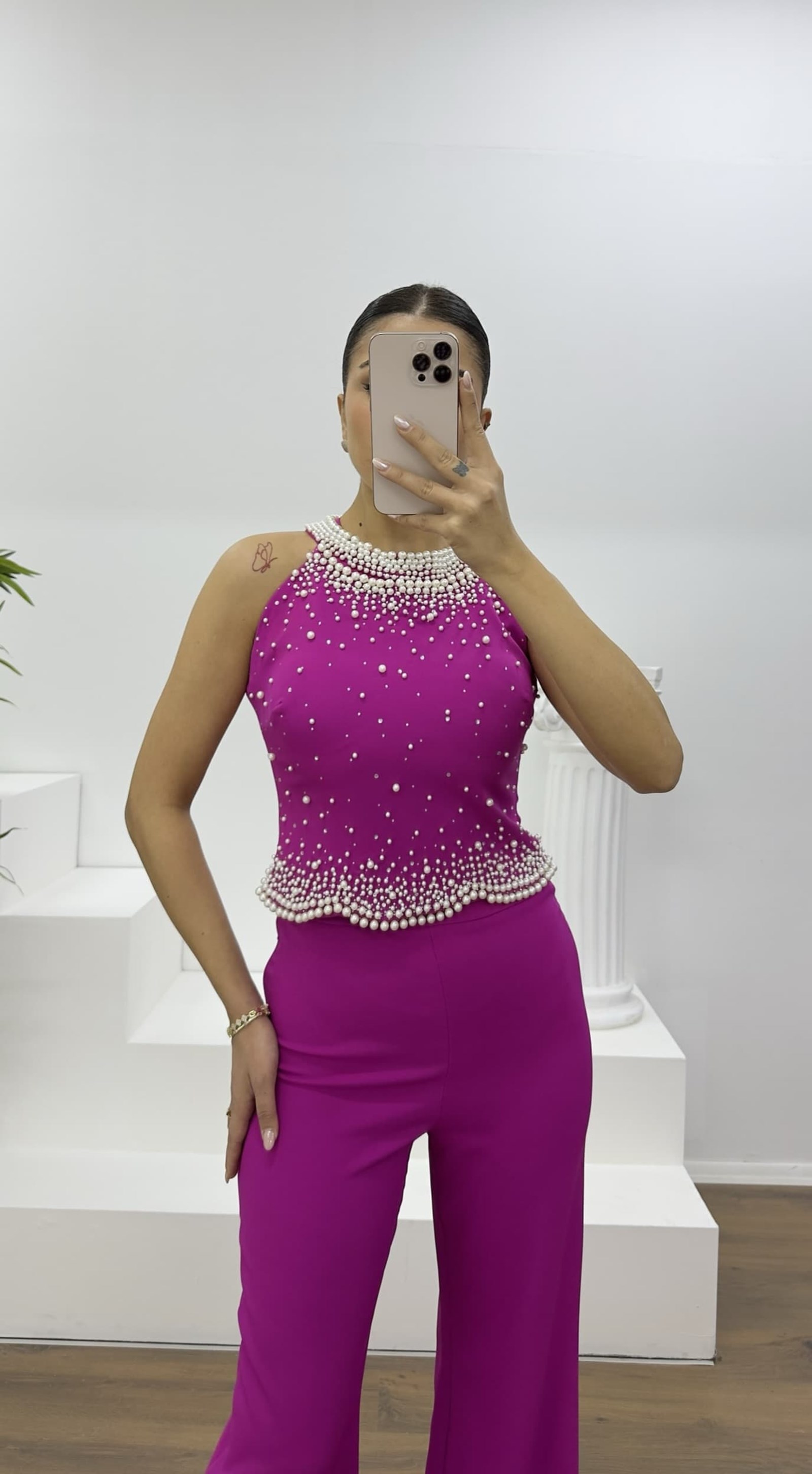 • Fuşya İnci Detaylı Halter Yaka Abiye Takım
