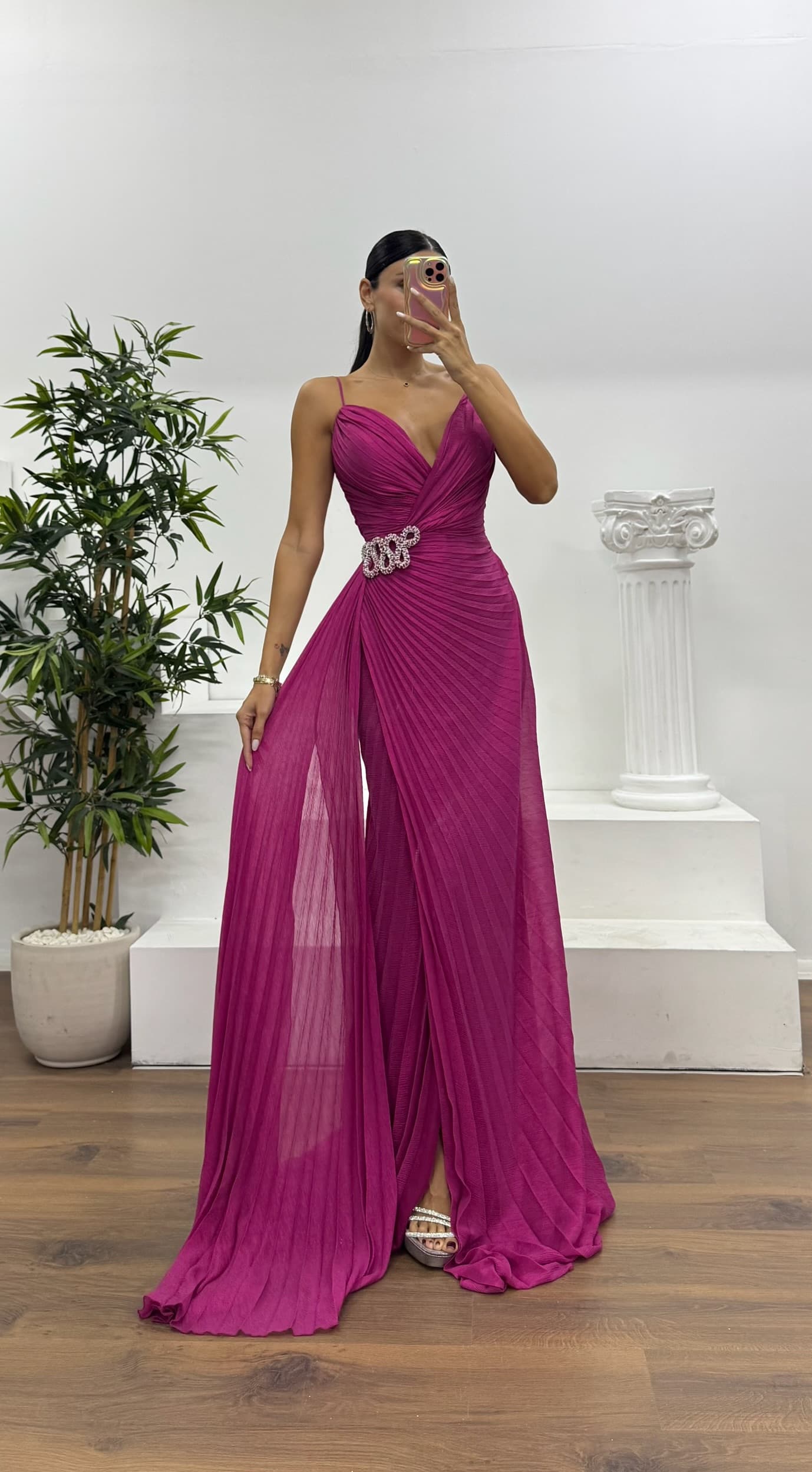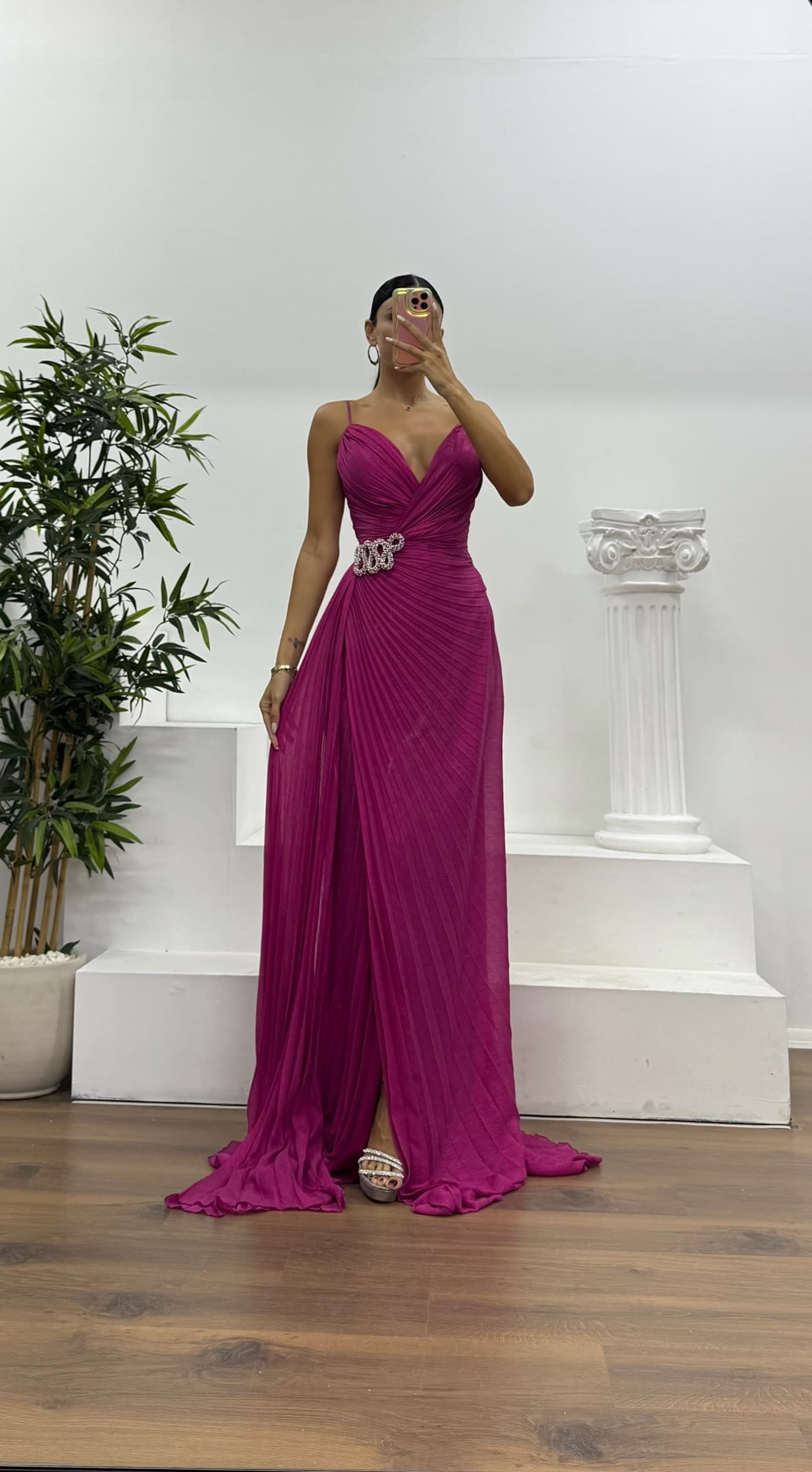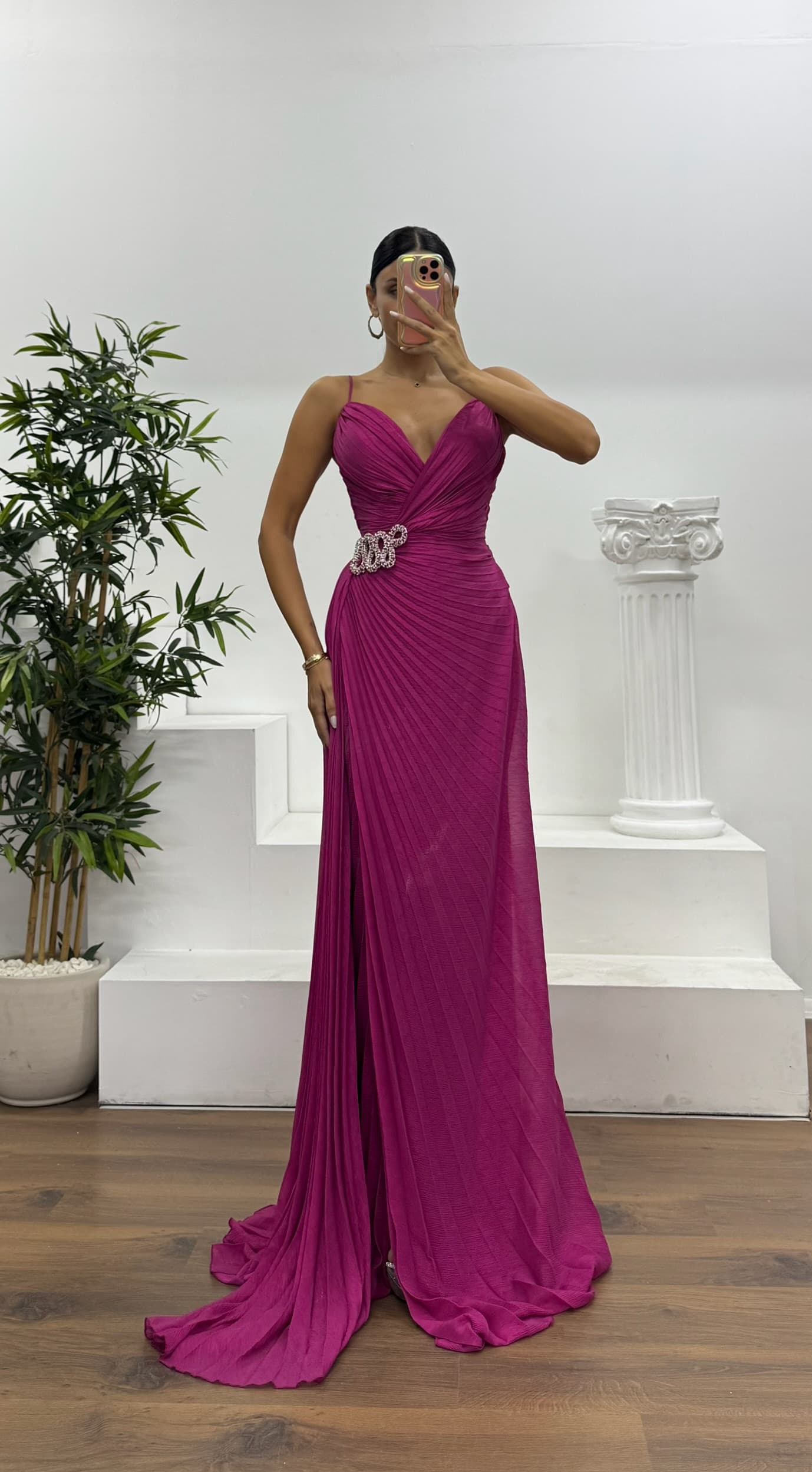 Ürün 36-44 bedene kadar uyumlu, göğüs pedli, astarlı, yırtmaçlı, sırt capraz ip ve fermuar kapamalı, bel detay abiye olarak tasarlanmıştır.