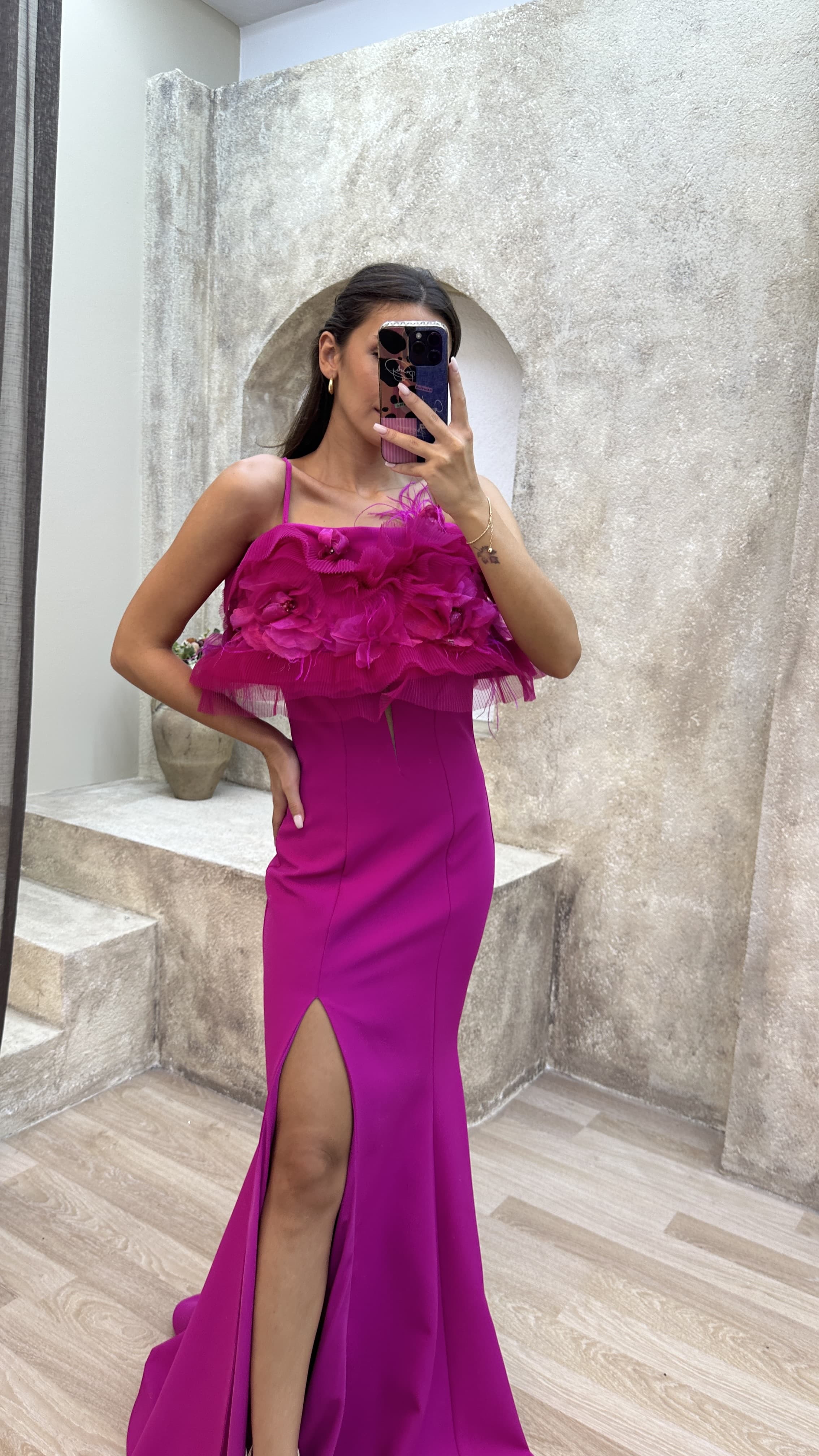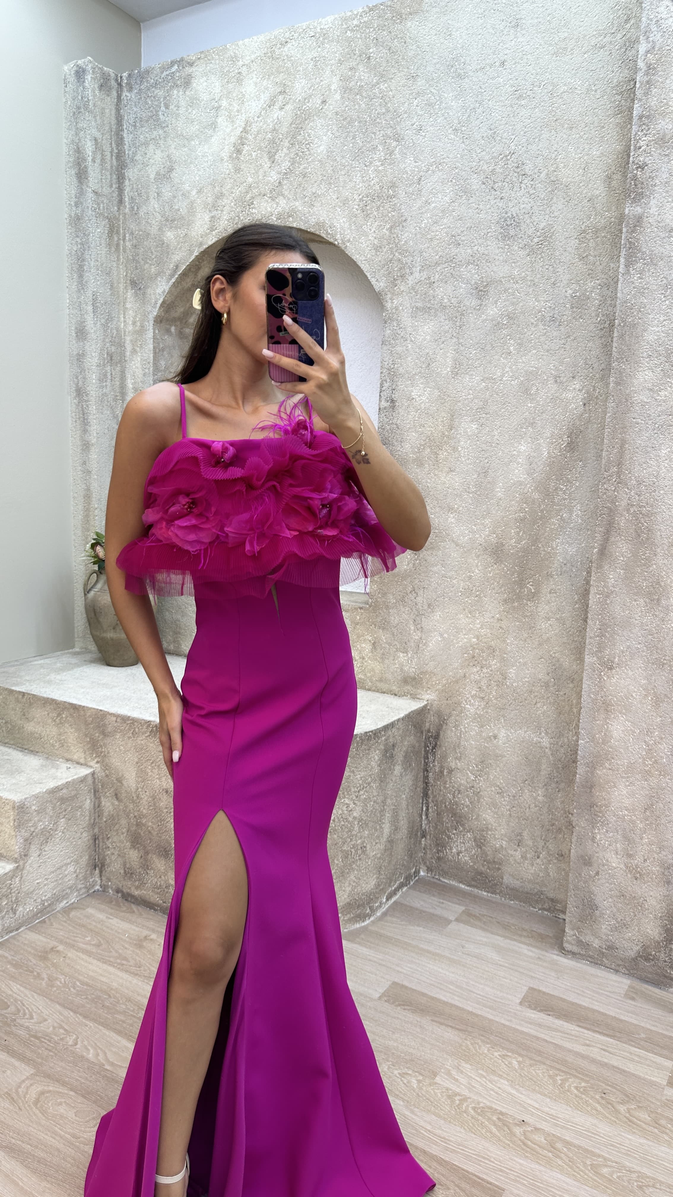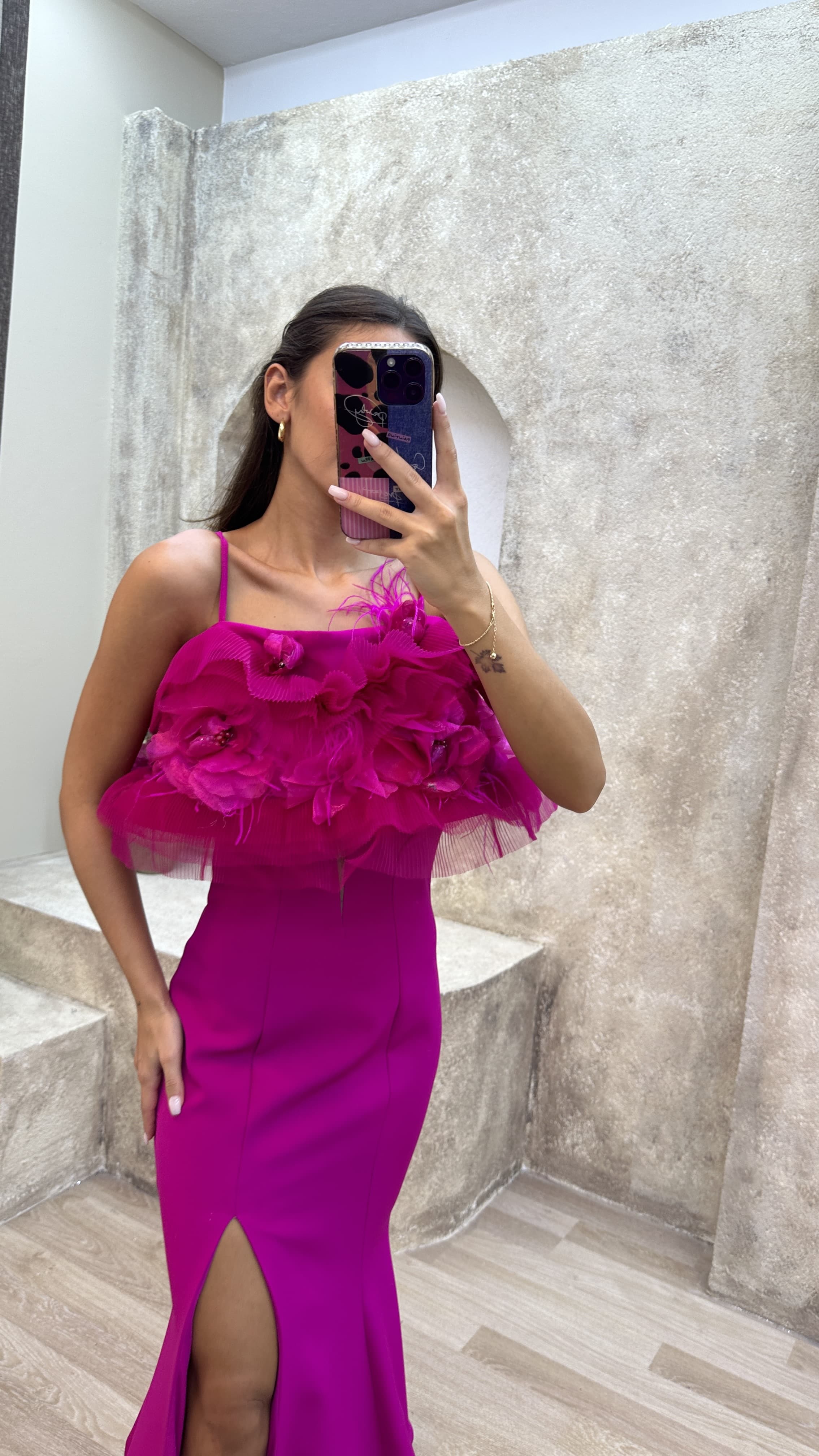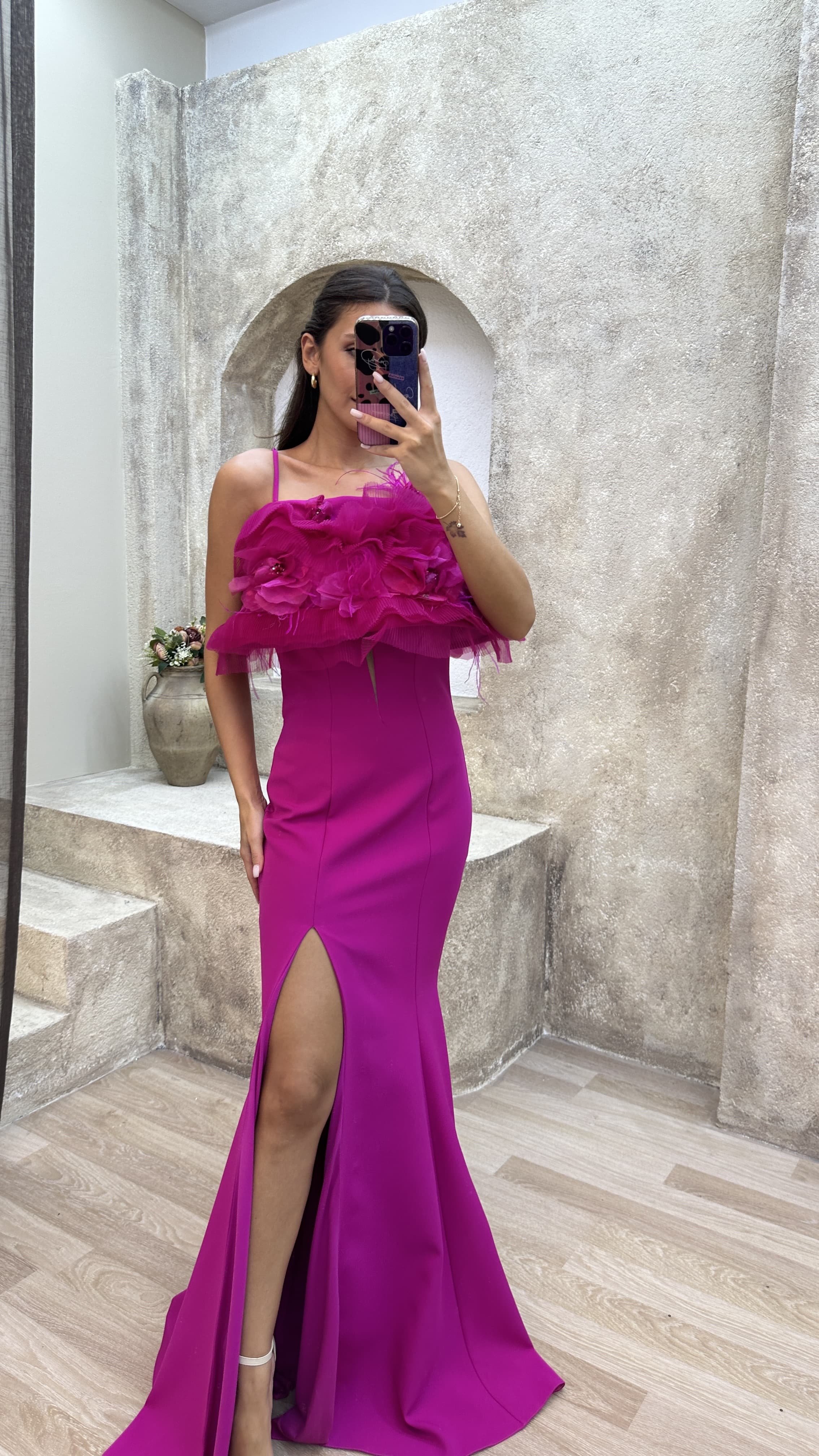 Fuşya İp Askılı Göğsü Tül Detay Abiye Elbise