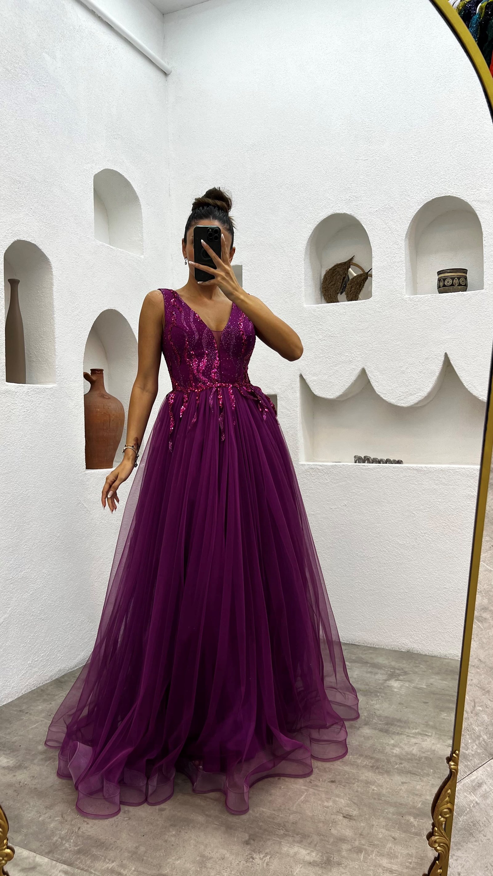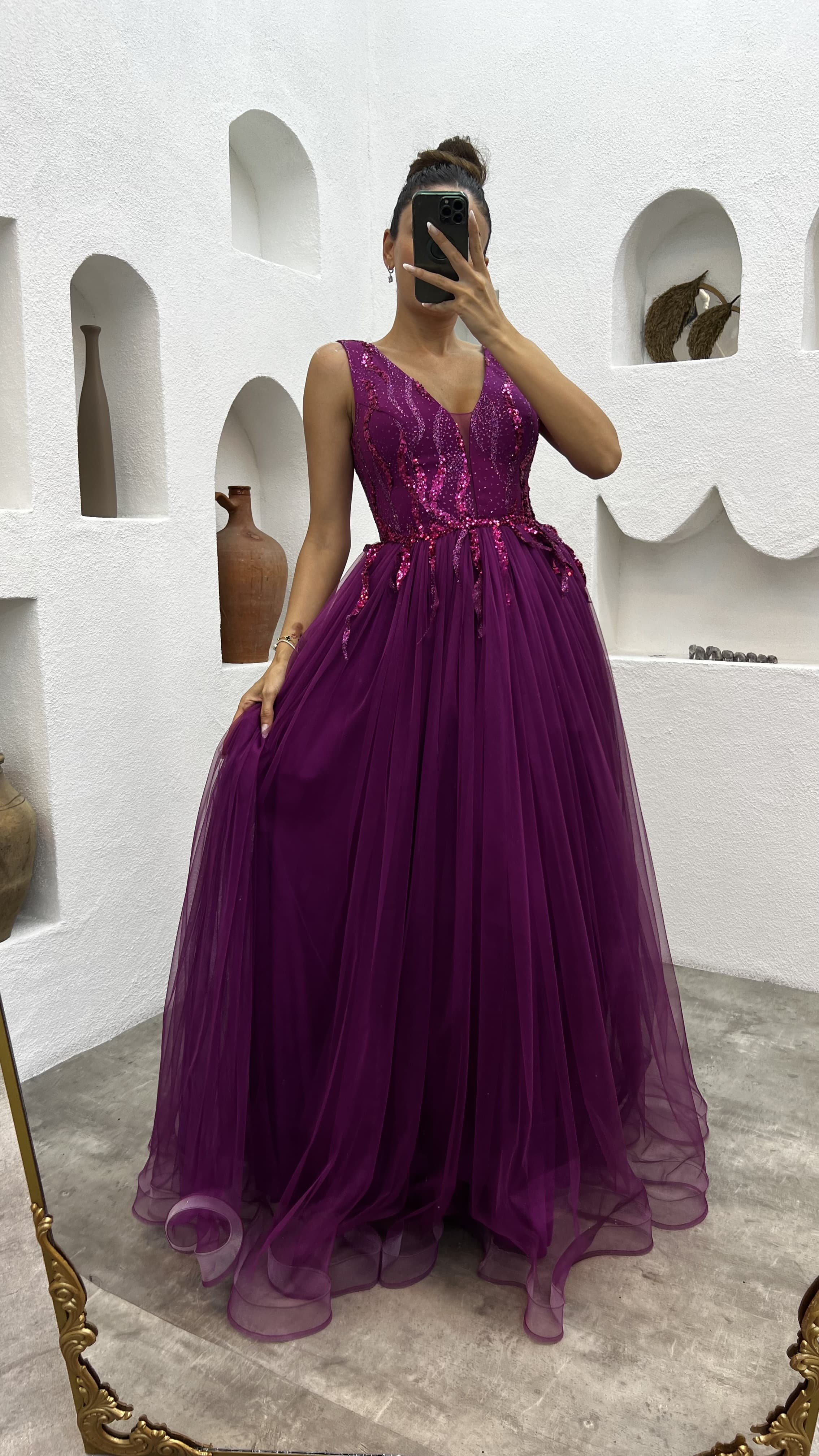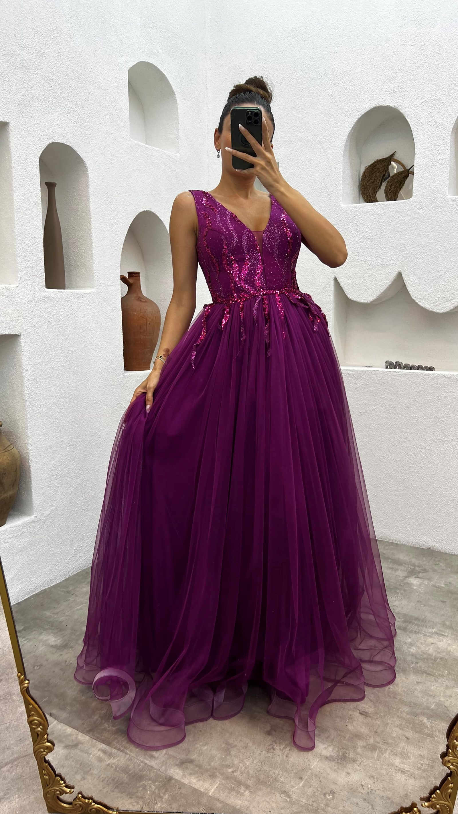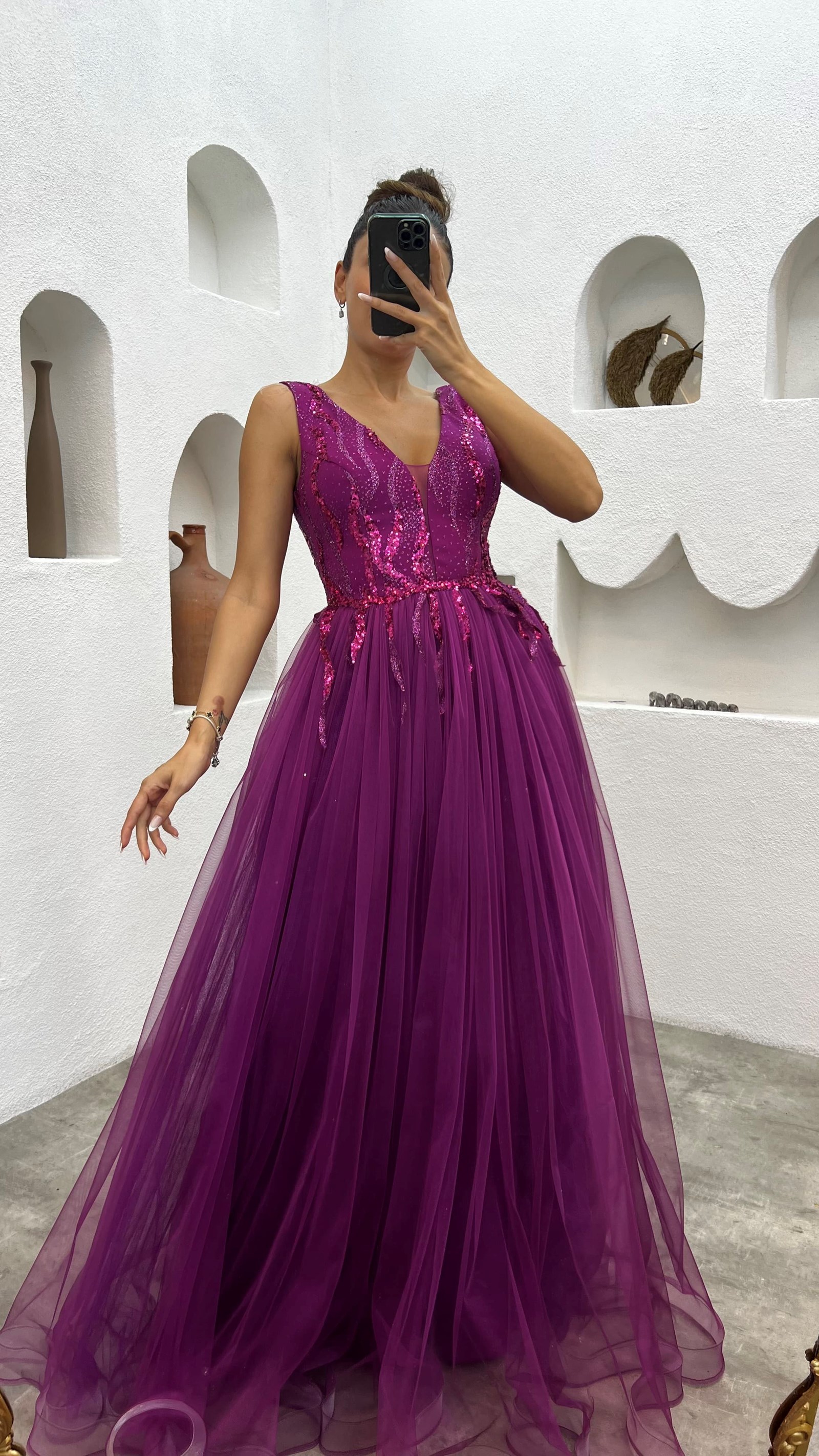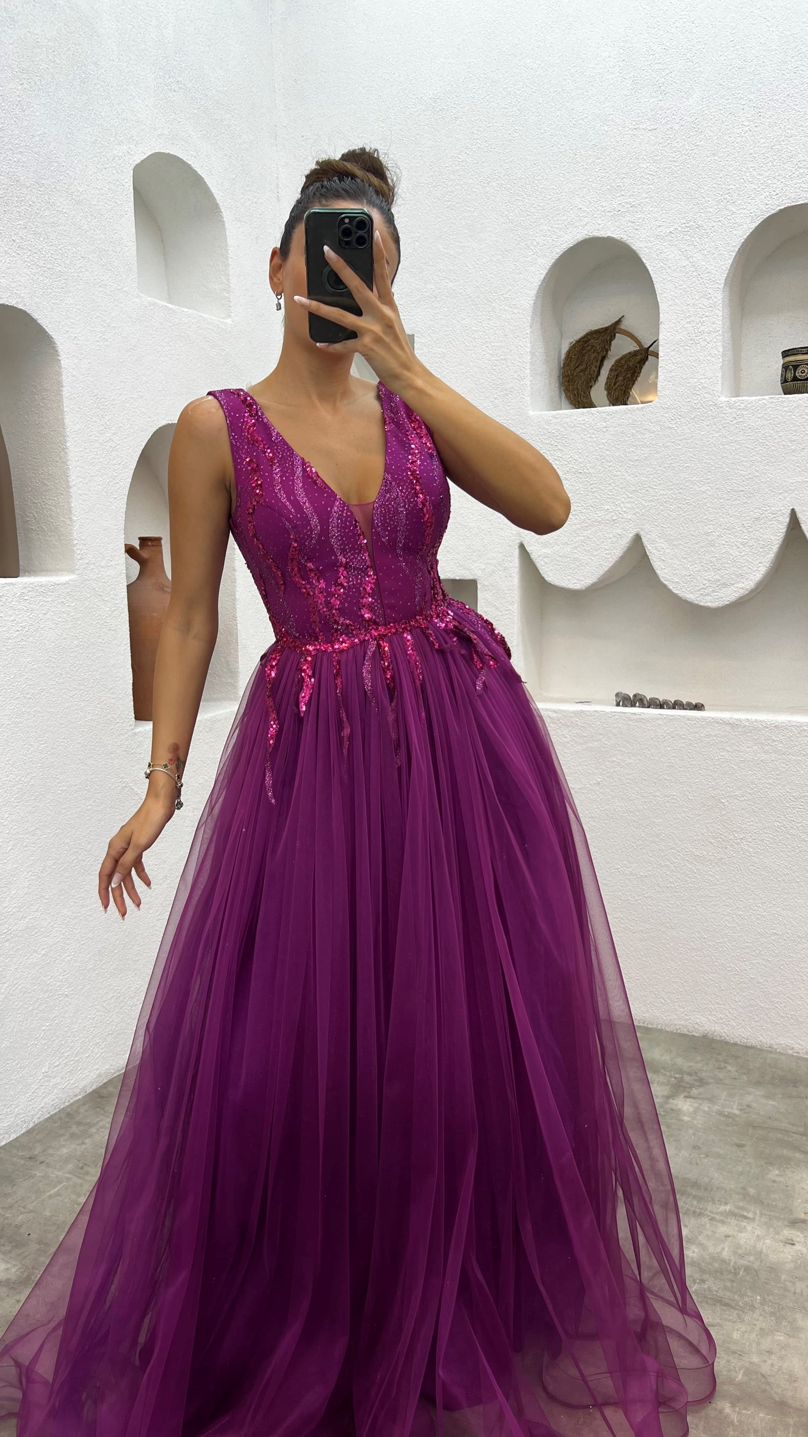 • Fuşya İşlemeli Pliseli Tül abiye Elbise
