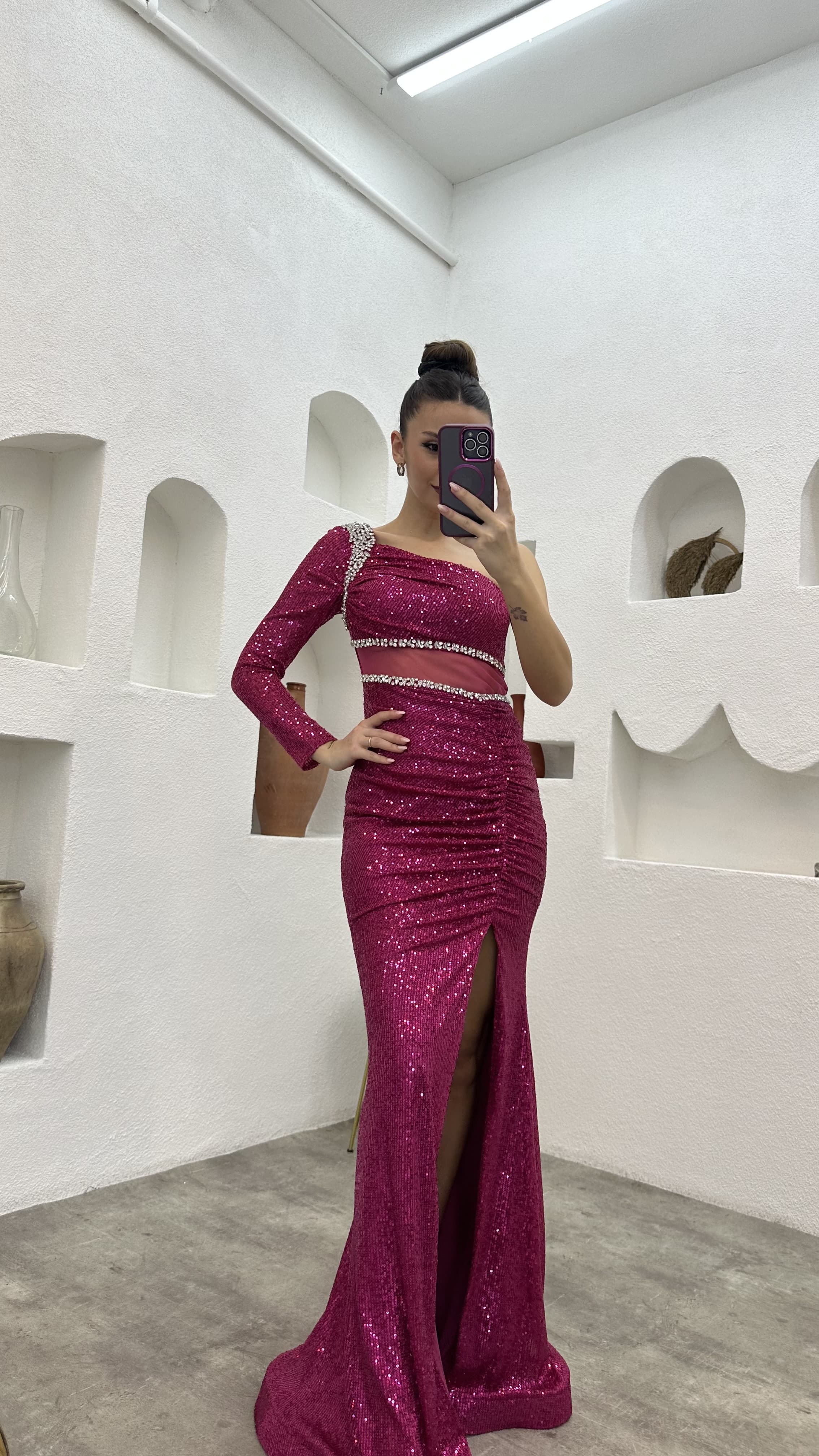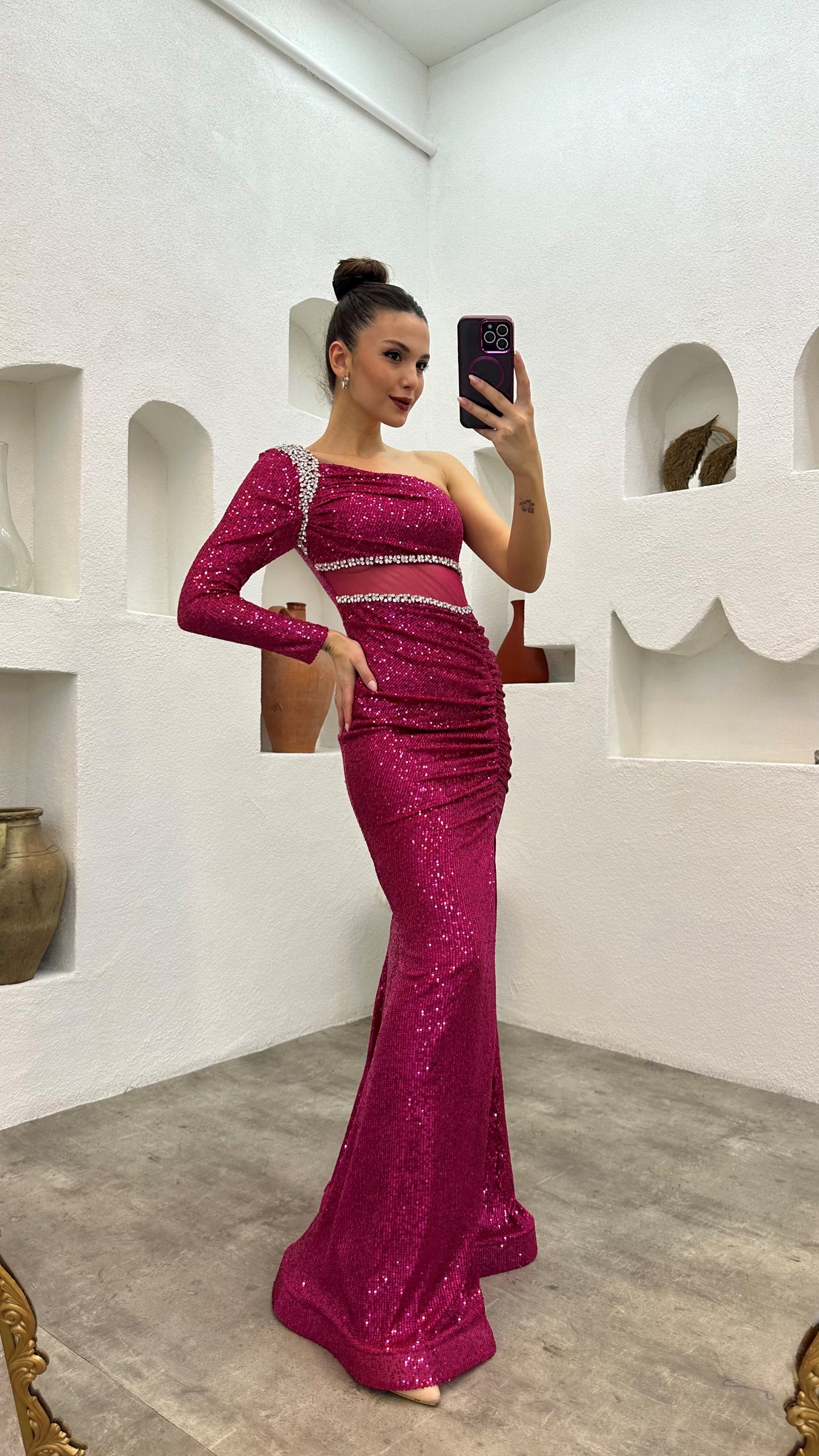 Fuşya İşlemeli Transparan Detay Pul Payet Abiye Elbise