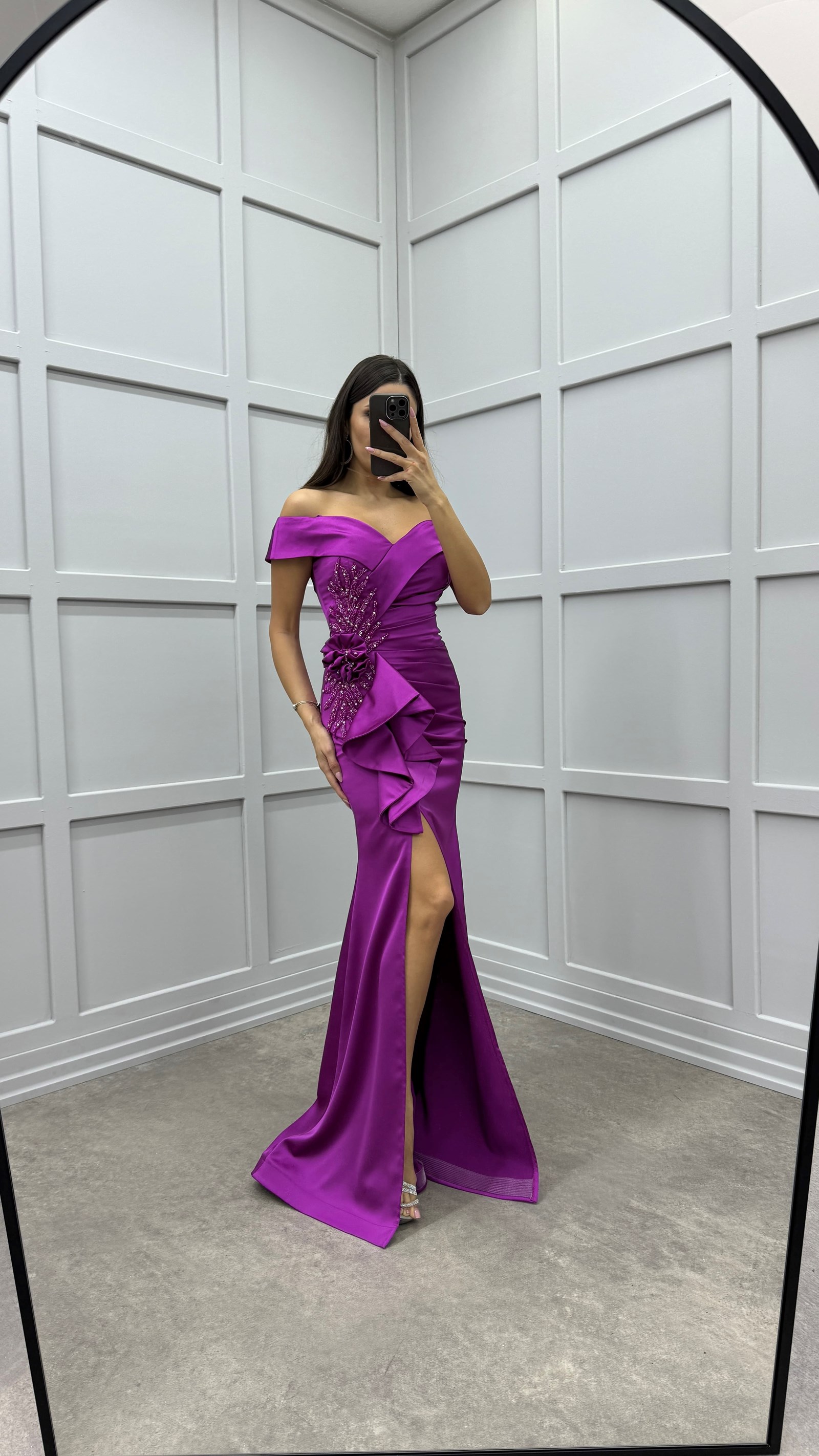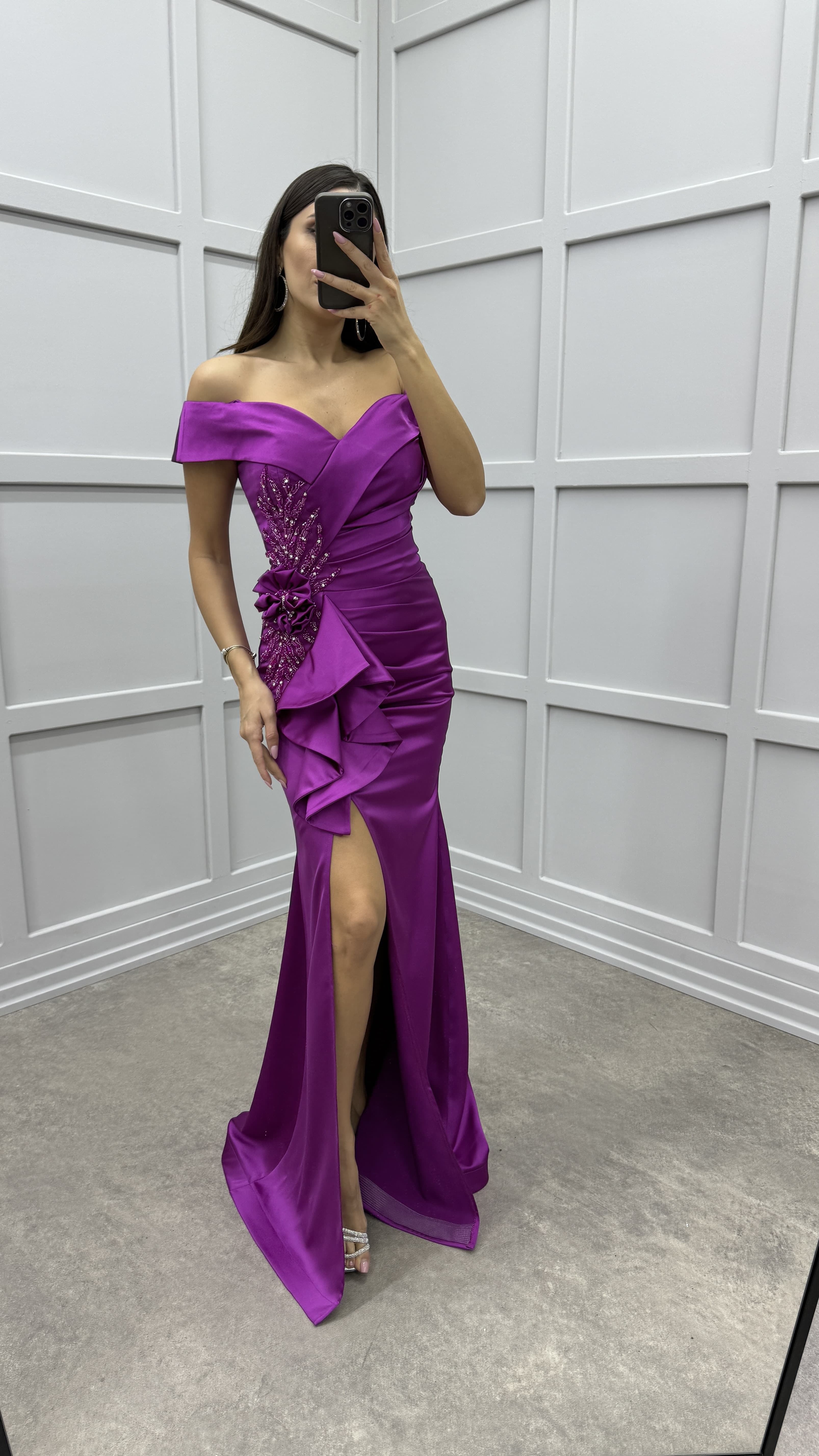 • Fuşya Kayık Yaka Göğsü İşlemeli Beli Volan Detay Tasarım Saten Abiye Elbise