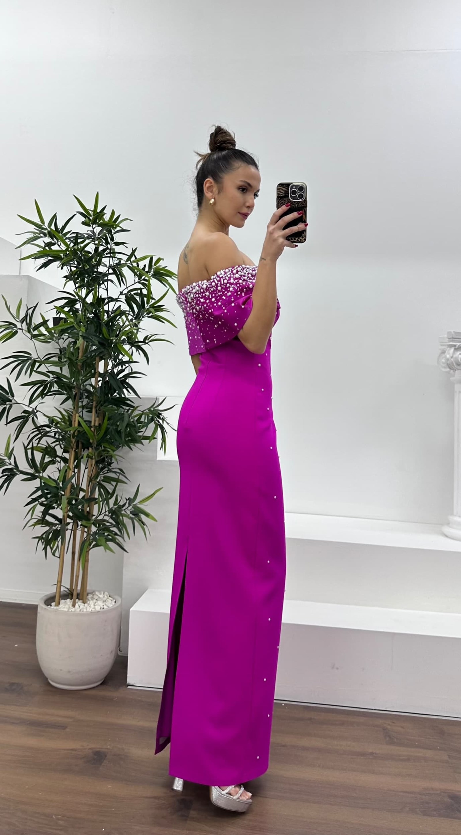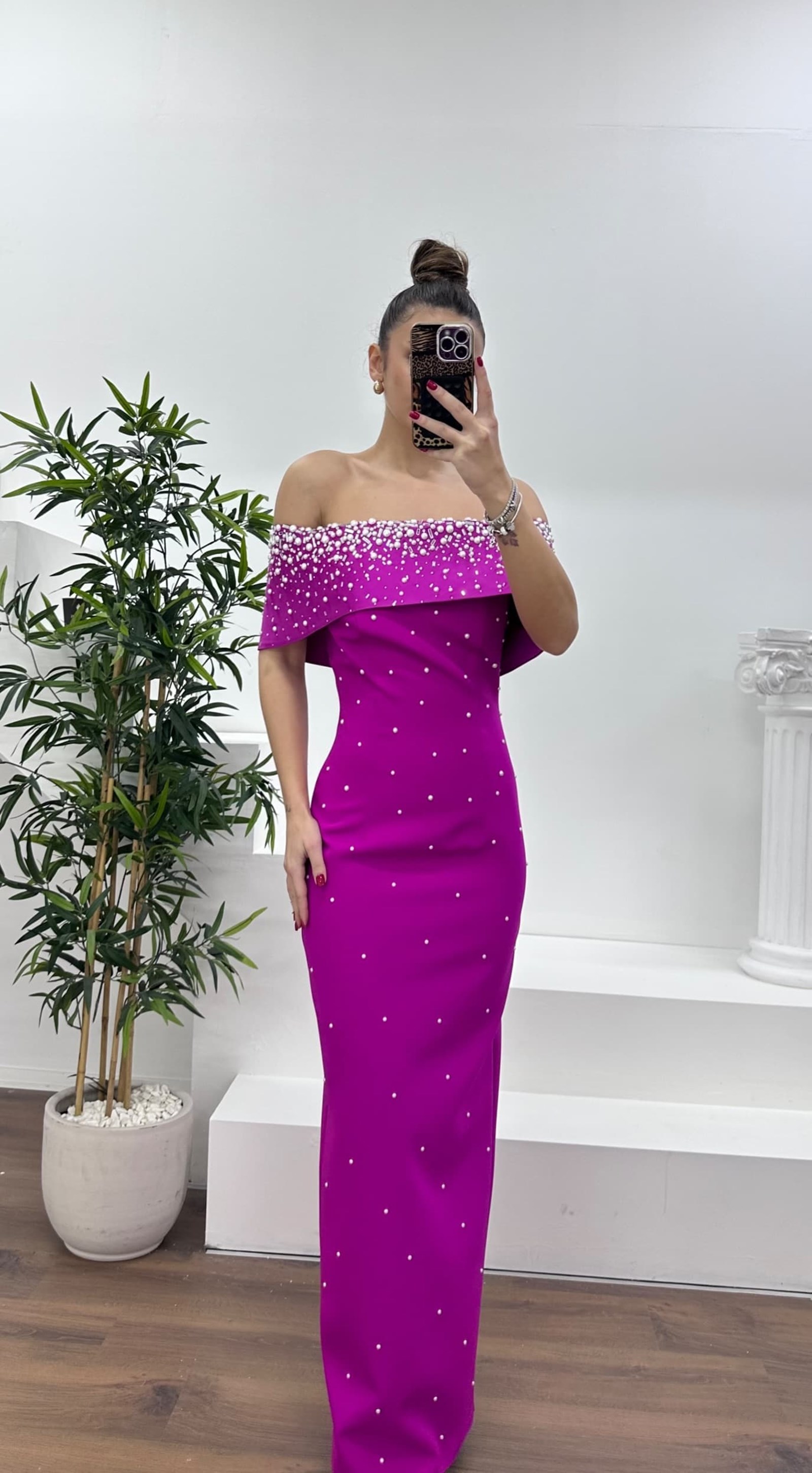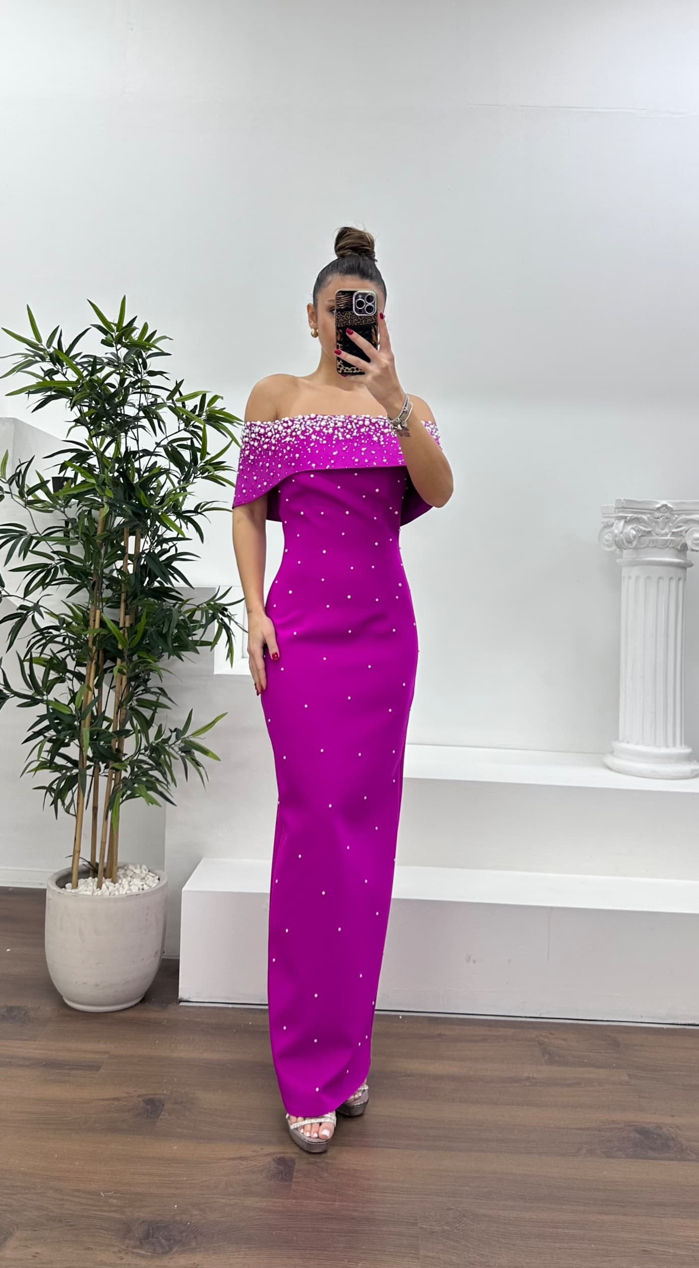 Fuşya Kayık Yaka İnci Detaylı Abiye Elbise
