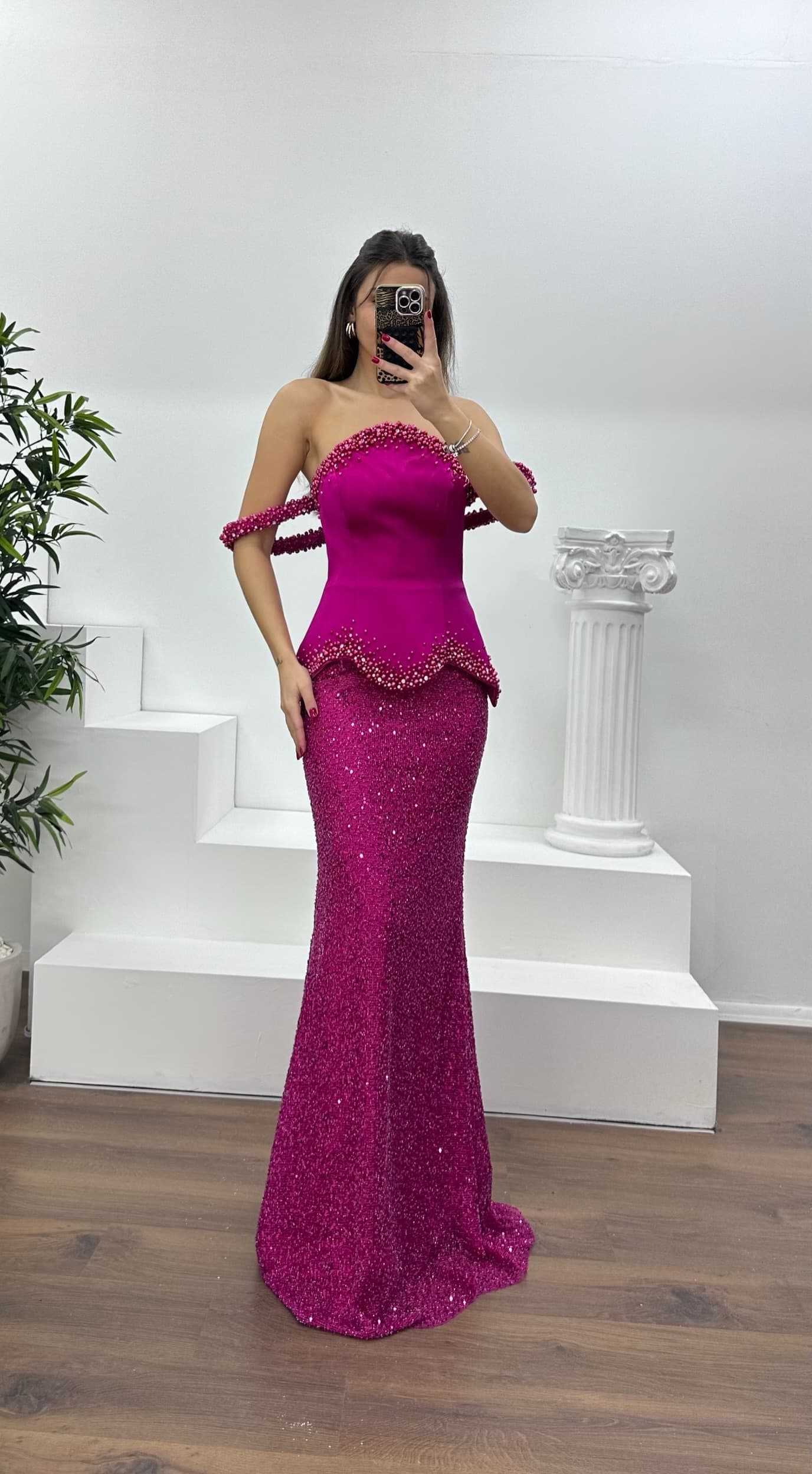 • Fuşya Kolları  Boncuklu Straplez Abiye Elbise