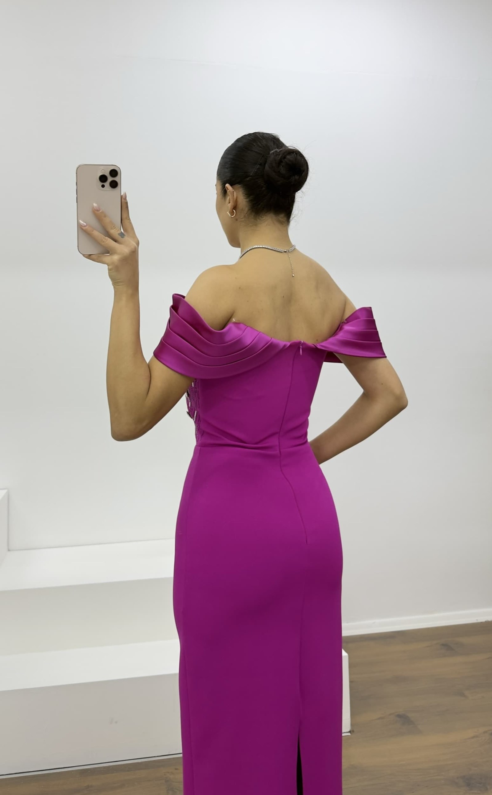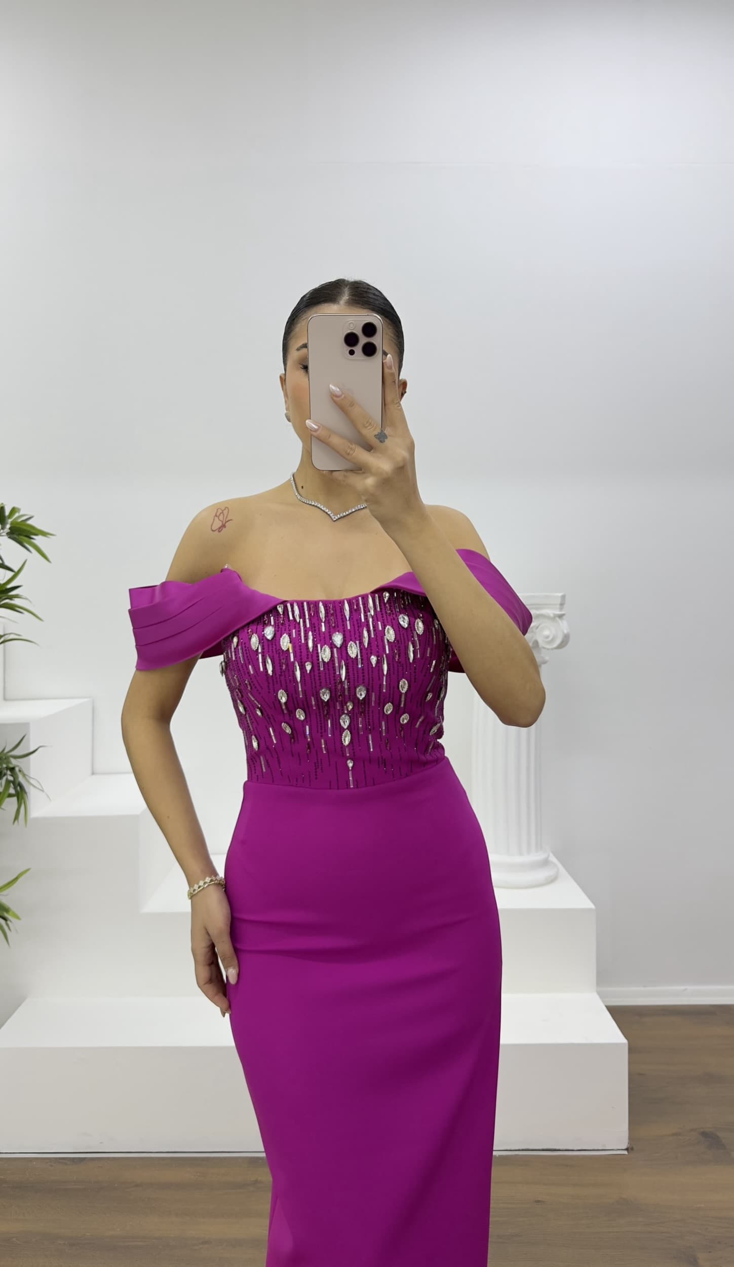 • Fuşya Kristal Işıltılı Omuz Detaylı Abiye Elbise