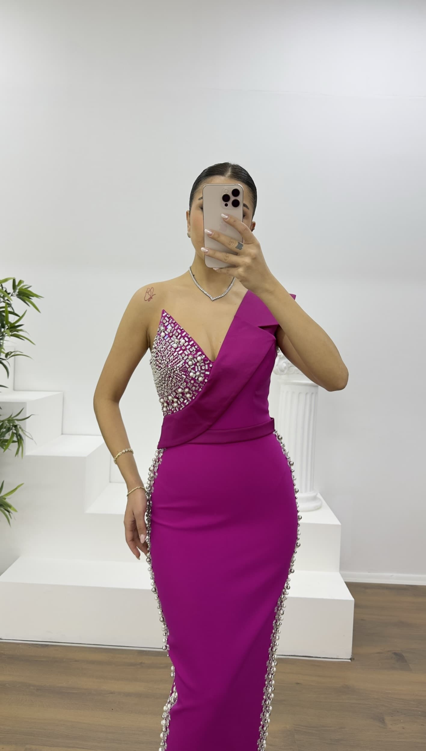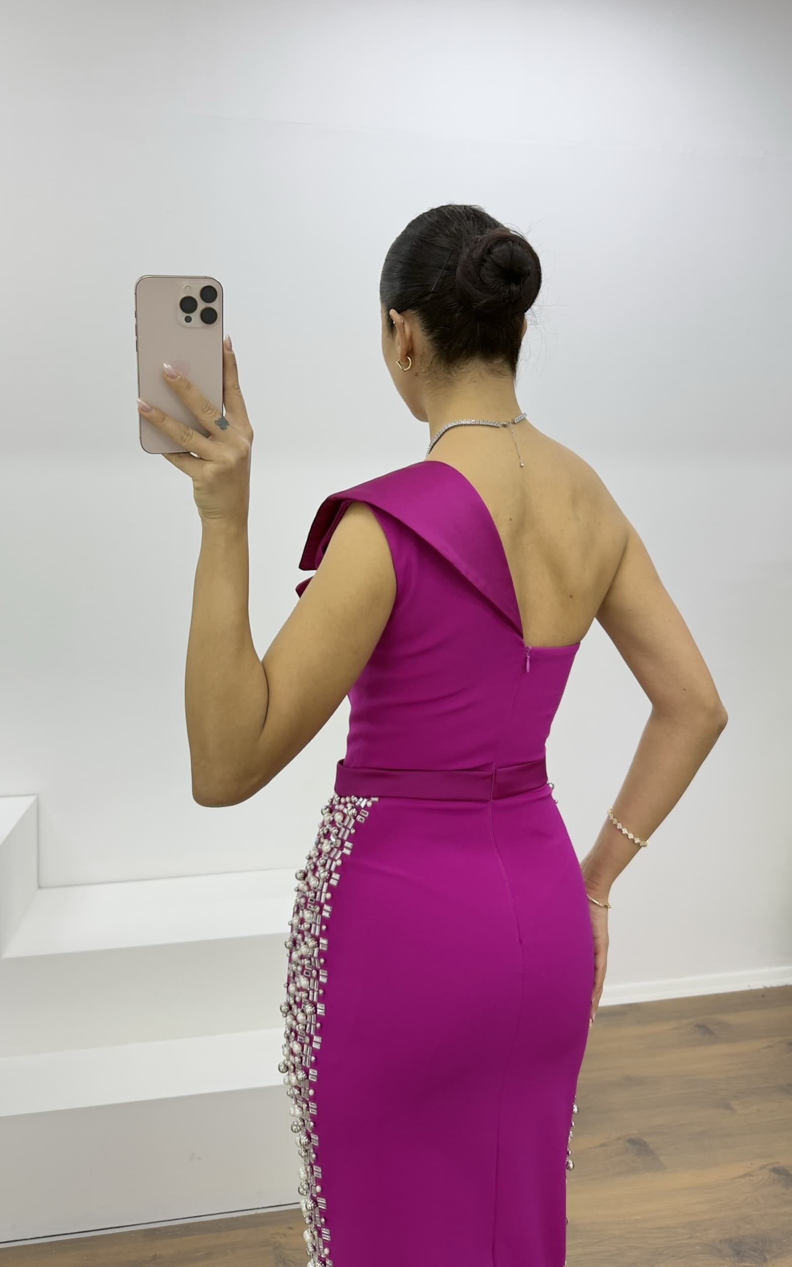 • Fuşya Kruvaze Yaka Taş İşlemeli Abiye Elbise