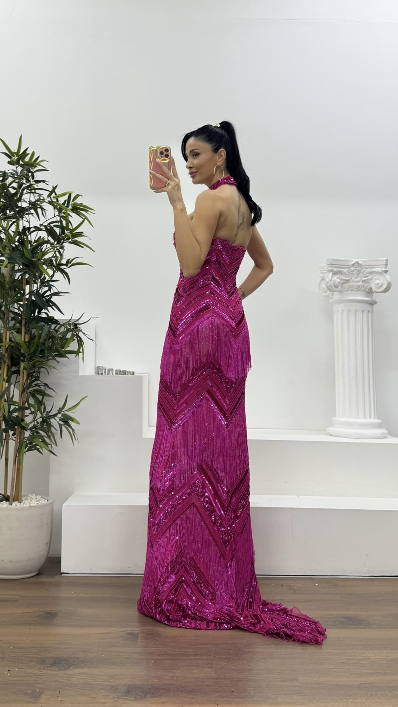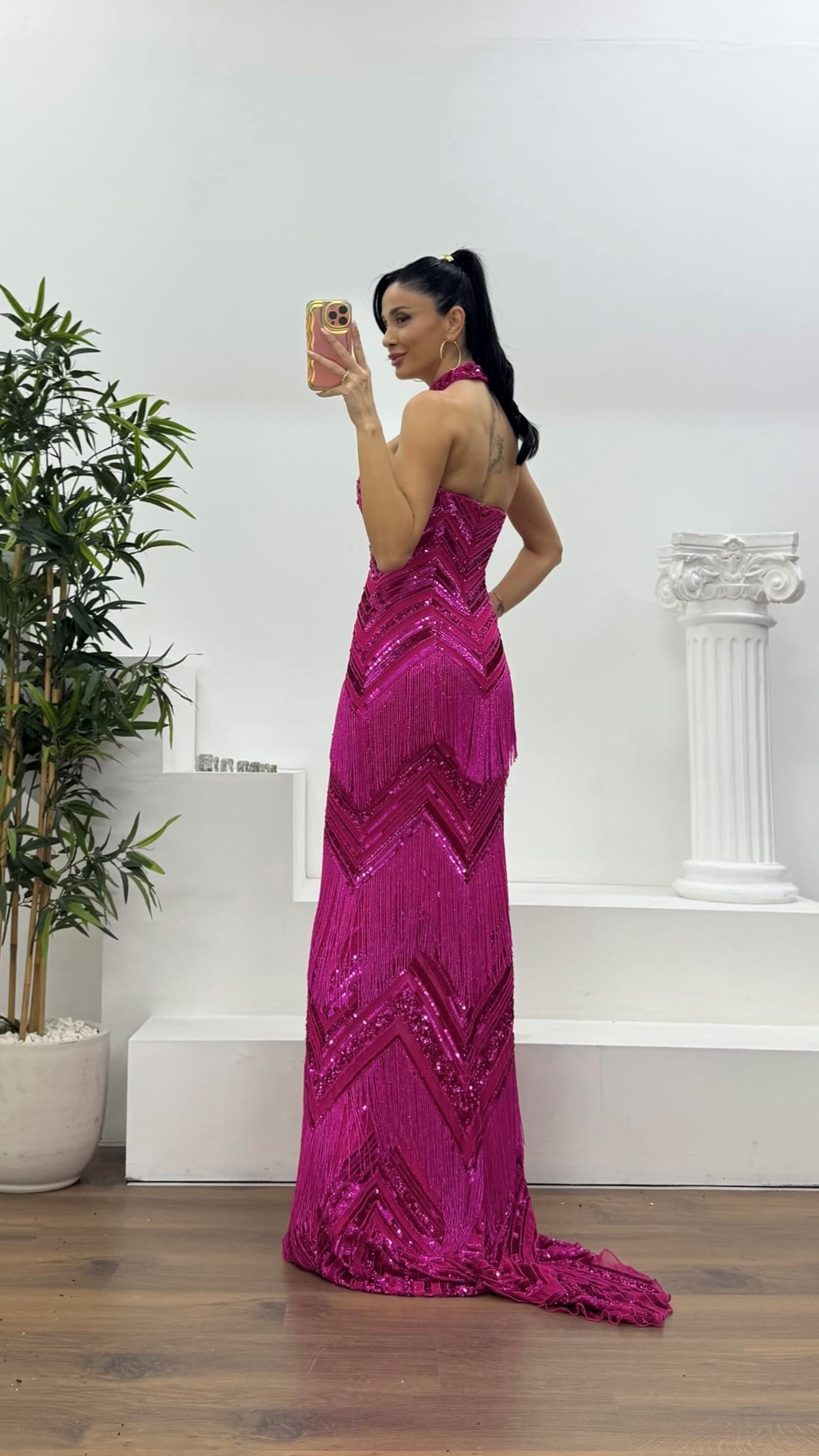 Fuşya Püskül Detaylı Boyundan Bağlamalı Abiye Elbise