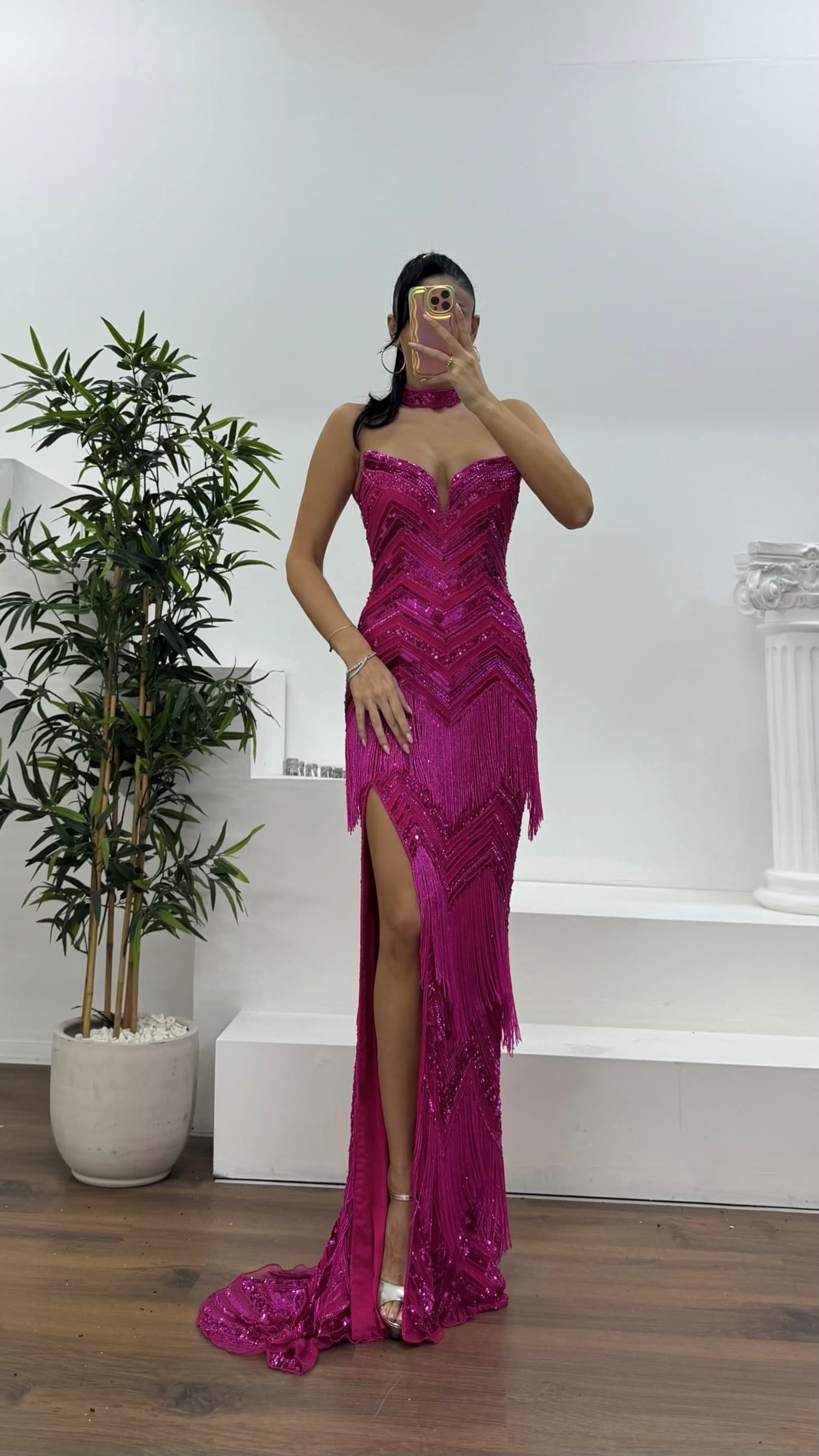 • Fuşya Püskül Detaylı Boyundan Bağlamalı Abiye Elbise