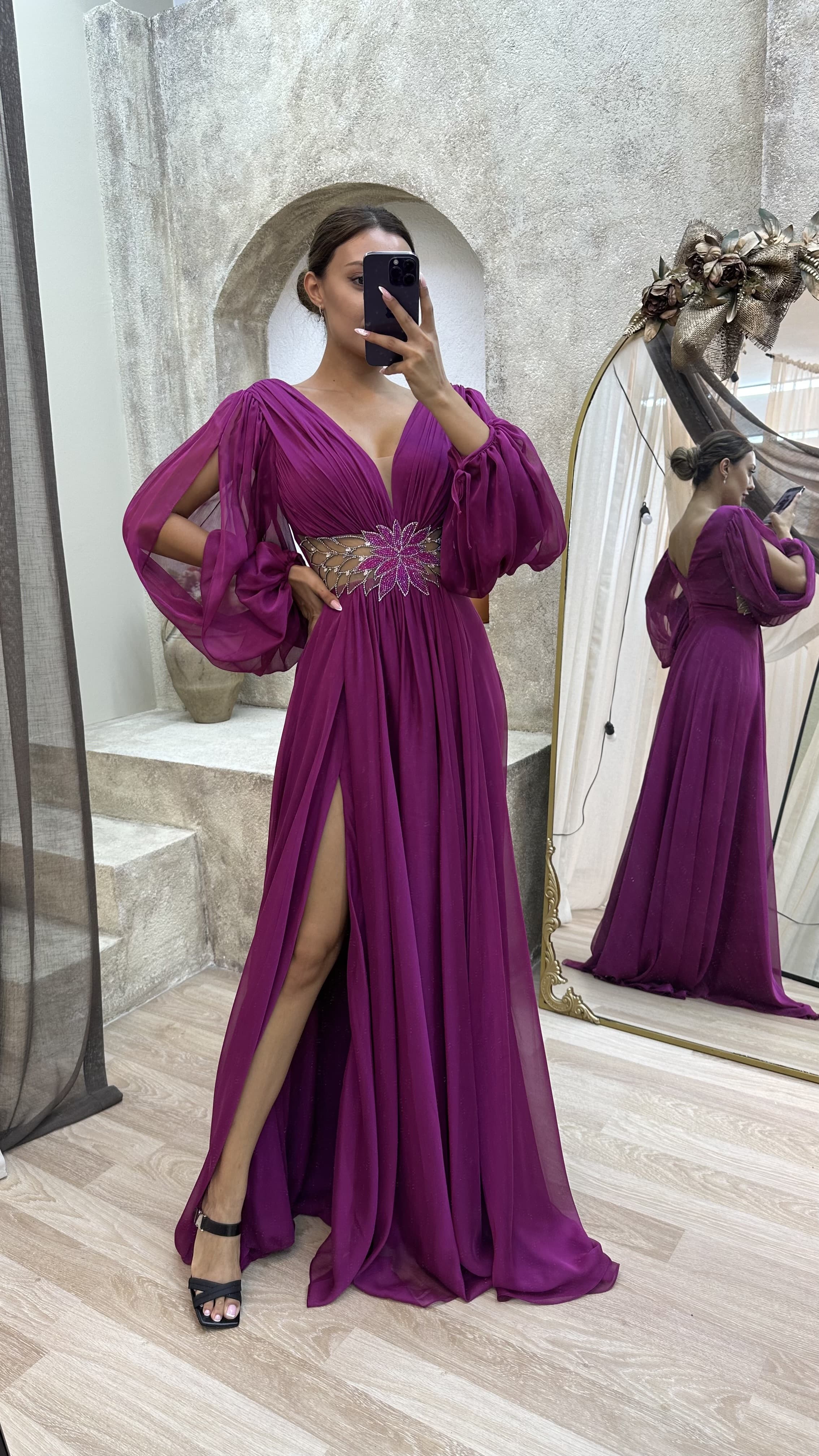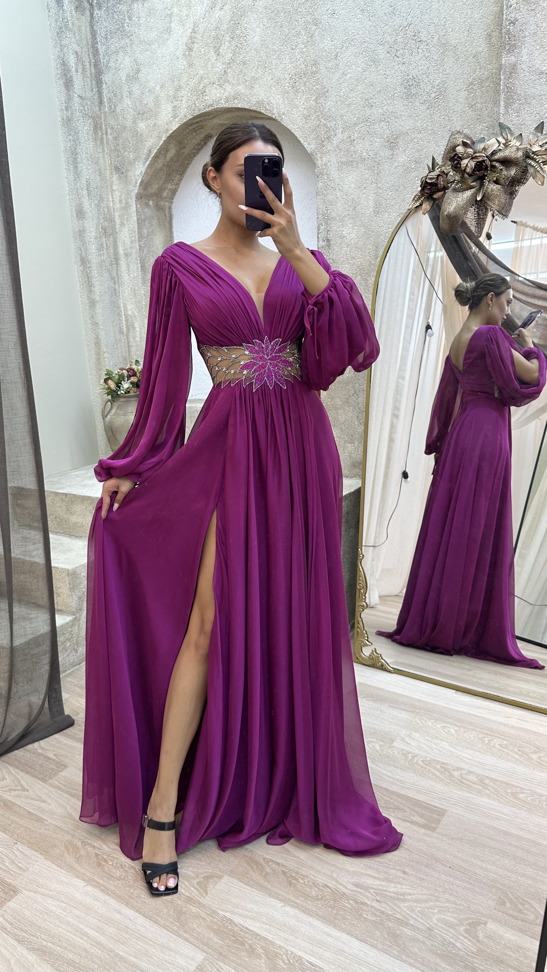 • Fuşya Sırt Detay Beli İşlemeli Şifon Abiye Elbise