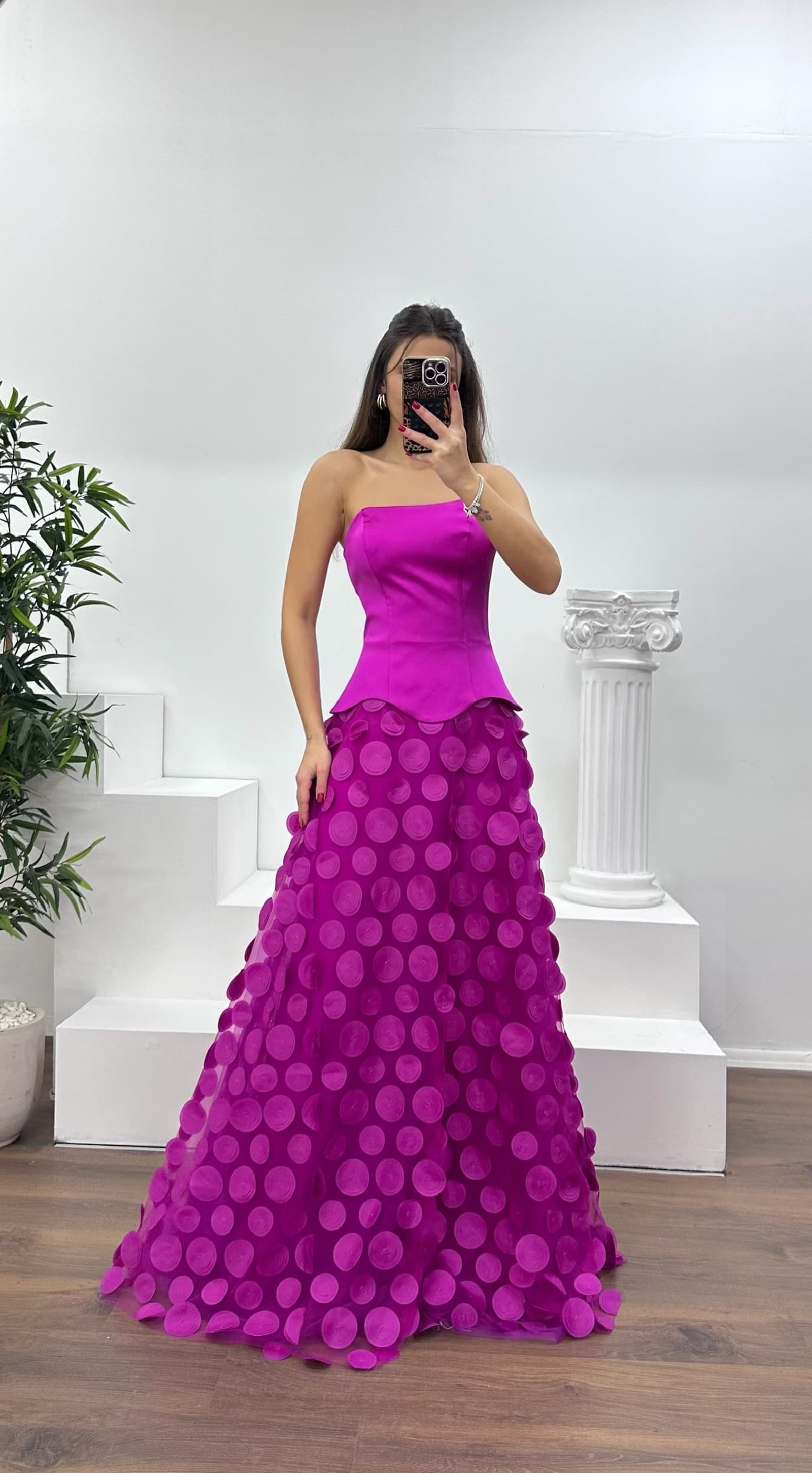 Fuşya Straplez Eteği 3D Baskılı Abiye Elbise