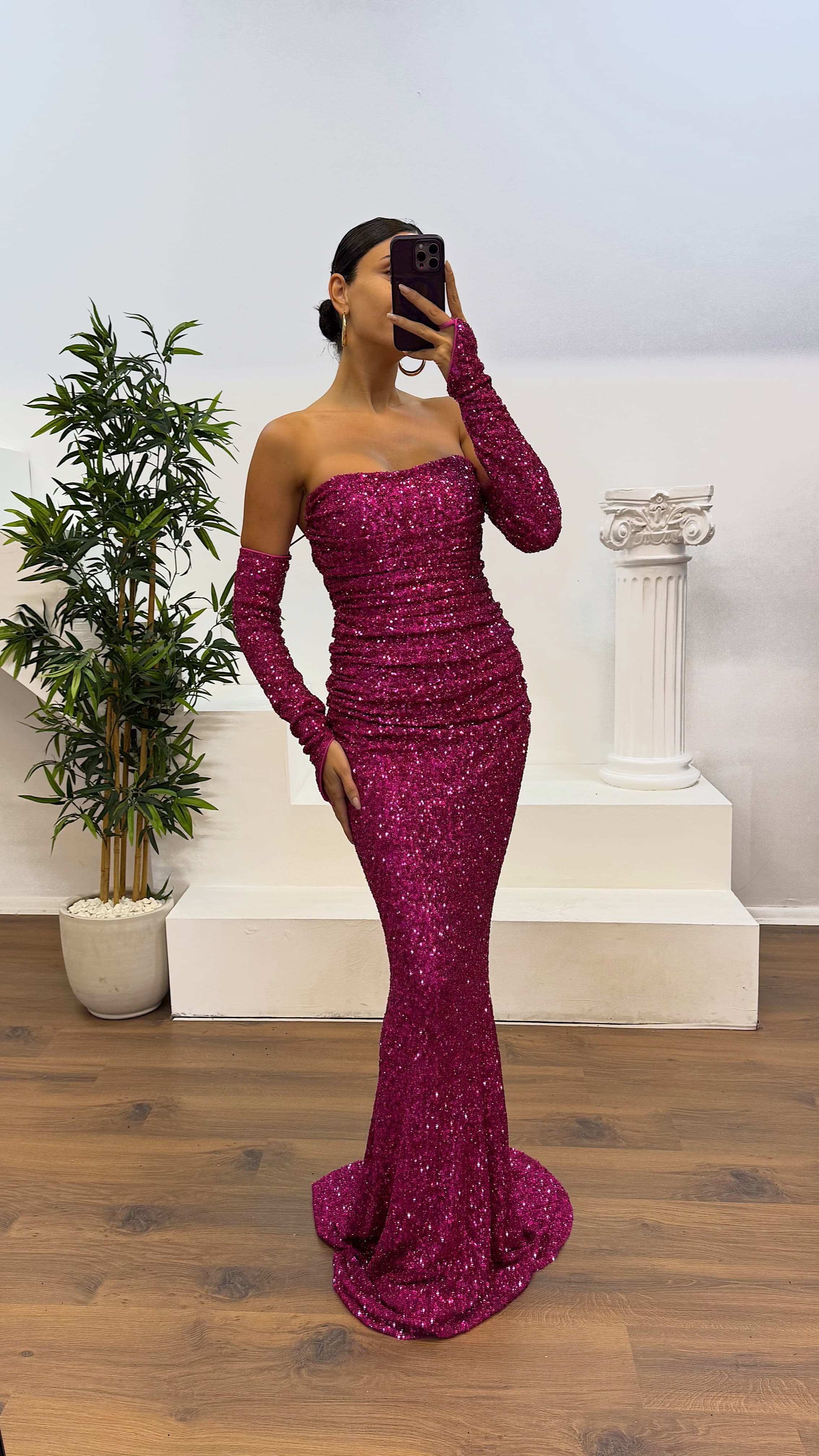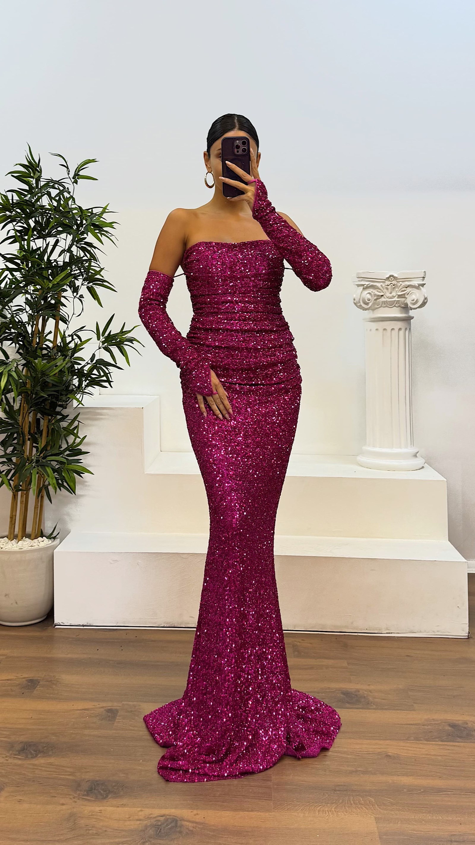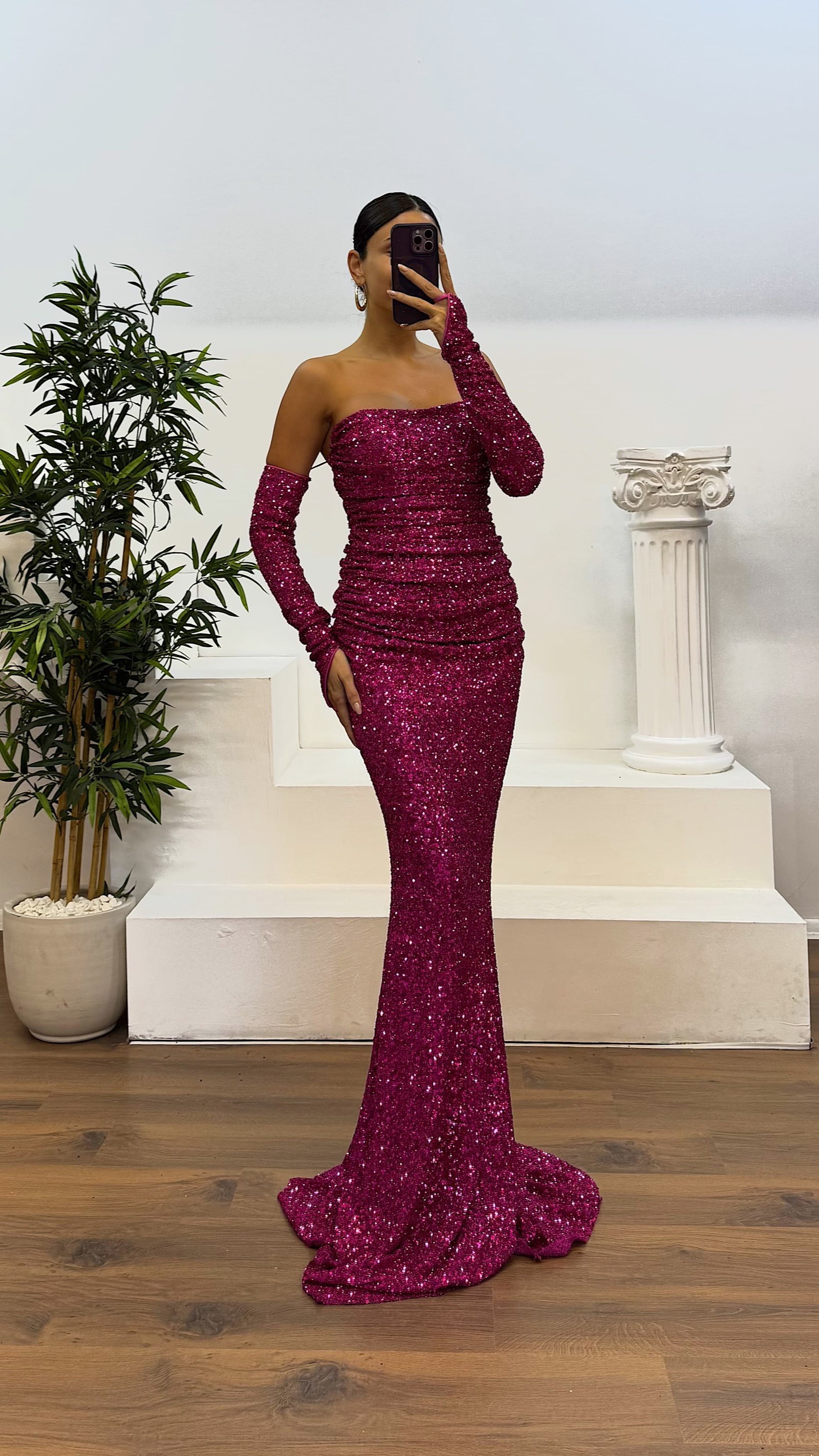 Ürün 36-44 bedene kadar uyumlu, göğüs pedli, astarlı, arka kapama fermuar, eldiven detay abiye olarak tasarlanmıştır.