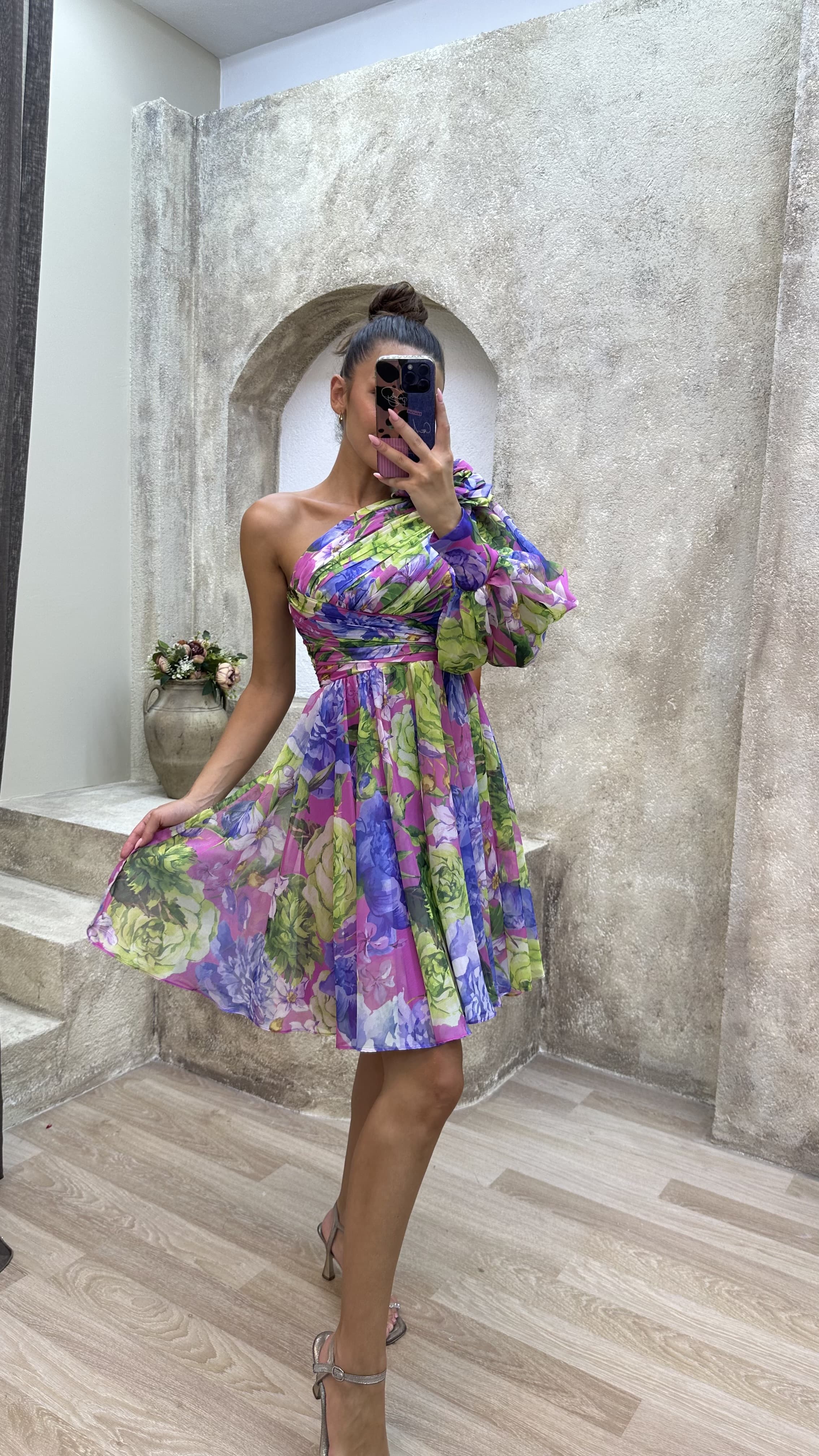 Fuşya Tek Kol Omuz Detay Çiçekli Mini Elbise