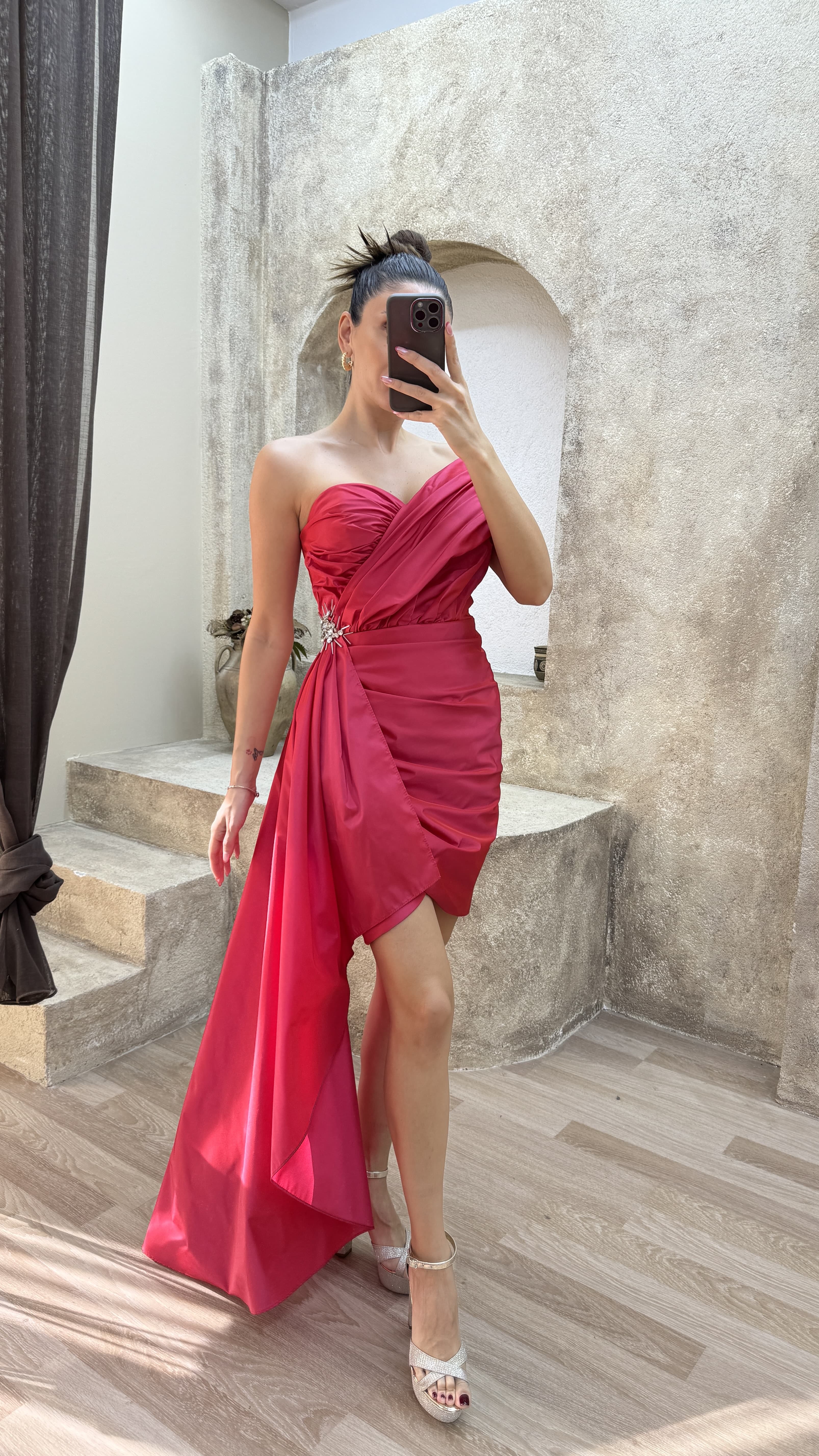 Fuşya Tek Omuz Bel Detay Tasarım Elbise