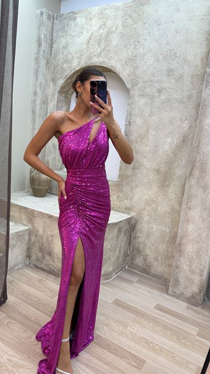 • Fuşya Tek Omuz Büzgülü Payet Elbise